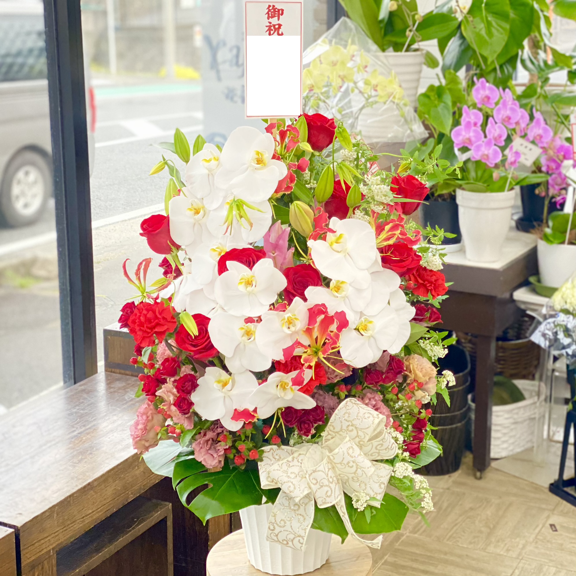 コチョウランを入れた白&赤系のアレンジメント。お祝いにふさわしい豪華で華やかな色合いですよ。特別な贈り物にいかがですか。【15時迄のご注文で翌日届きます】※こちらの商品についてのご相談、ご質問等ございましたら(メール)または(お電話)にて承ります。