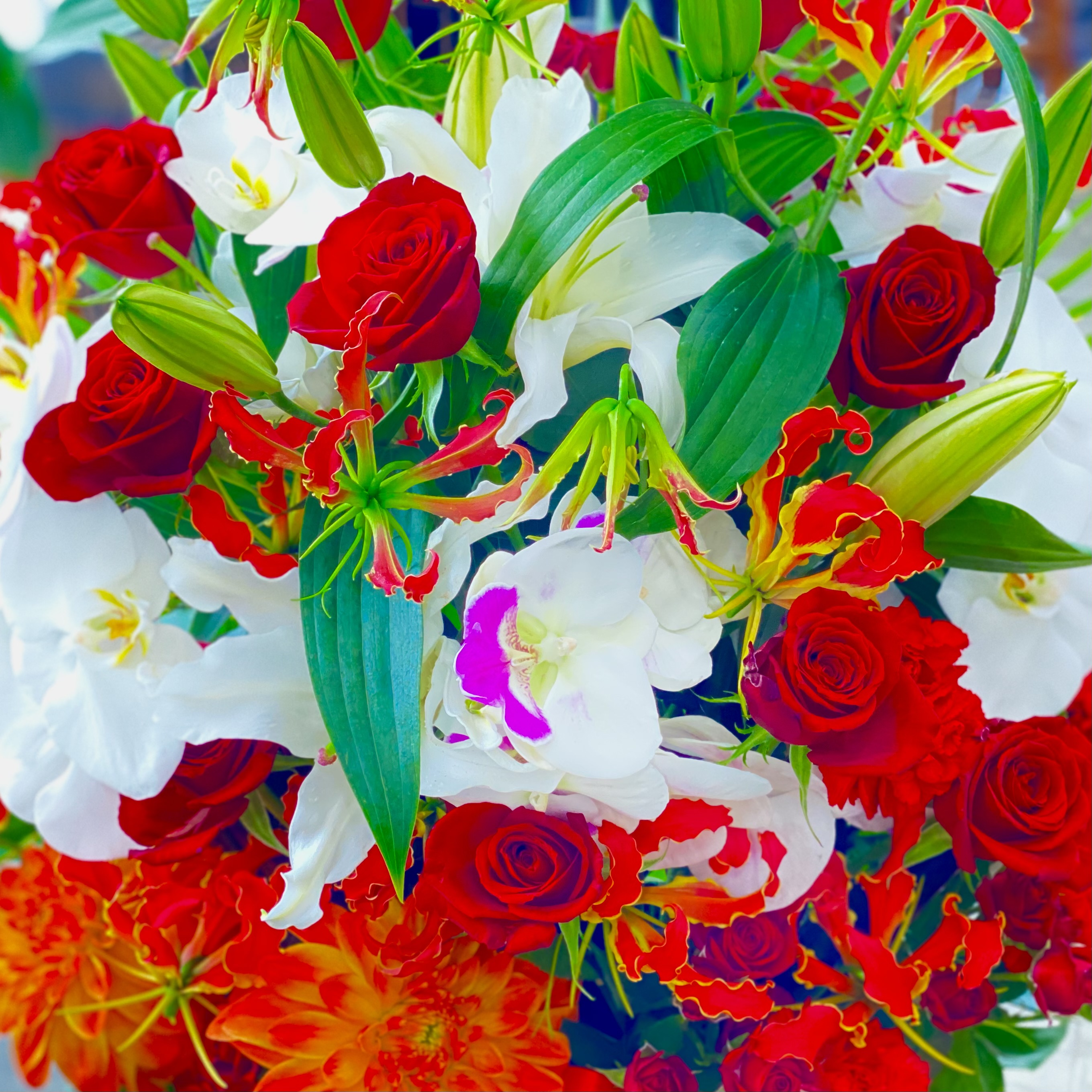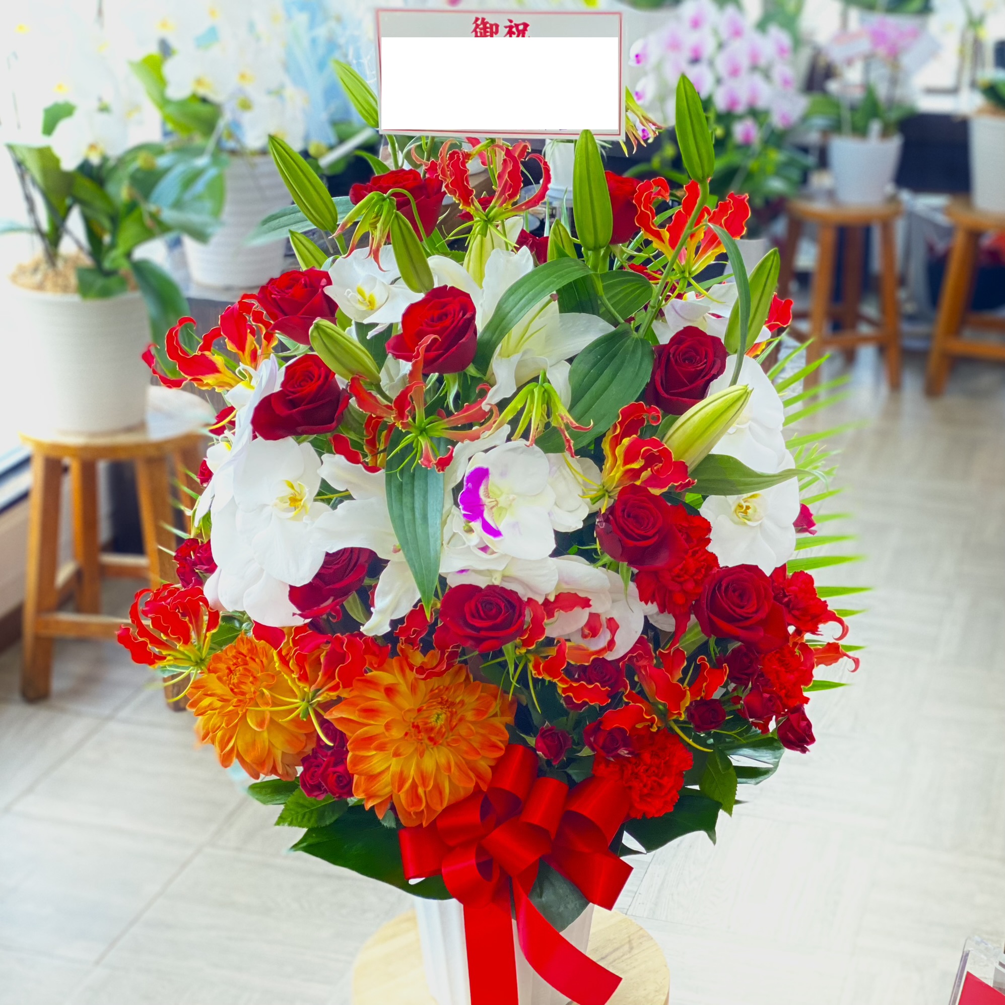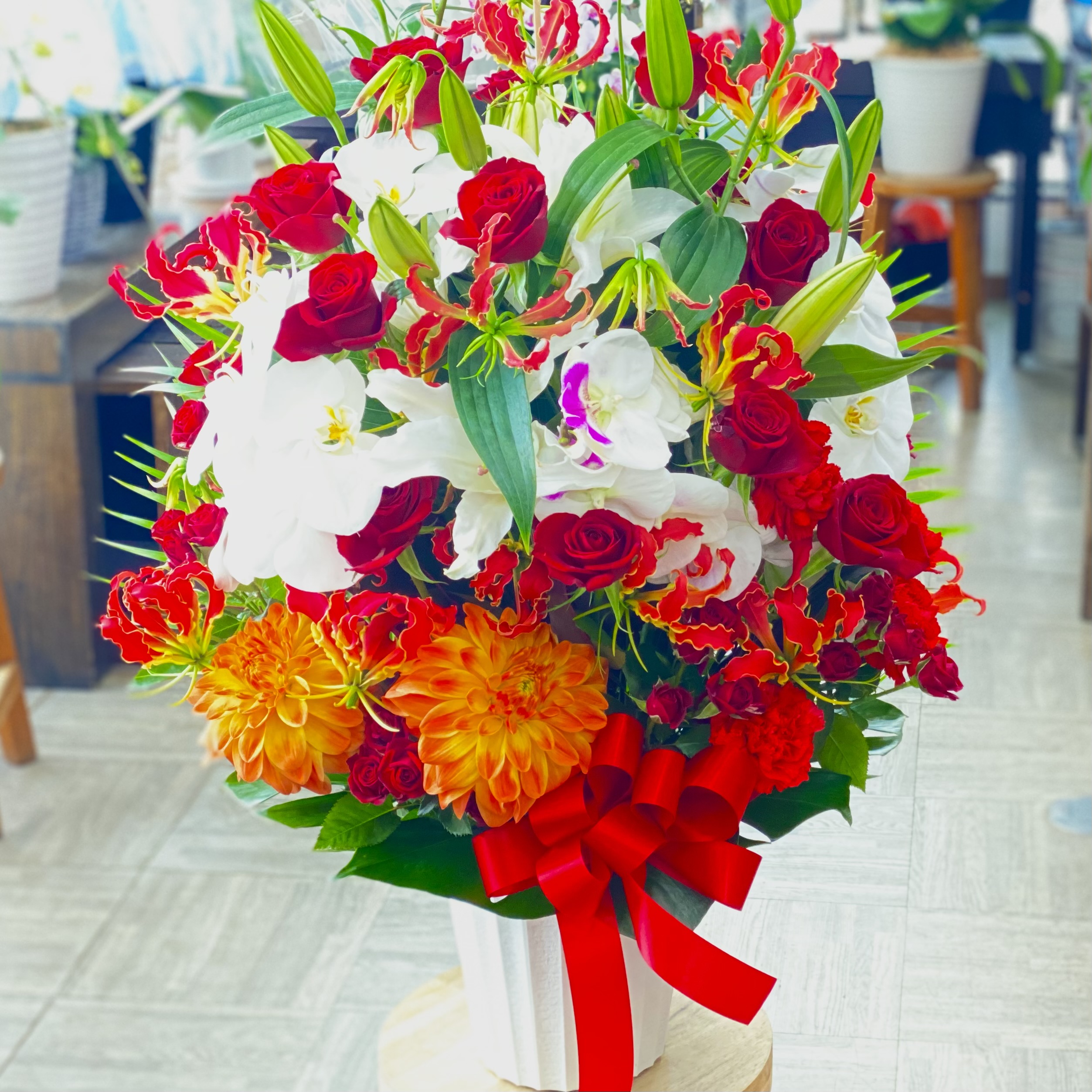 花材: メイン コチョウラン、ユリ、バラ、カーネーション、グロリオサ、ダリアなど その他 季節のお花、葉物類など