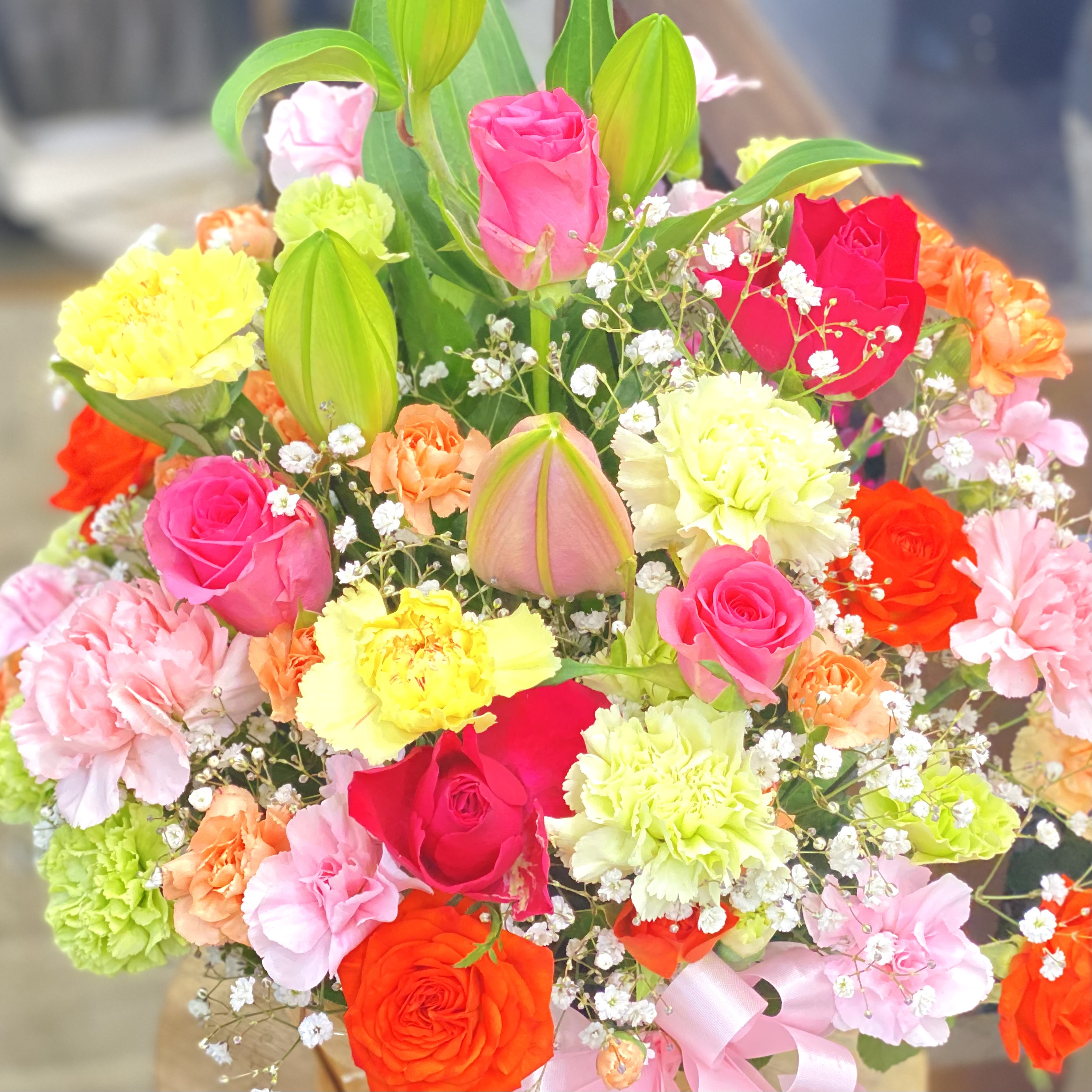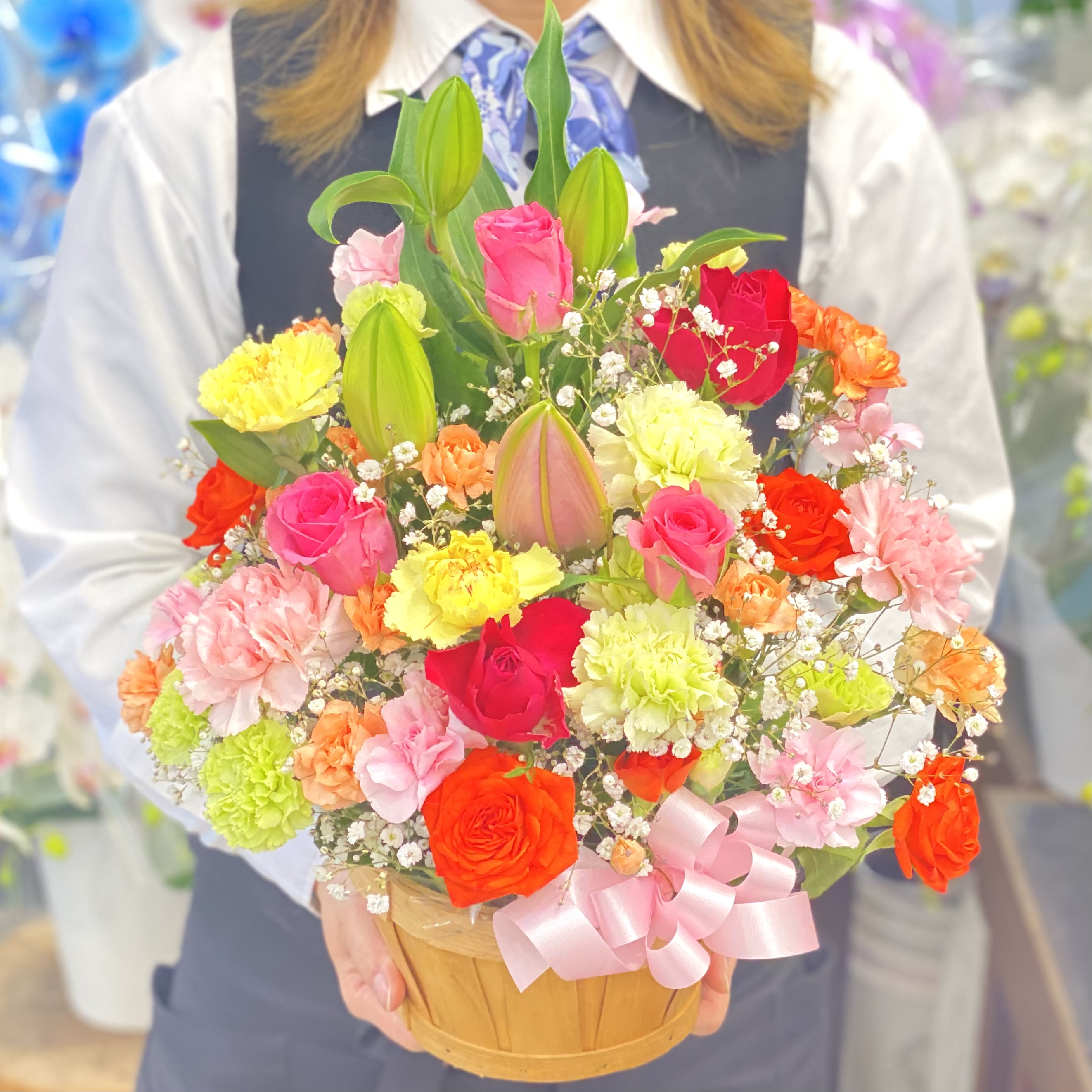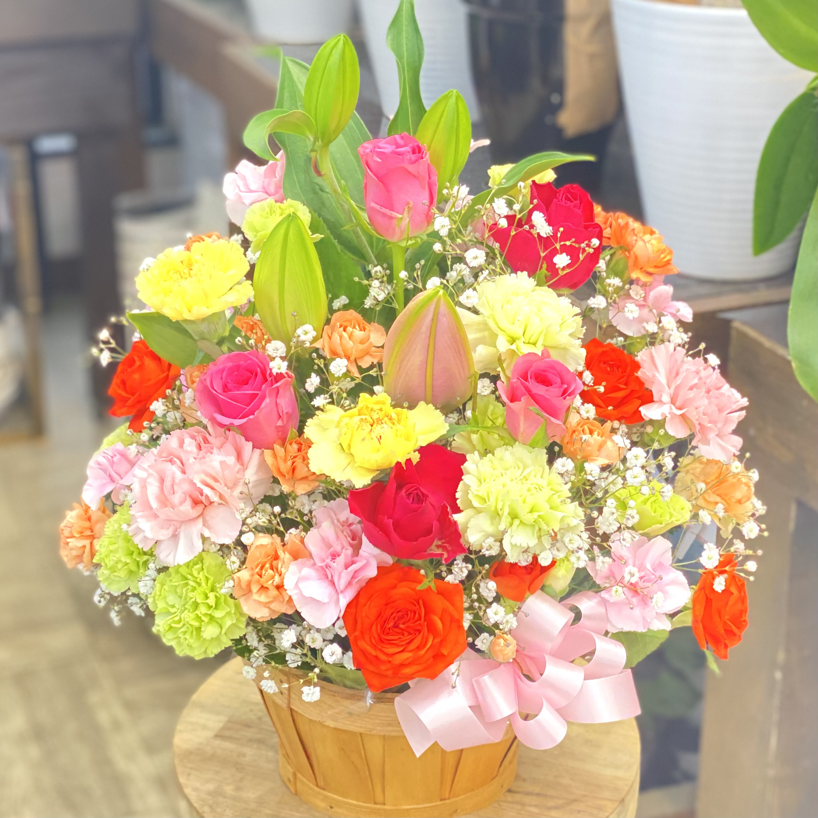 色とりどりのカーネーションを入れ明るく、ユリやバラをいれ華やかに、カスミソウでふんわり感を演出したアレンジメントです。また、ご利用されたお客様から「大変花持ちが良い」と好評をいただいております。静岡県長泉町から日本全国【真心】込めてお届けいたします。さまざまなご用途に贈る贈り物としてオススメです。大切な方へ贈るフラワーギフトやプレゼントなら「花樹園オンラインドットコム」に是非、お任せ下さいませ。