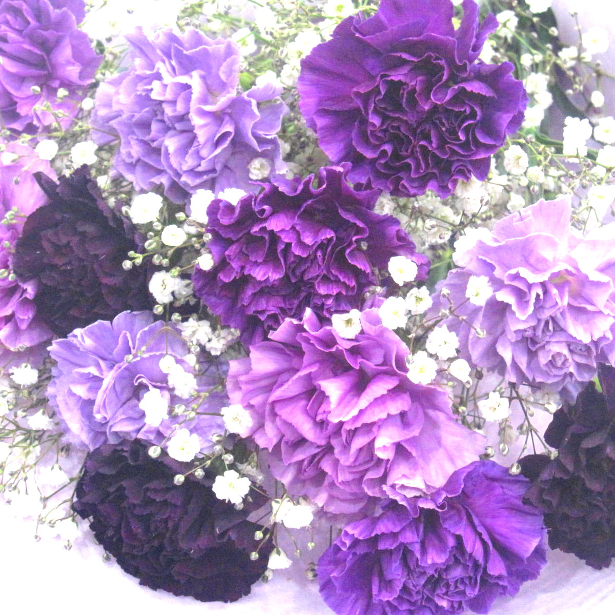 《ロングセラー》青紫色のカーネーション「ムーンダスト」12本とかすみ草を入れた花束です。本当に素敵な母の日のアイテム。毎年完売してしまいますのでご注文はお早めに。母の日だけしか出していない数量限定アイテムです。また、ご利用されたお客様から「大変花持ちが良い」と好評をいただいております。静岡県長泉町から日本全国【真心】込めてお届けいたします。母の日に贈る贈り物としてオススメです。大切な方へ贈るフラワーギフトやプレゼントなら「花樹園オンラインドットコム」に是非、お任せ下さいませ。