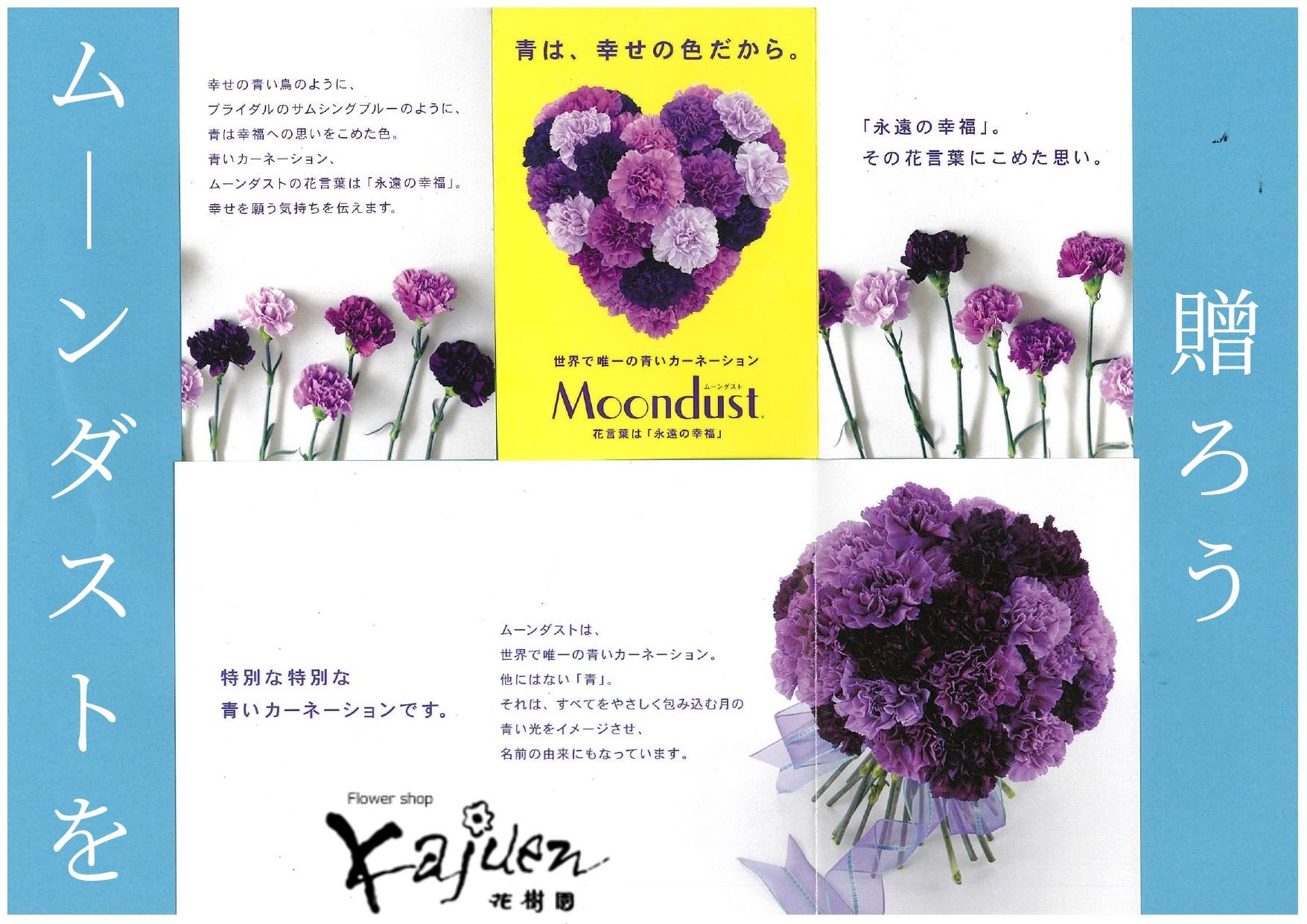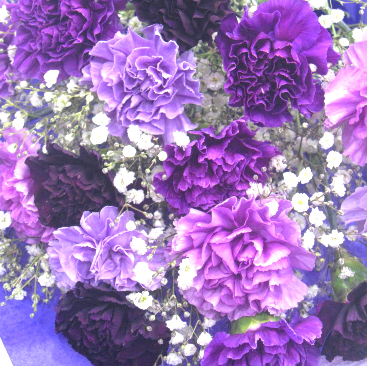 青紫色のカーネーション「ムーンダスト」16本とかすみ草を入れた花束です。本当に素敵な母の日のアイテム。毎年完売してしまいますのでご注文はお早めに。母の日だけしか出していない数量限定アイテムです。また、ご利用されたお客様から「大変花持ちが良い」と好評をいただいております。静岡県長泉町から日本全国【真心】込めてお届けいたします。母の日に贈る贈り物としてオススメです。大切な方へ贈るフラワーギフトやプレゼントなら「花樹園オンラインドットコム」に是非、お任せ下さいませ。