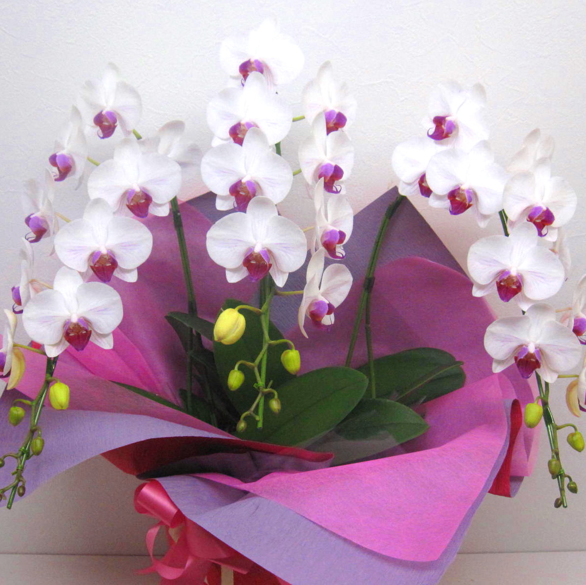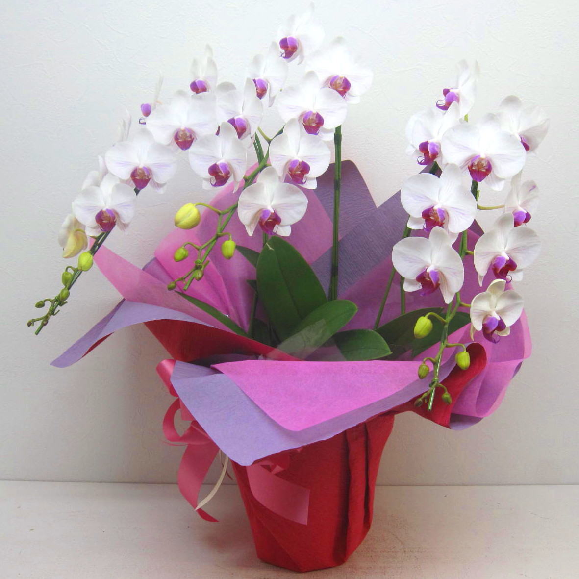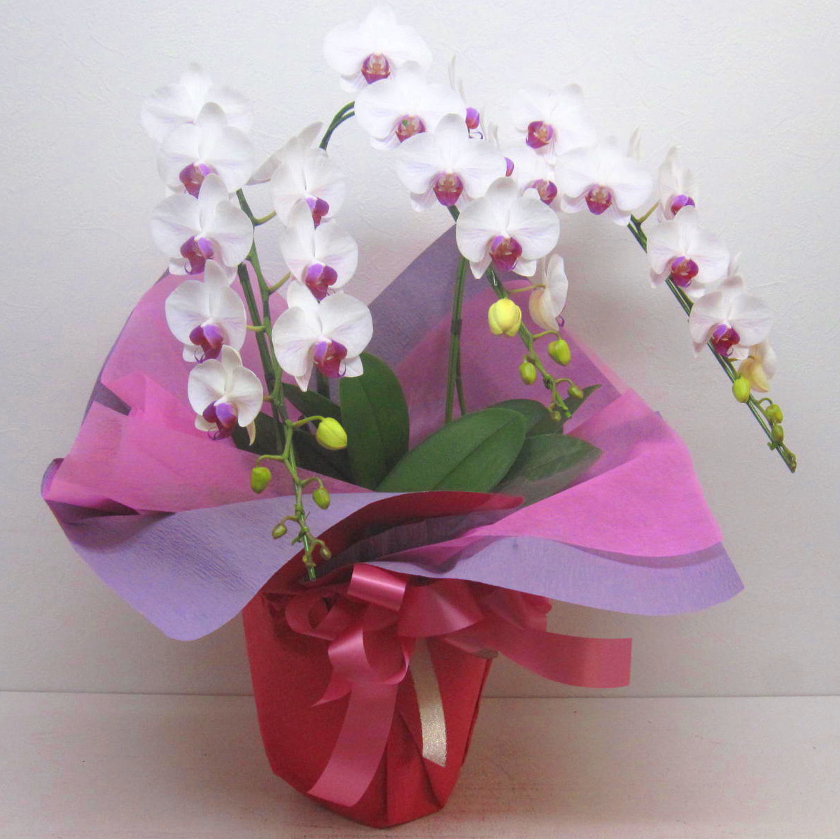 とても上品な紅白の胡蝶蘭です。1本にツボミまで含めると15輪以上お花が付いていて、それが3本ですからとっても華やかに見えますよ。御祝系のさまざまな用途に適した贈り物です。また、ご購入されたお客様から「大変花持ちが良い」と高い評価を頂いております。静岡県長泉町から日本全国【真心】込めてお届けいたします。さまざまなお祝い用途に贈る贈り物としてオススメです。大切な方へ贈るフラワーギフトやプレゼントなら「花樹園オンラインドットコム」に是非、お任せ下さいませ。