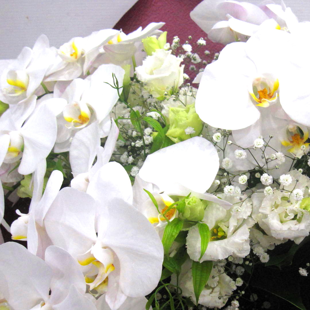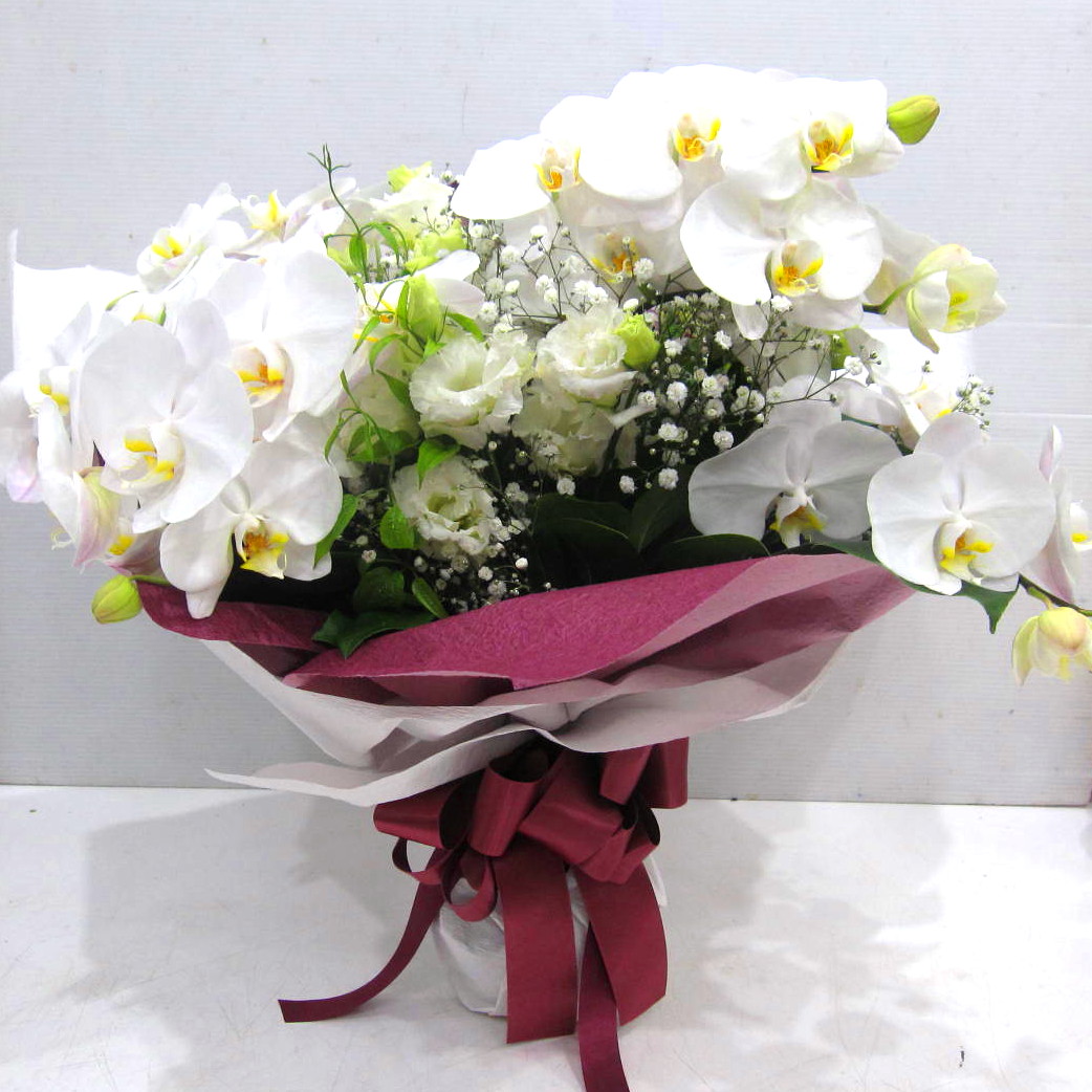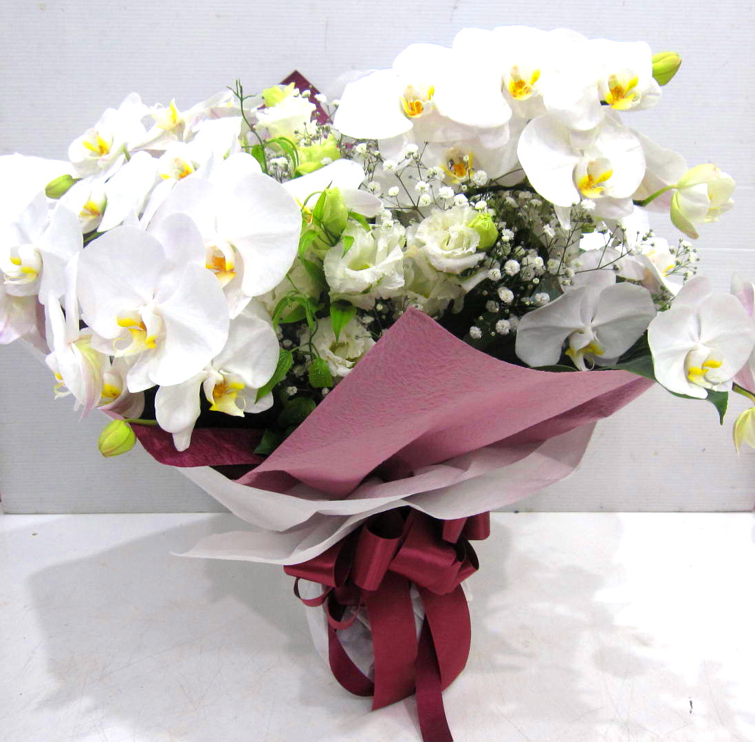 高級花「コチョウラン」を主体とした花束。上品でお洒落にラッピング致します。【15時迄のご注文で翌日届きます】※こちらの商品についてのご相談、ご質問等ございましたら(メール)または(お電話)にて承ります。