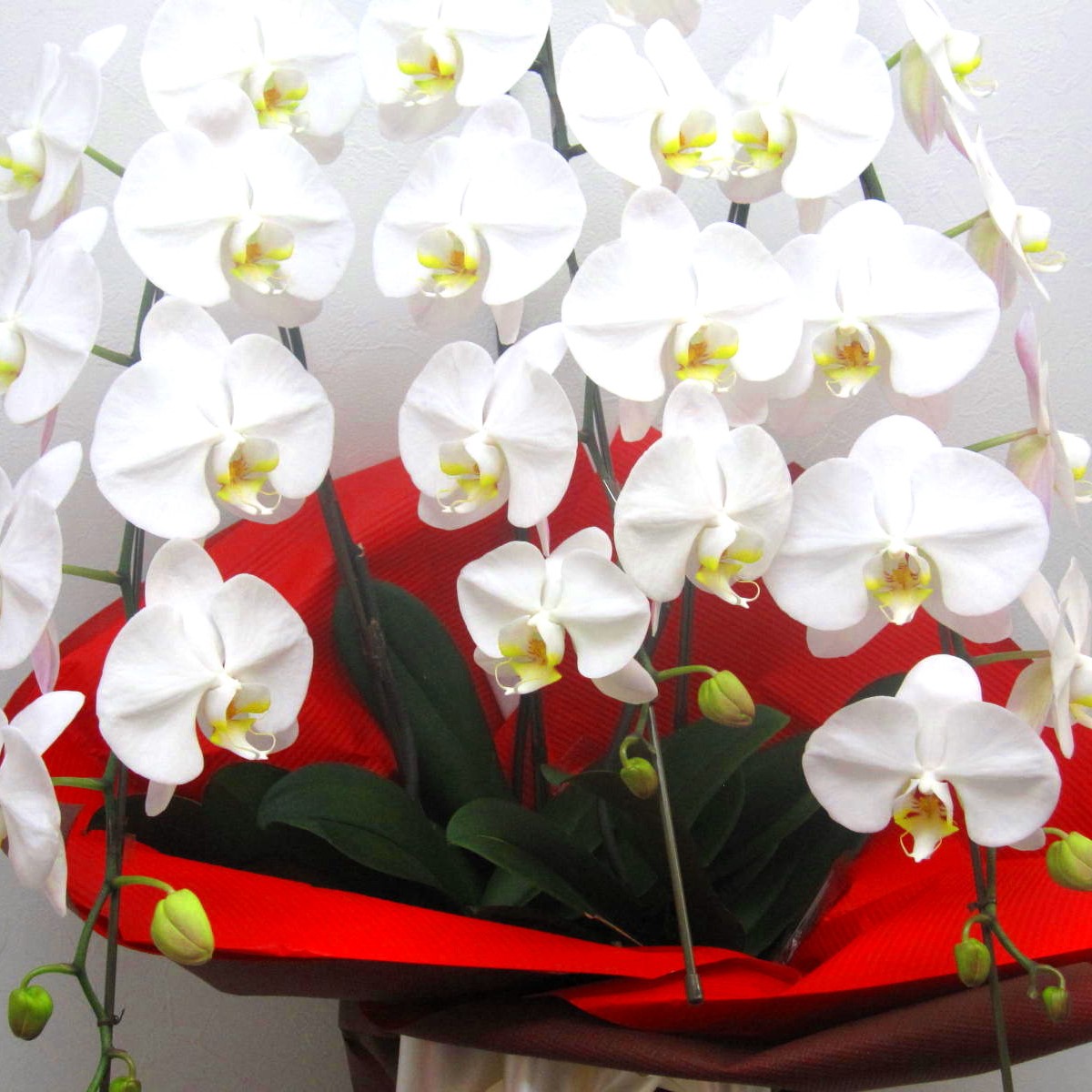 市場で厳選した高品質の生産者が仕立てるスタンダードな3本立ち大輪胡蝶蘭です。茶&赤色でカッコよくラッピング致します。【15時迄のご注文で翌日届きます】【メッセージカードやお名札も(無料)】でお付け致します※こちらの商品についてのご相談、ご質問等ございましたら(メール)または(お電話)にて承ります。