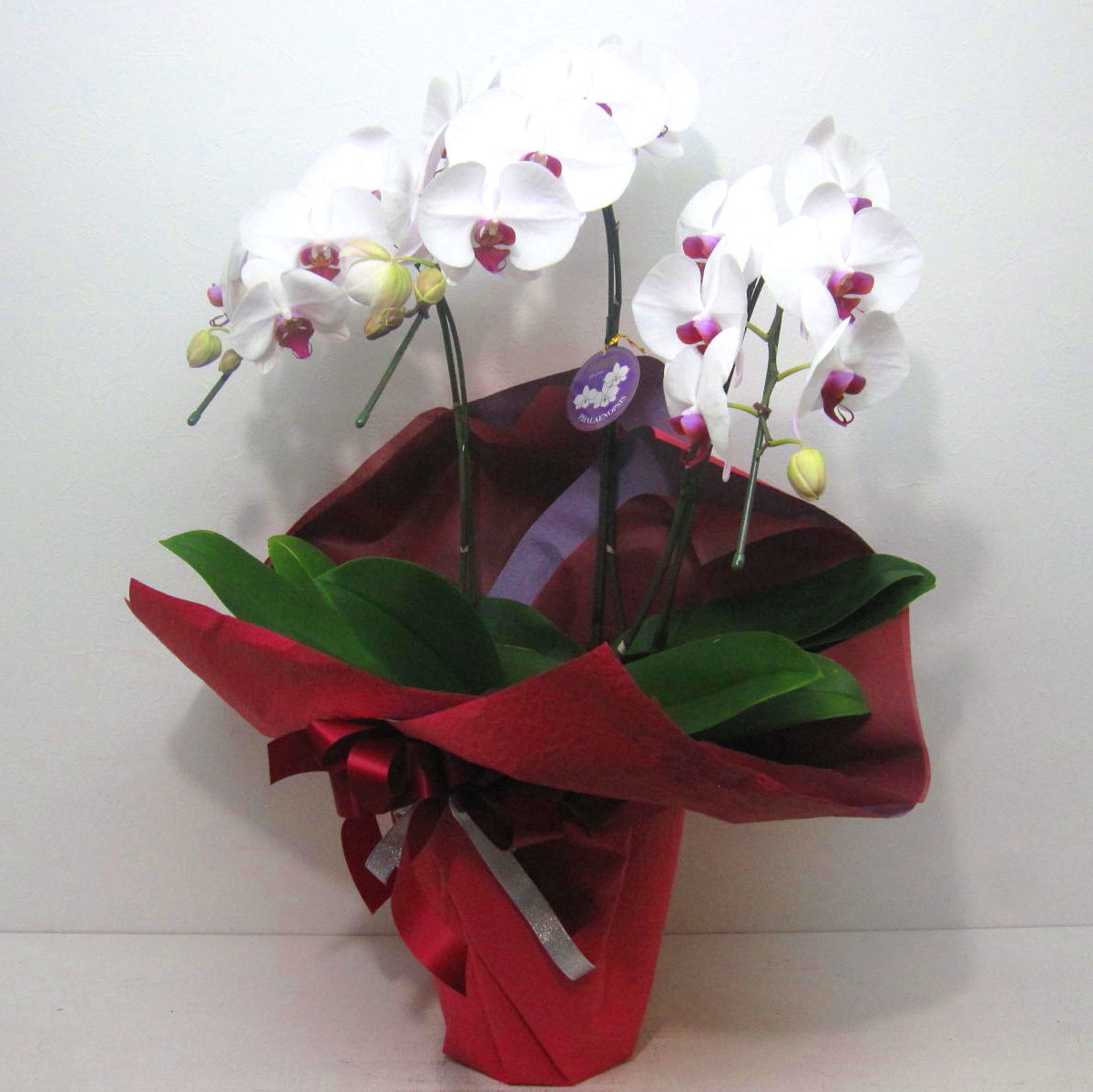 花材: メイン 胡蝶蘭【大輪白赤(3本立ち)】 その他 贈答用に綺麗に美しくラッピング致します。