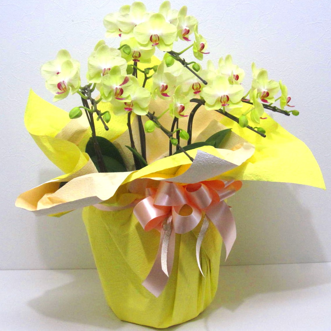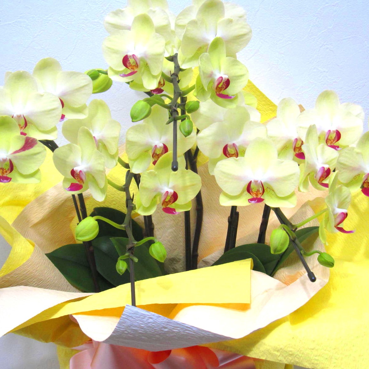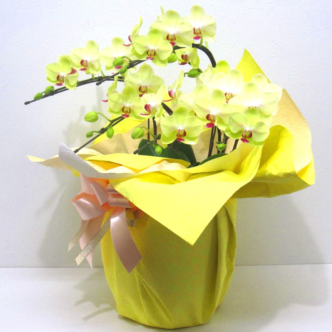 中輪系の明るい黄色の胡蝶蘭です。お花はだいたい40輪以上お花が付いています。大きさはほどほどに大きいサイズです。お部屋にあるだけで明るくなります。もちろん花持ちも抜群です。蘭好きな大切な方に、言葉では照れくさい想いをきっと届けてくれる胡蝶蘭です。お誕生日、御祝や開店・開業祝い、展示会などさまざまな贈り物に。後払い決済&クレジット決済可能です。その他、わからないことやご相談等ございましたらお気軽にお問合せ下さい。