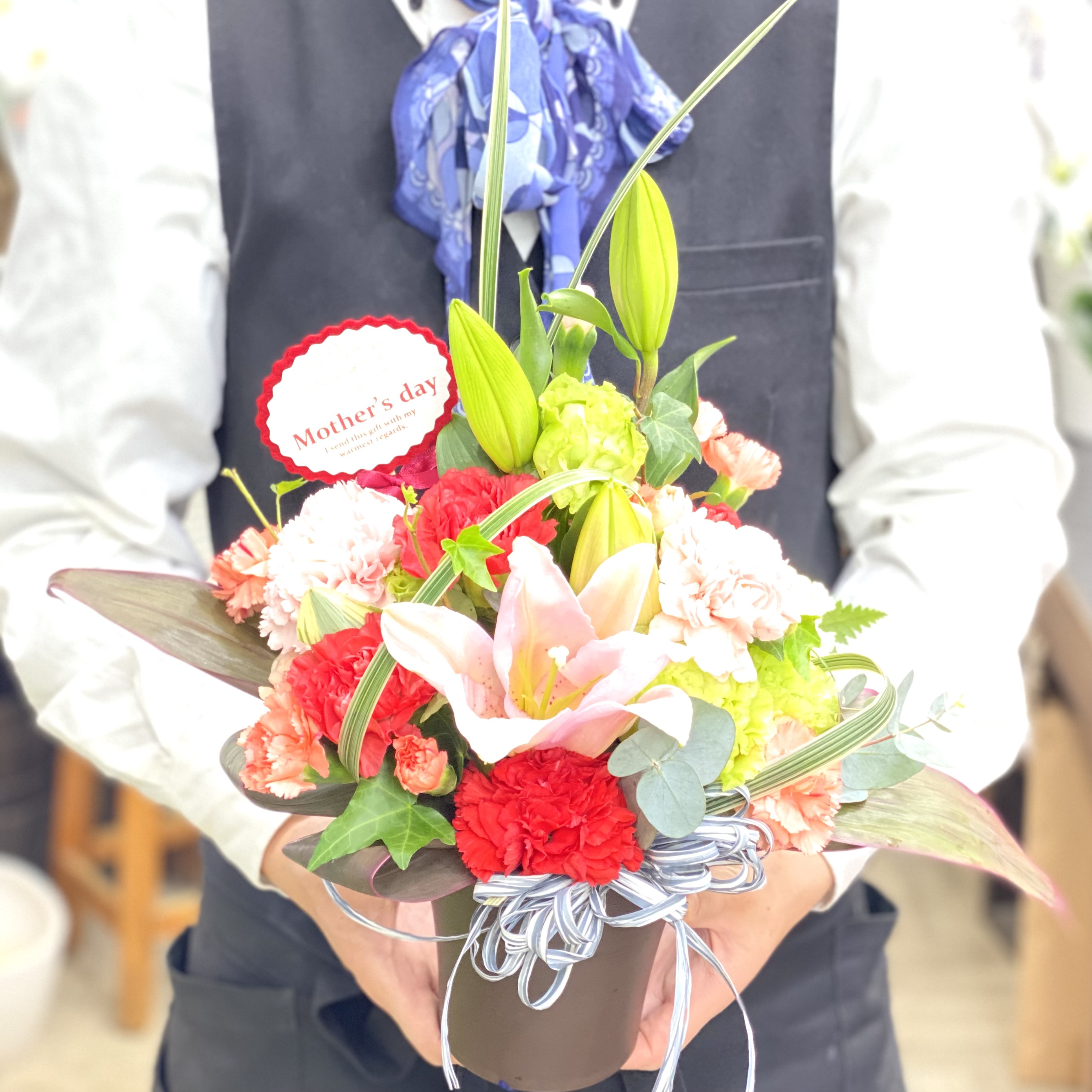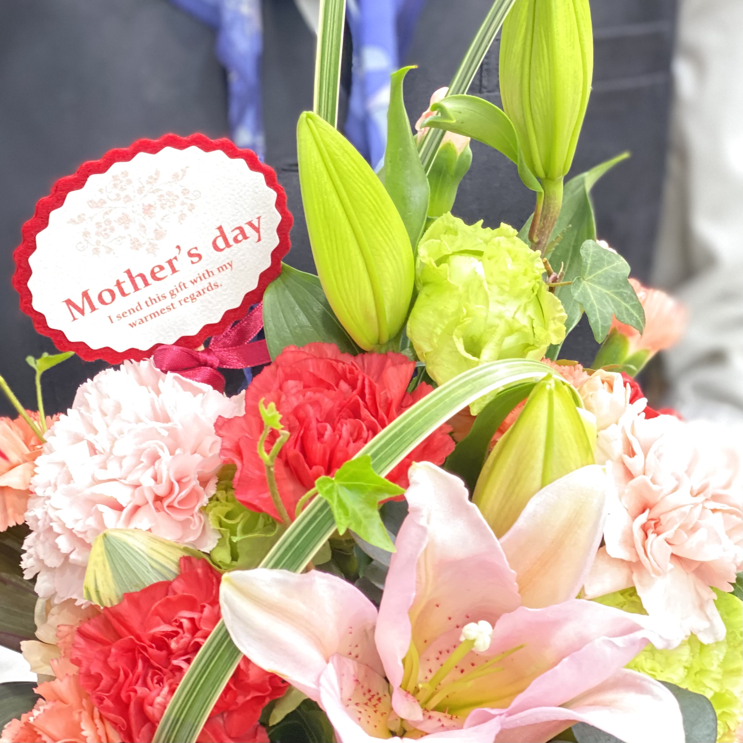 母の日におすすめのアレンジメントです。ピンクユリとカーネーションを中心にお洒落な雰囲気に制作しました。また、ご利用されたお客様から「大変花持ちが良い」と好評をいただいております。静岡県長泉町から日本全国【真心】込めてお届けいたします。母の日に贈る贈り物としてオススメです。大切な方へ贈るフラワーギフトやプレゼントなら「花樹園オンラインドットコム」に是非、お任せ下さいませ。