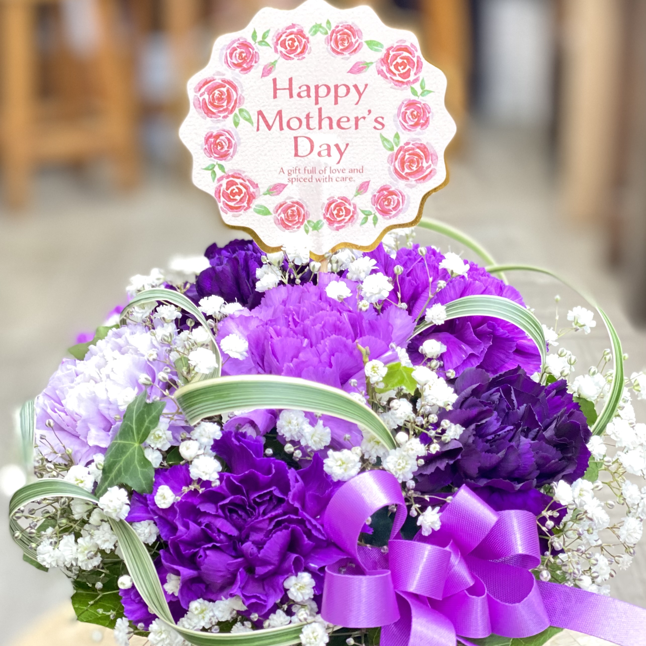 青紫色のカーネーション「ムーンダスト」を入れた大人っぽいアレンジメントです。本当に素敵な母の日のアイテム。毎年完売してしまいますのでご注文はお早めに。母の日だけしか出していない数量限定アイテムです。また、ご利用されたお客様から「大変花持ちが良い」と好評をいただいております。静岡県長泉町から日本全国【真心】込めてお届けいたします。母の日に贈る贈り物としてオススメです。大切な方へ贈るフラワーギフトやプレゼントなら「花樹園オンラインドットコム」に是非、お任せ下さいませ。