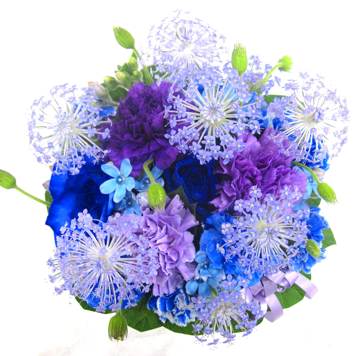 花材: メイン 「オリジナル染色」青いバラ、青いカーネーション、カーネーション「ムーンダスト」、季節の小花など その他 葉物類など ※花材の入荷状況によってはメイン花材以外のお花が変わる可能性がございますが、色合いや雰囲気に注意して制作致します。ご安心ください。