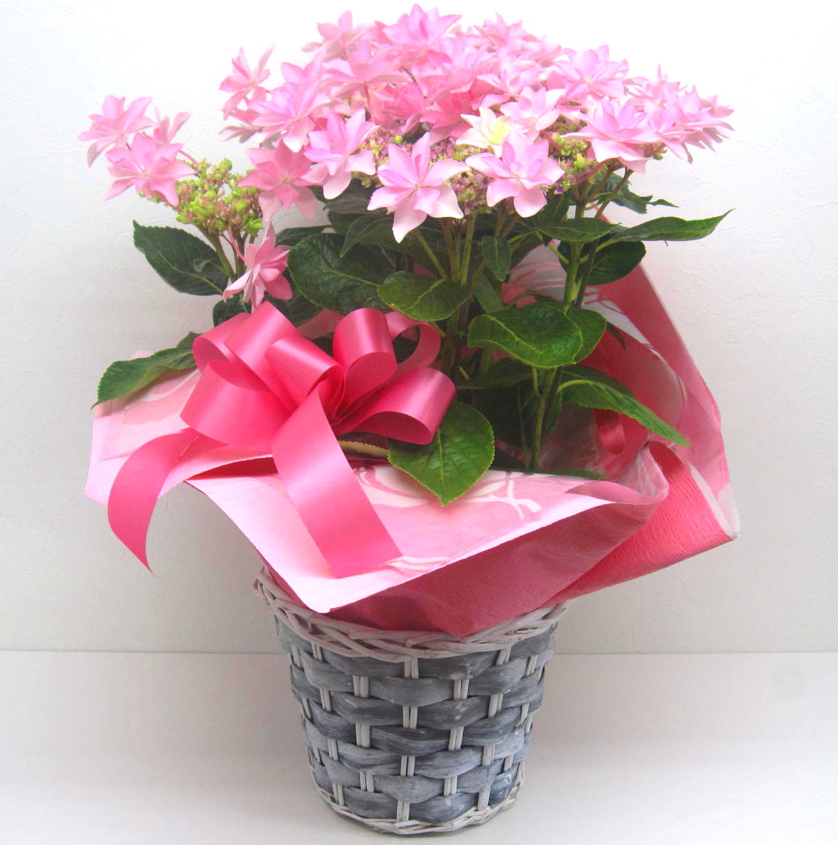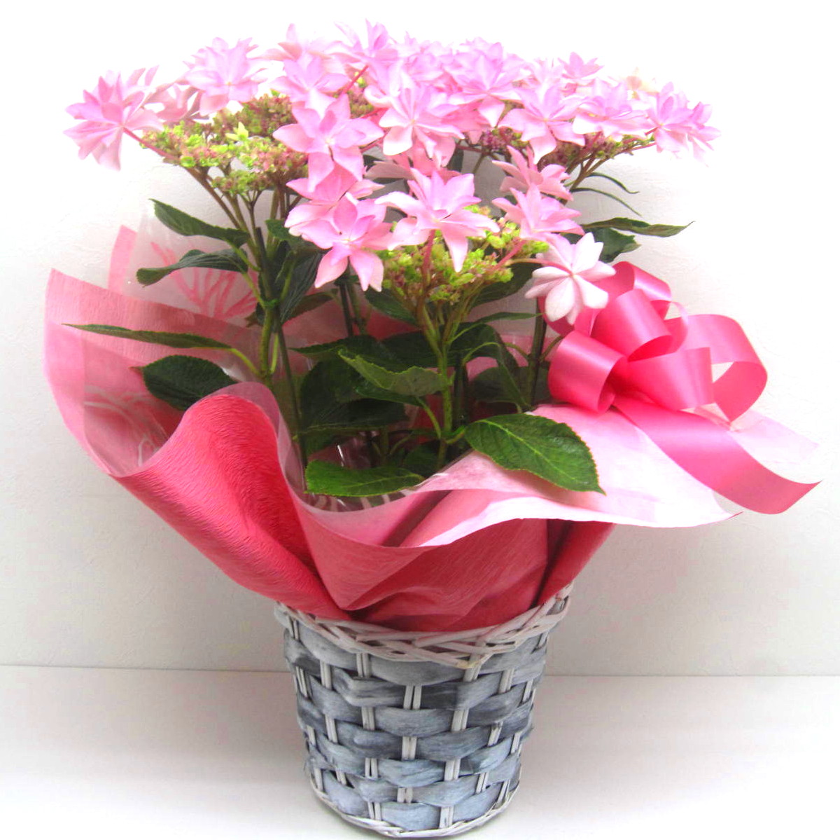 母の日にぴったりな珍しい☆咲きのピンク色のアジサイ鉢です。来年も咲かせやすく、しかもバスケット付きです。【15時迄のご注文で翌日届きます】※こちらの商品についてのご相談、ご質問等ございましたら(メール)または(お電話)にて承ります。