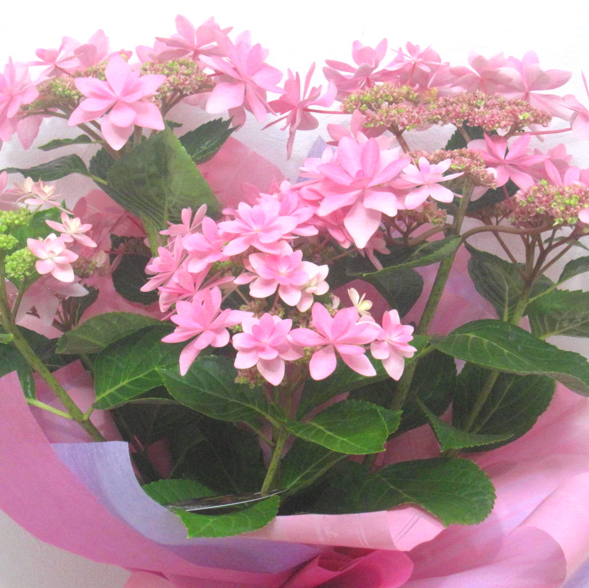 珍しい星咲きアジサイです。上品に明るくラッピング致します。お花が大きくて約4~5本お花が付いています。ボリューム感ありますよ。また、持ちの良いお花を中心に使っておりますので花持ちも良いでしょう。ご購入されたお客様から高い評価を頂いております。静岡県長泉町から日本全国【真心】込めてお届けいたします。さまざまなご用途に贈る贈り物としてオススメです。大切な方へ贈るフラワーギフトやプレゼントなら「花樹園オンラインドットコム」に是非、お任せ下さいませ。