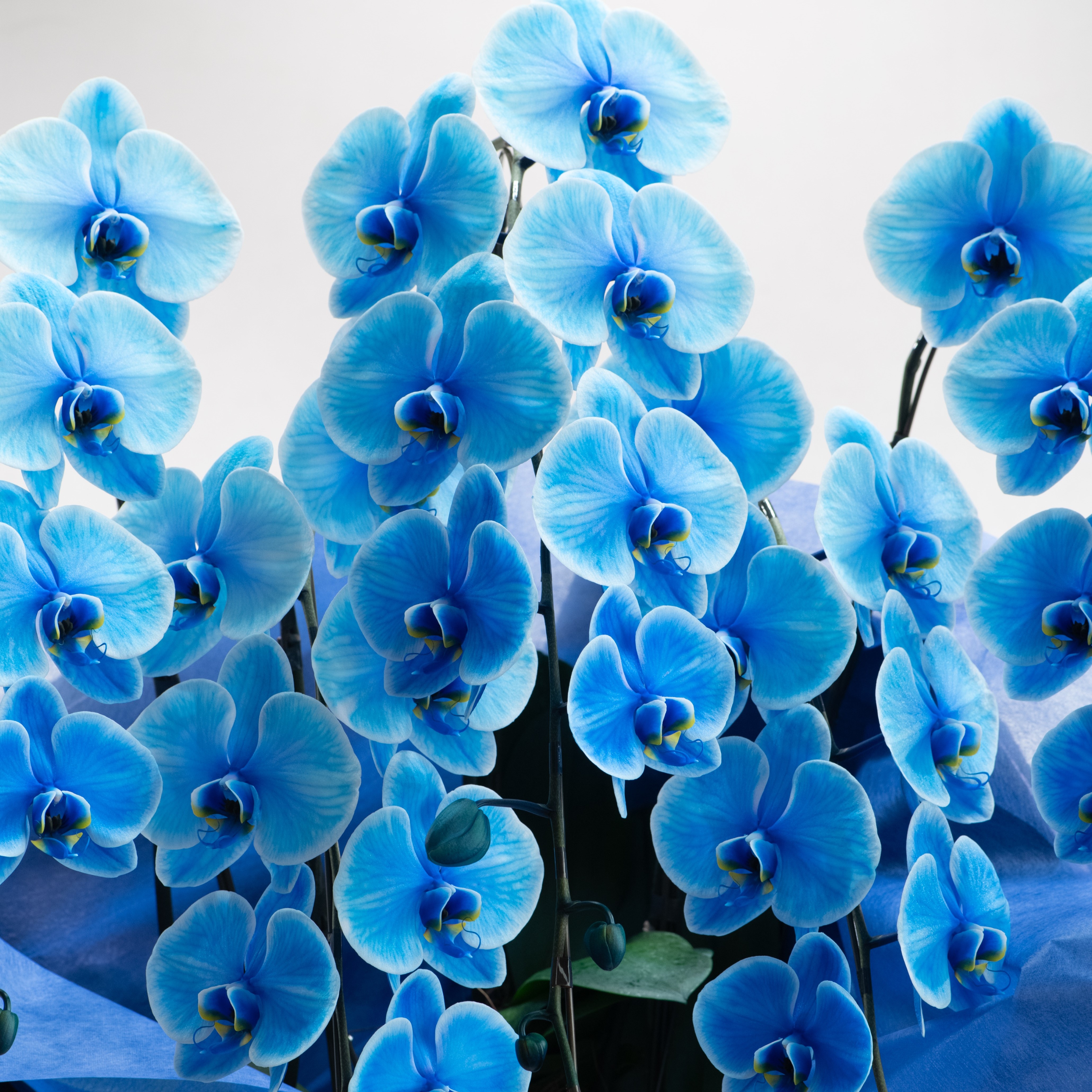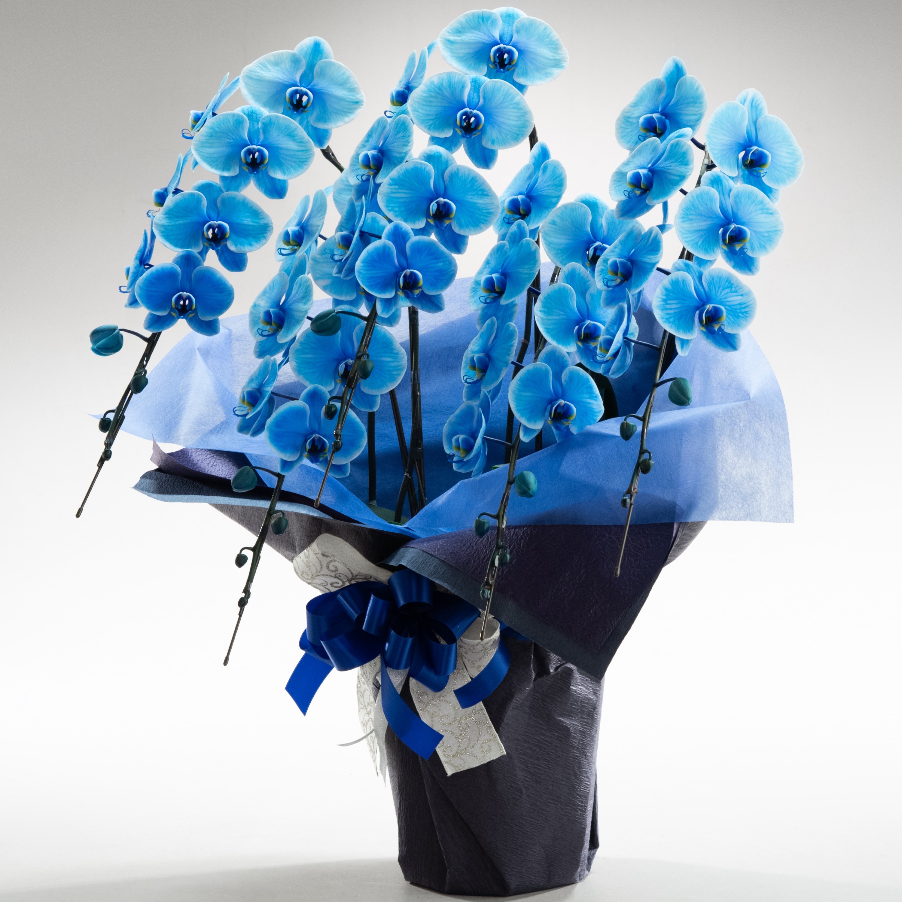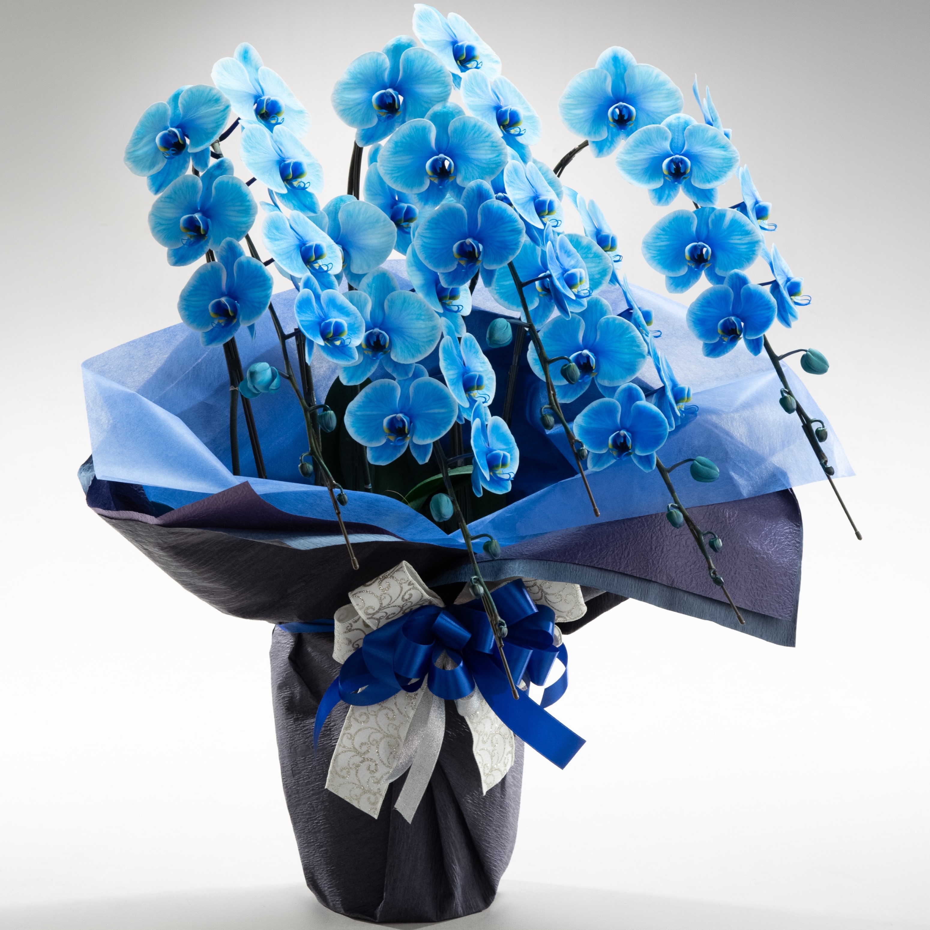 希少で目新しい胡蝶蘭エレガンスシリーズは、新たな技術の染色による胡蝶蘭です。青色の花弁で個性的なイメージ。センス良くお洒落で上品にラッピングします。大輪系の胡蝶蘭でだいたい40輪以上お花が付いています。素晴らしく豪華です。御祝や開店・開業祝い、展示会などさまざまな贈り物に。※注意※こちらの商品は、ご注文頂いて納期まで約10日間かかります。お急ぎの場合は、お電話にてお問い合わせ下さいませ。花樹園(TEL.055-960-8739)