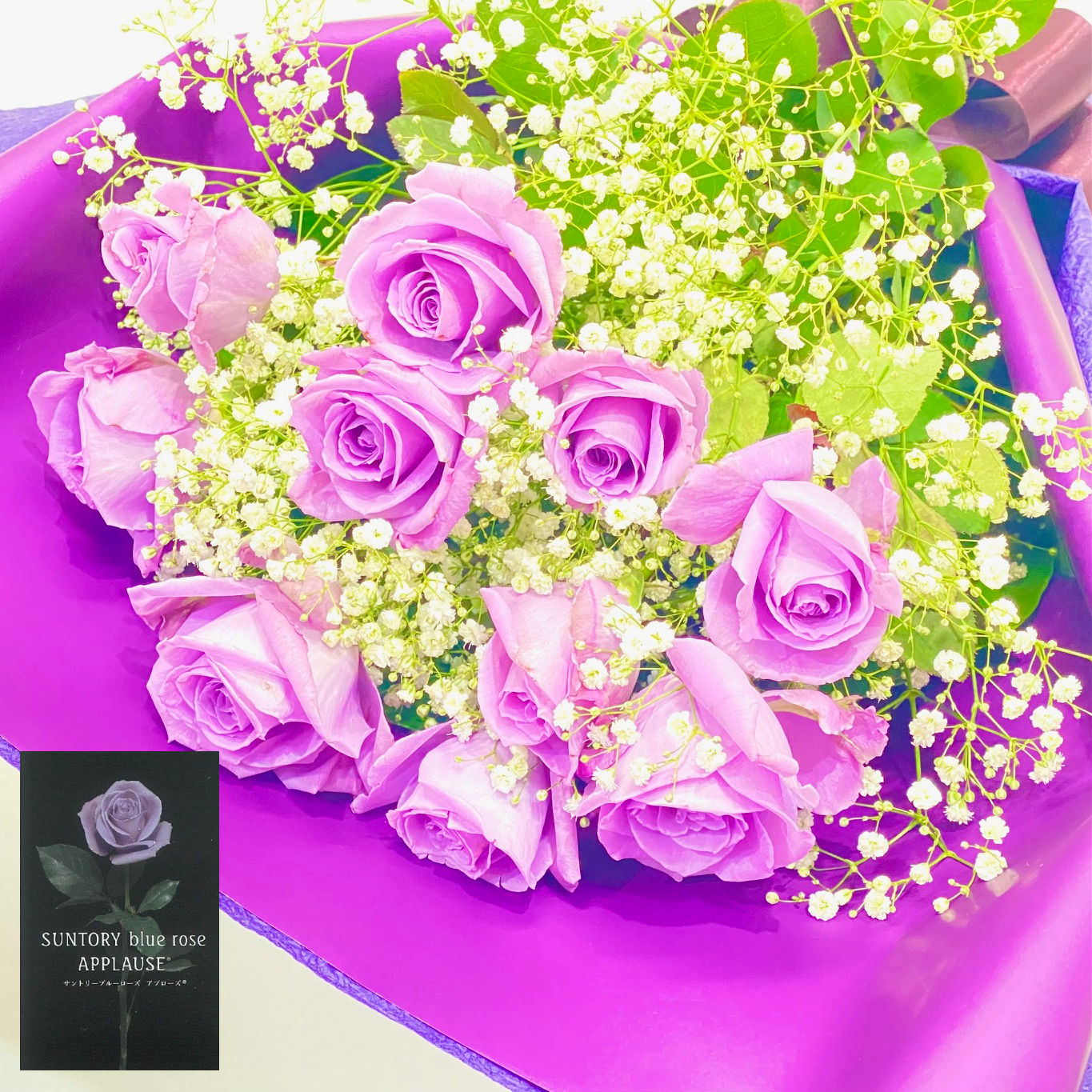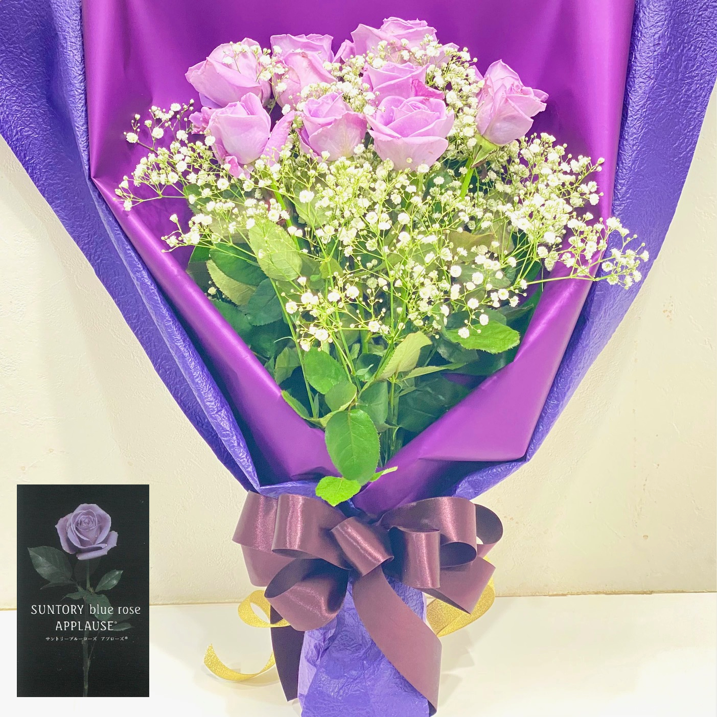 希少価値の高い最高級のバラ、青紫色の「アプローズ」を10本とかすみ草を入れた花束。特別な贈り物にいかがでしょうか。※こちらの商品についてのご相談、ご質問等ございましたら(メール)または(お電話)にて承ります。