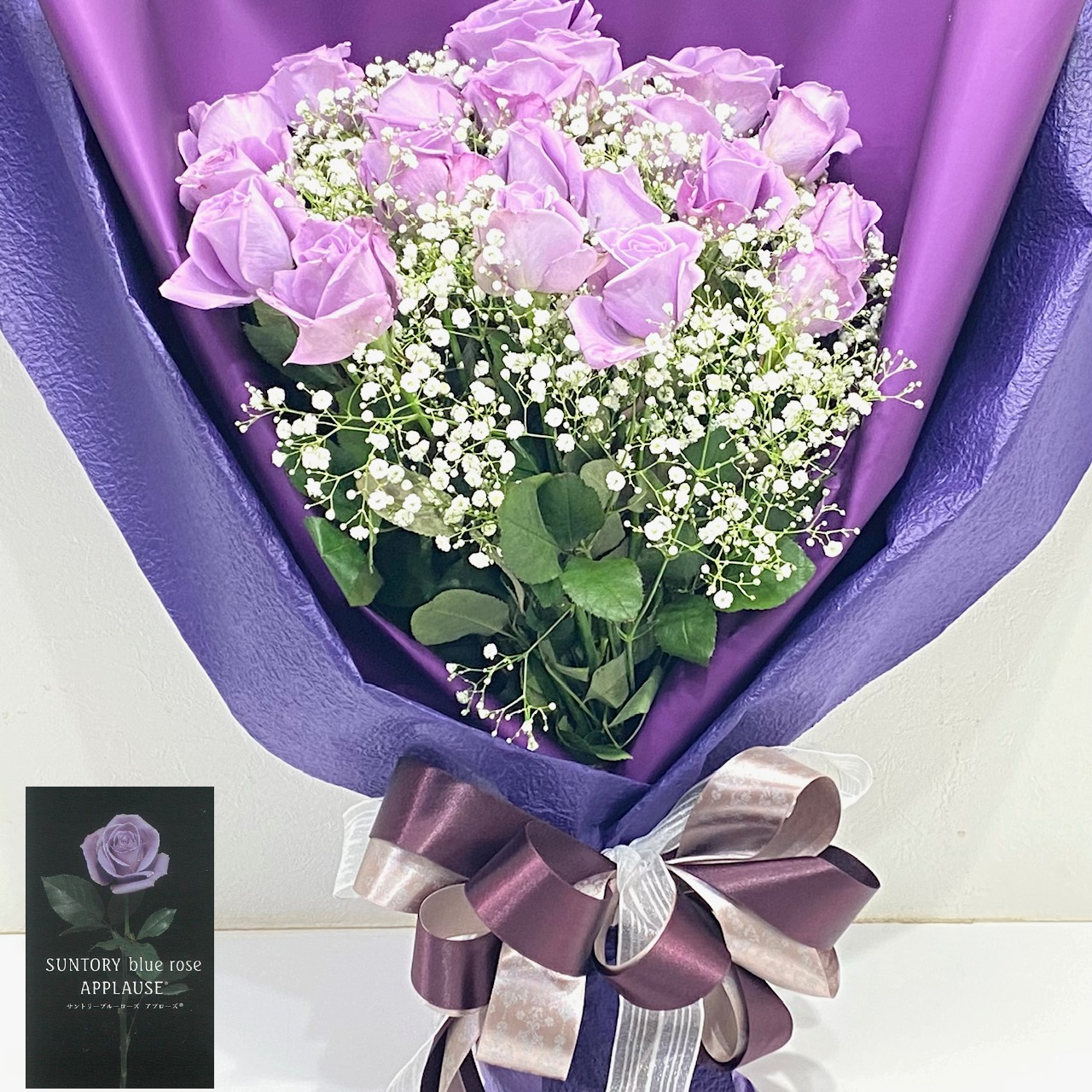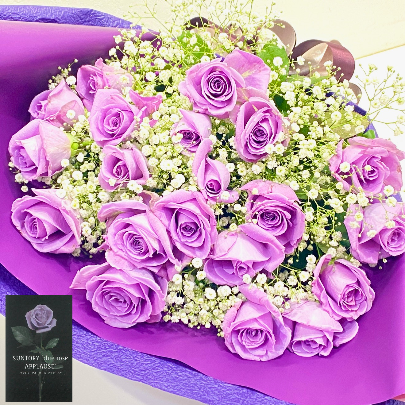 希少価値の高い最高級のバラ、青紫色の「アプローズ」を20本とかすみ草を入れた花束。特別な贈り物にいかがでしょうか。※こちらの商品についてのご相談、ご質問等ございましたら(メール)または(お電話)にて承ります。