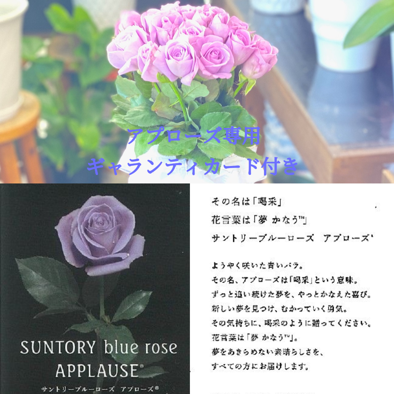 SUNTORYフラワーズが開発した世界初青紫色のバラ【アプローズ】花言葉は「夢かなう」、甘い良い香りもします。素敵にラッピング致します。最近では、プロポーズに使われる人も非常に多いです。また、ご購入されたお客様から高い評価を頂いております。「お誕生日」や「記念日」「愛のイベント」「お祝い」ご用途に贈る特別な贈り物としてオススメです。大切な方へ贈るフラワーギフトやプレゼントなら「花樹園オンラインドットコム」に是非、お任せ下さいませ。