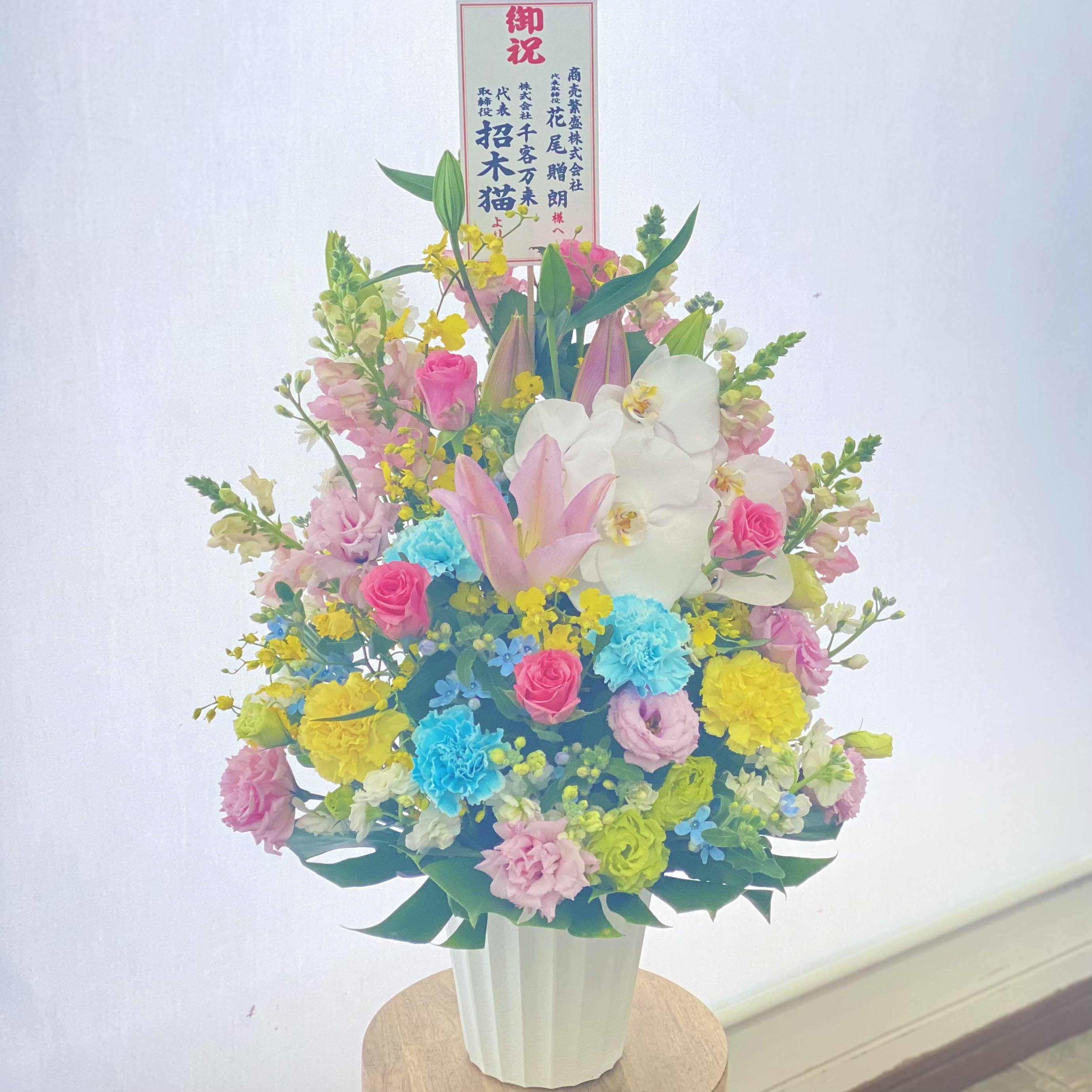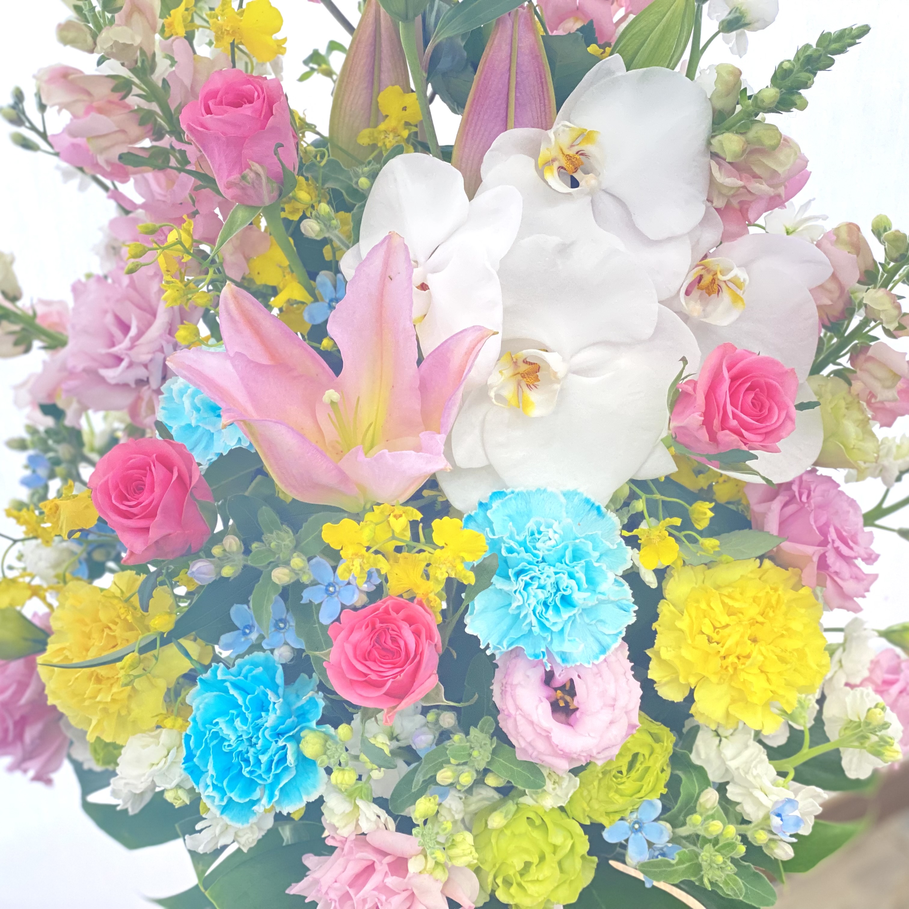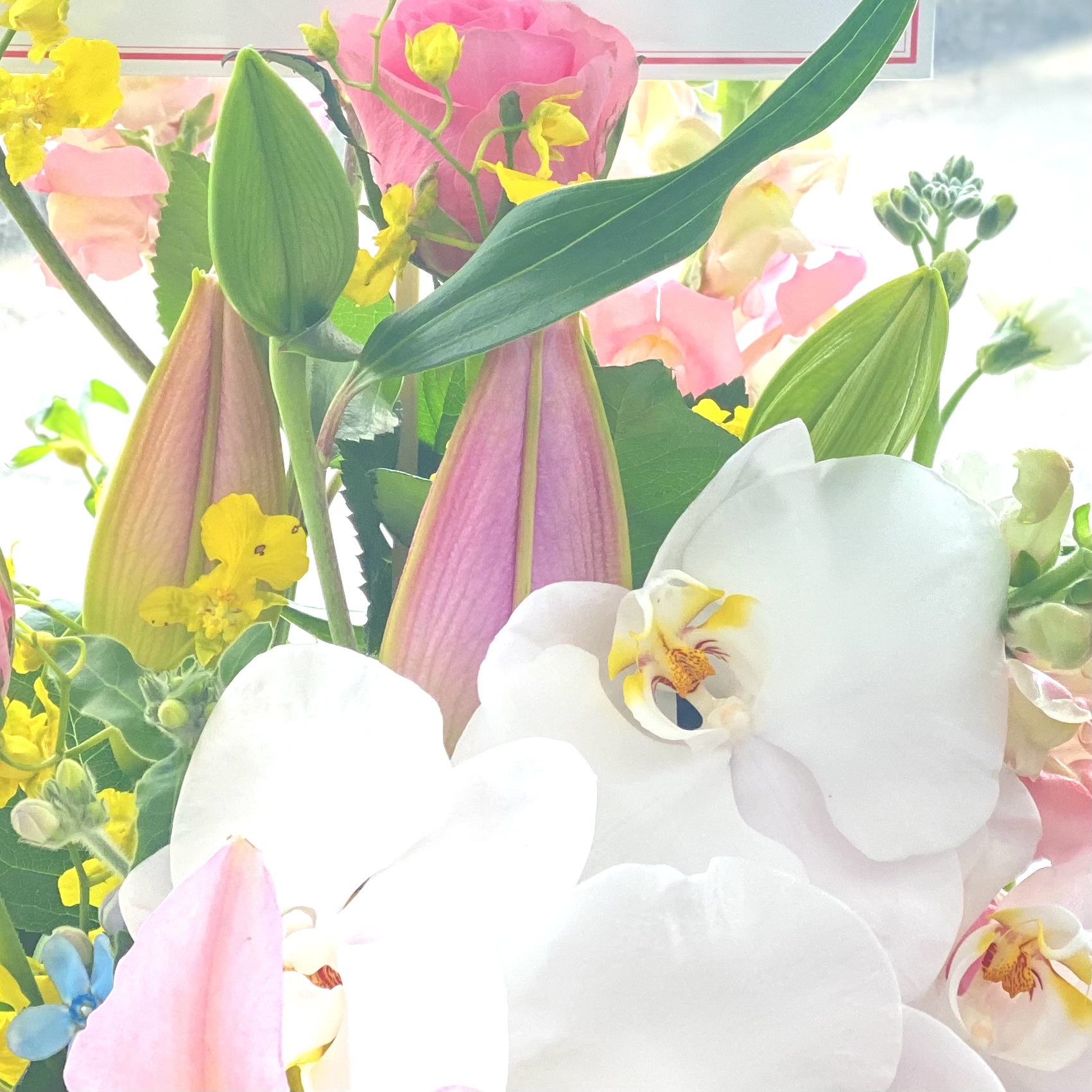 とっても明るく華やかなアレンジメントです。パステルカラーのお花であわせることで明るくなり、アクセントにコチョウランを入れて上品で華やかな雰囲気を演出しました。また、ご利用されたお客様から「大変花持ちが良い」と好評をいただいております。静岡県長泉町から日本全国【真心】込めてお届けいたします。大切な方へ贈るフラワーギフトやプレゼントなら「花樹園オンラインドットコム」に是非、お任せ下さいませ。