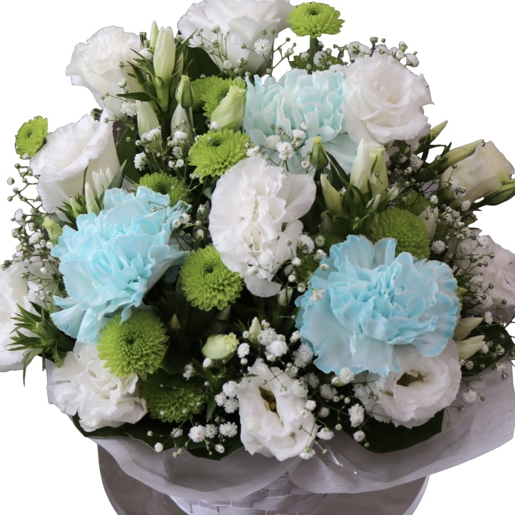 白系主体で淡いブルーのカーネーションが入ったお供え・お悔やみ用のアレンジメント。天国へ旅立った故人への想いを伝える贈り物にいかがですか。【15時迄のご注文で翌日届きます】※こちらの商品についてのご相談、ご質問等ございましたら(メール)または(お電話)にて承ります