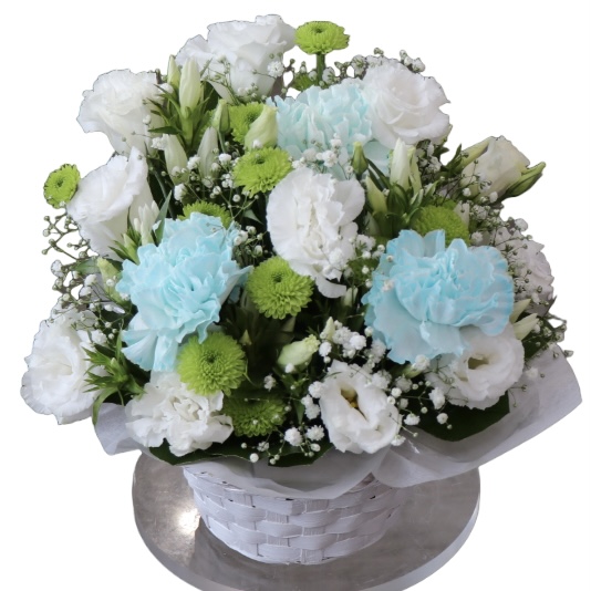 淡いブルーのカーネーションを中心に白系主体でまとめたアレンジメントです。また、その日、市場から入荷した鮮度の良いお花でお作りしますので花持ちが良く、ご利用いただいたお客様から「大変花持ちが良い」と高い評価をいただいております。目を閉じて心の中にいる故人への想いをそっと呼び起こします。当店では、お客様のその想いをしっかりと受け止め、心を込めて制作致します。静岡県から全国へお届けします。故人を偲ぶ色々なシーンで是非、ご利用下さい。