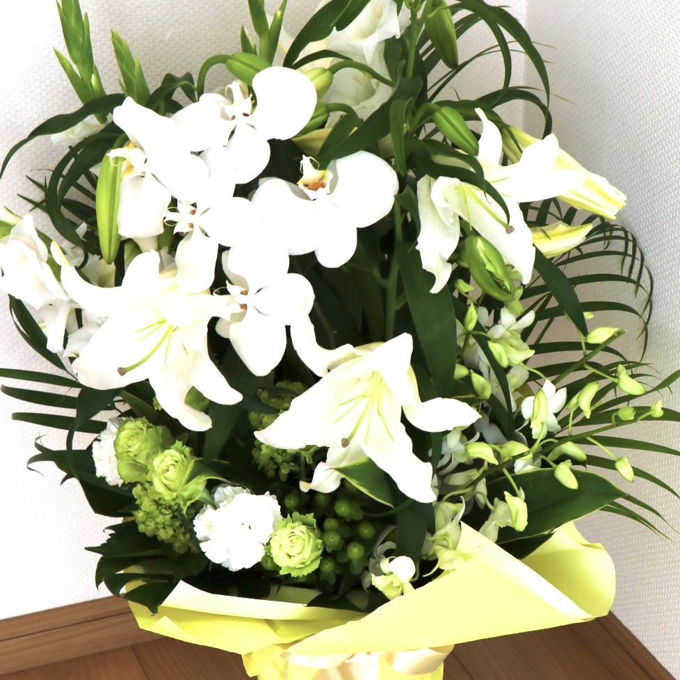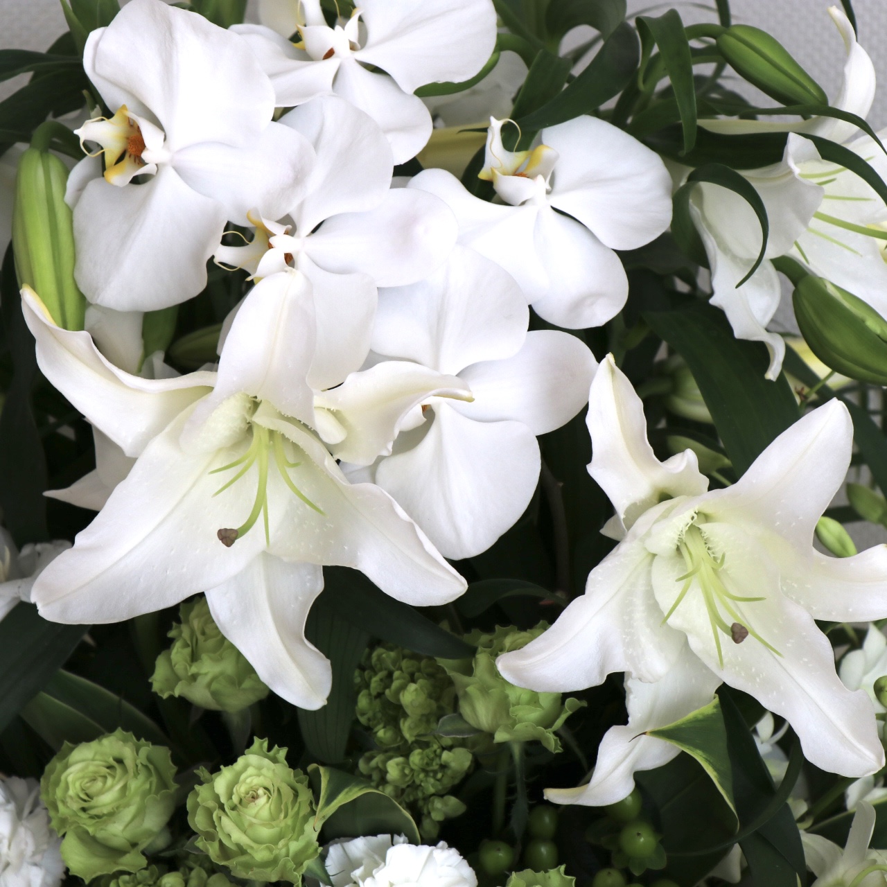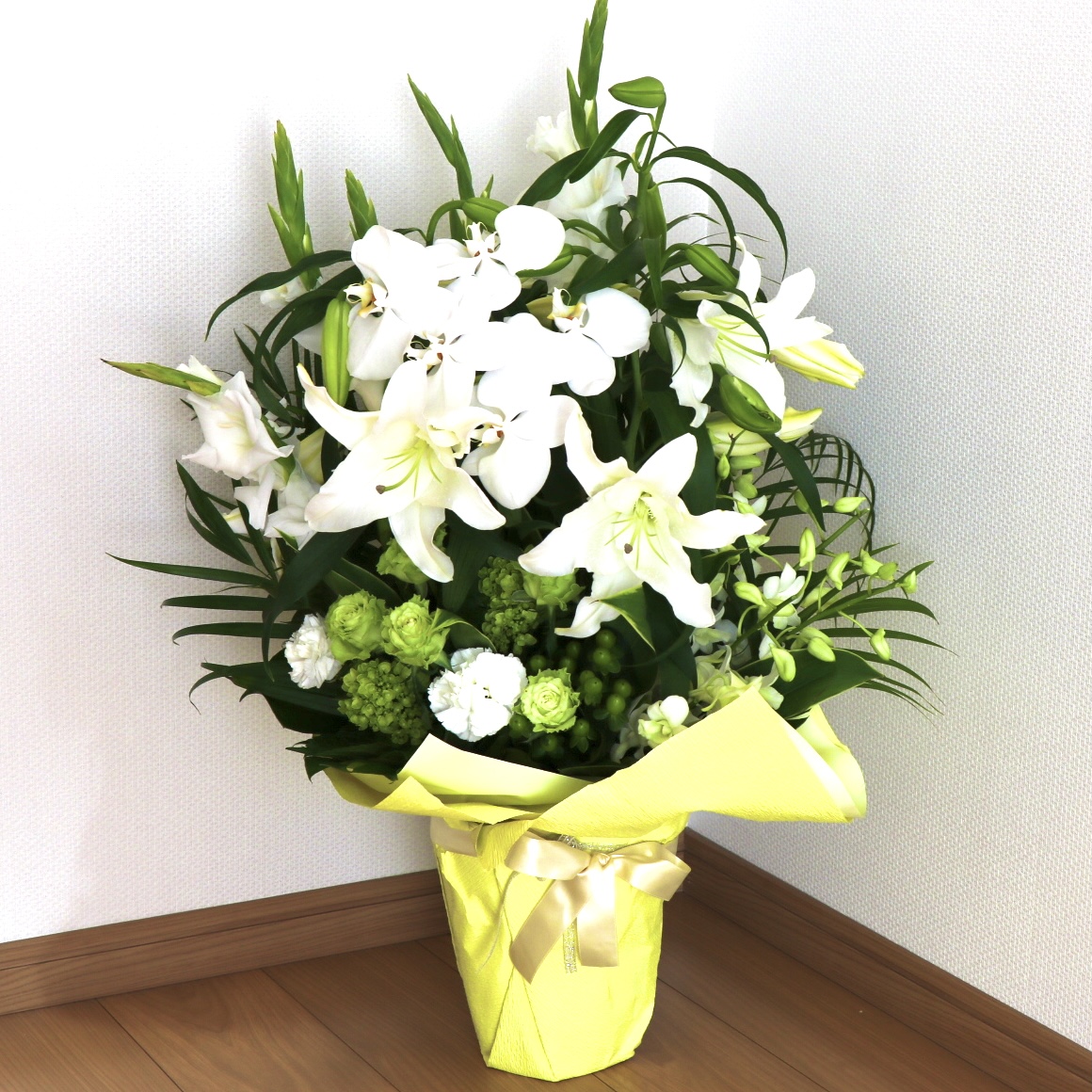 花材: メイン ユリ、バラ、カーネーション、デンファレ、グラジオラス、コチョウランなど その他 季節のお花、実物類、葉物類など