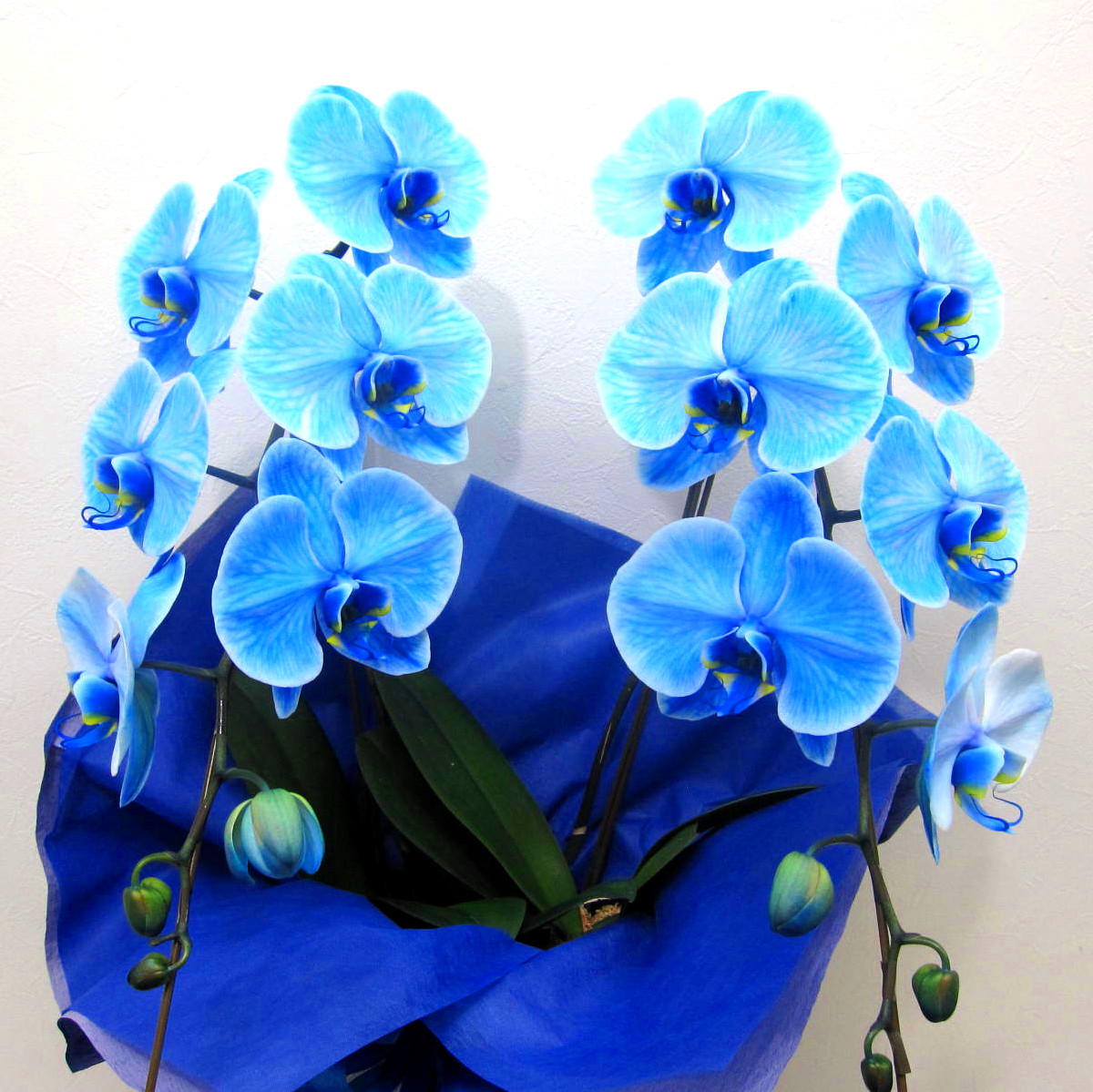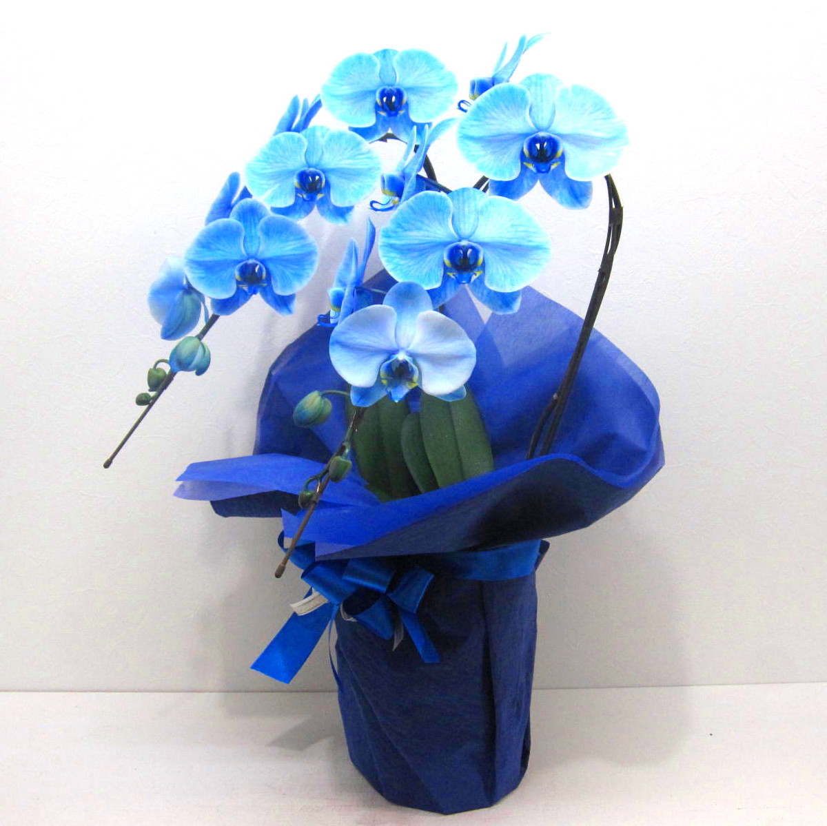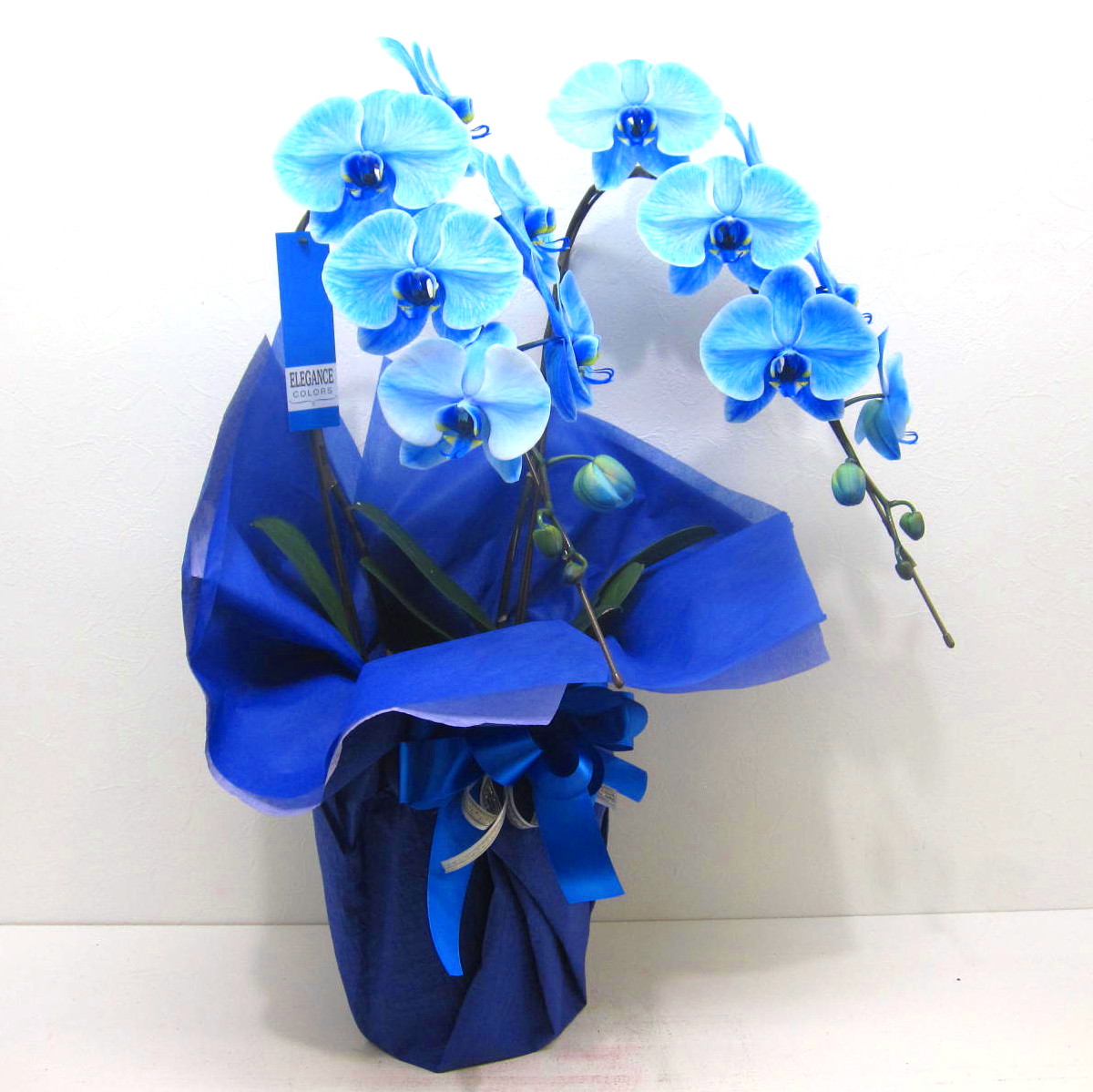 胡蝶蘭エレガンスシリーズは、新たな技術の染色による胡蝶蘭です。青色の花弁で個性的なイメージ。ラッピングにも、とことんこだわりお洒落で上品にラッピング致します。大輪系の胡蝶蘭でだいたい15輪以上お花が付いています。言葉では照れくさい想いをきっと届けてくれる胡蝶蘭です。蘭好きな大切な方に、御祝や開店・開業祝い、展示会などさまざまな贈り物に。後払い決済&クレジット決済可能です。その他、わからないことやご相談等ございましたらお気軽にお問合せ下さい。