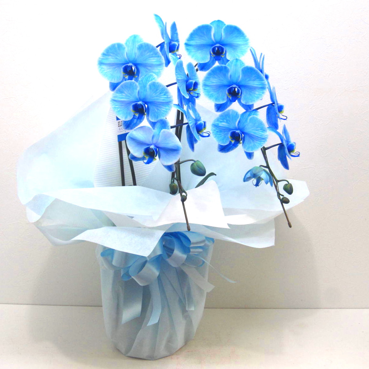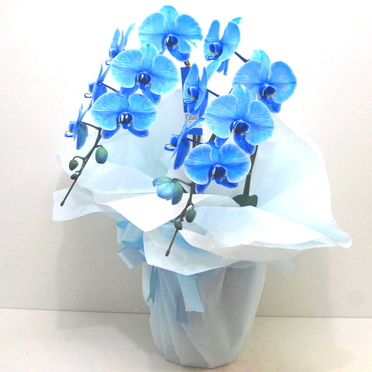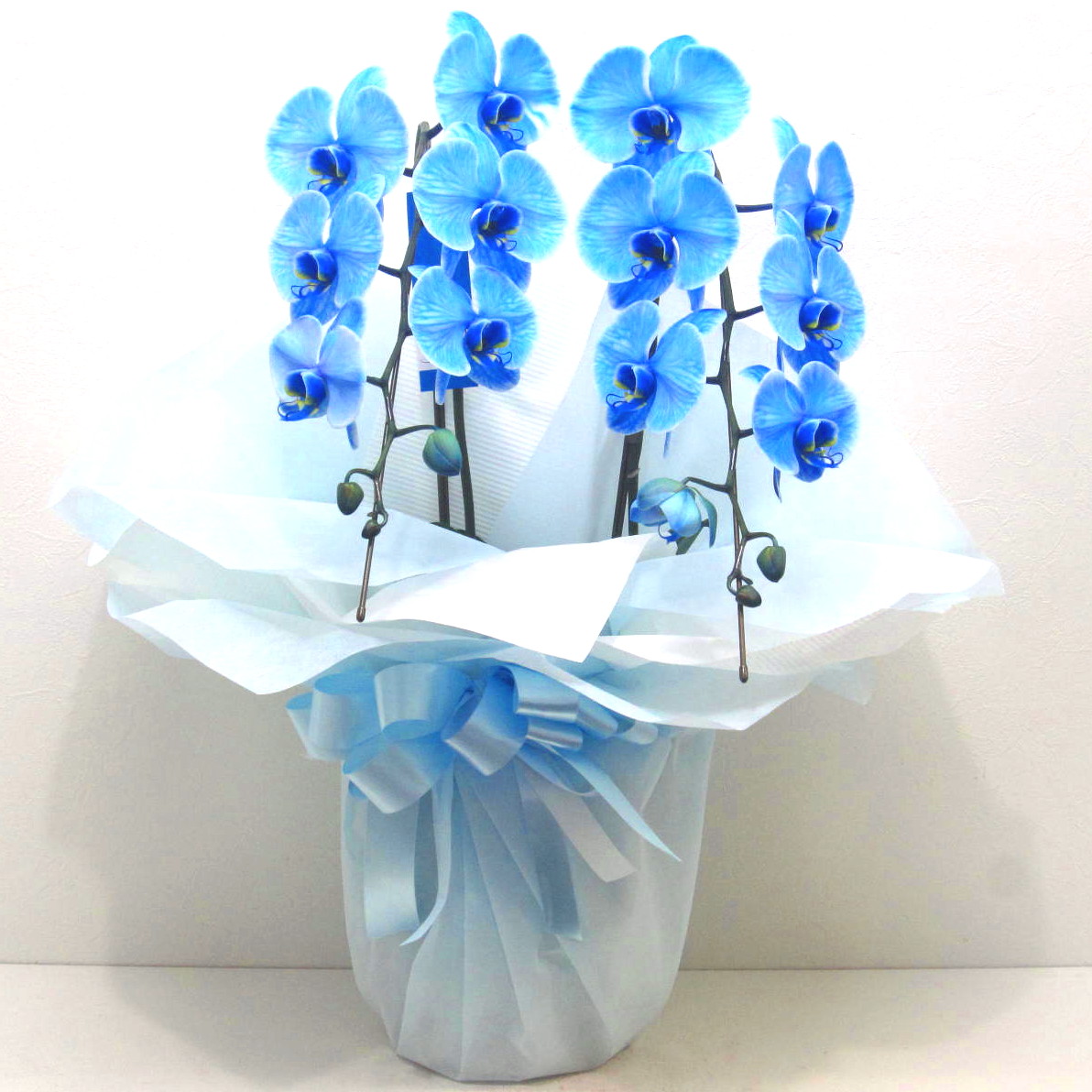 胡蝶蘭エレガンスシリーズは、新たな技術の染色による胡蝶蘭です。希少な青色の胡蝶蘭をお供え用に淡くラッピングしました。大輪系の胡蝶蘭でだいたい15輪以上お花が付いています。また、大きさもコンパクトでスタイリッシュな感じなので置き場所を選ばず、ご仏壇の横のスペースに飾っていただけるとちょうど良いかもしれません。手入れも簡単で花持ちも抜群です。故人を偲ぶさまざまなシーンでお使い頂けます。静岡県長泉町から日本全国【真心】込めてお届けいたします。大切な方へ贈るフラワーギフトやプレゼントなら「花樹園オンラインドットコム」に是非、お任せ下さいませ。後払い決済&クレジット決済可能です。その他、わからないことやご相談等ございましたらお気軽にお問合せ下さい。