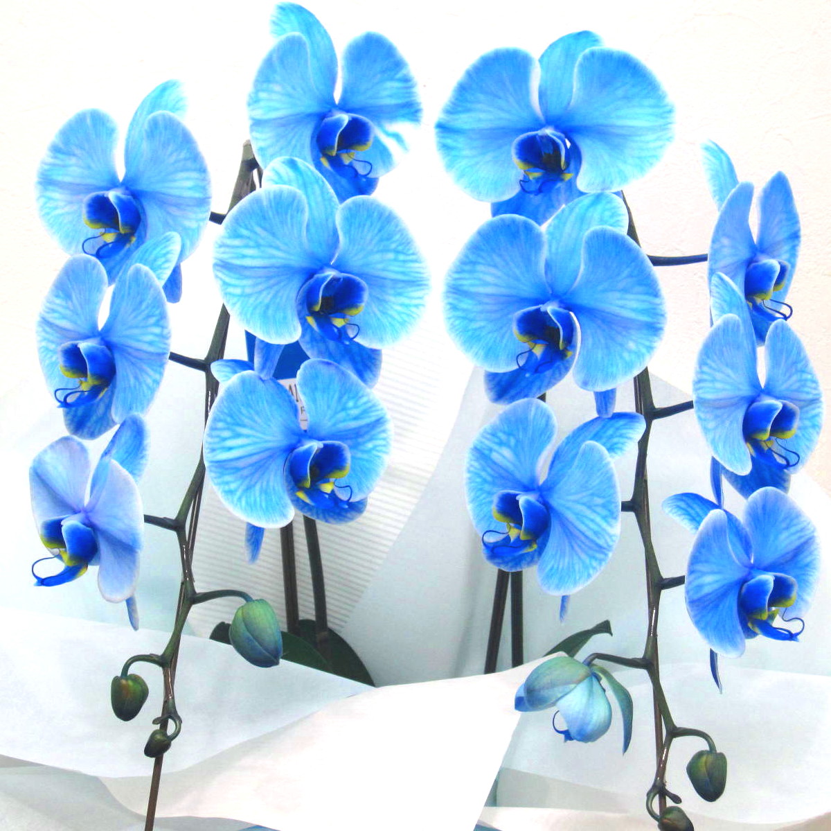 花材: メイン 胡蝶蘭【ブルーエレガンス】2本立ち その他 ※お花の染色について【①つぼみが咲いたときは、色が薄くなります。②2回目以降は白い花が咲きます。】