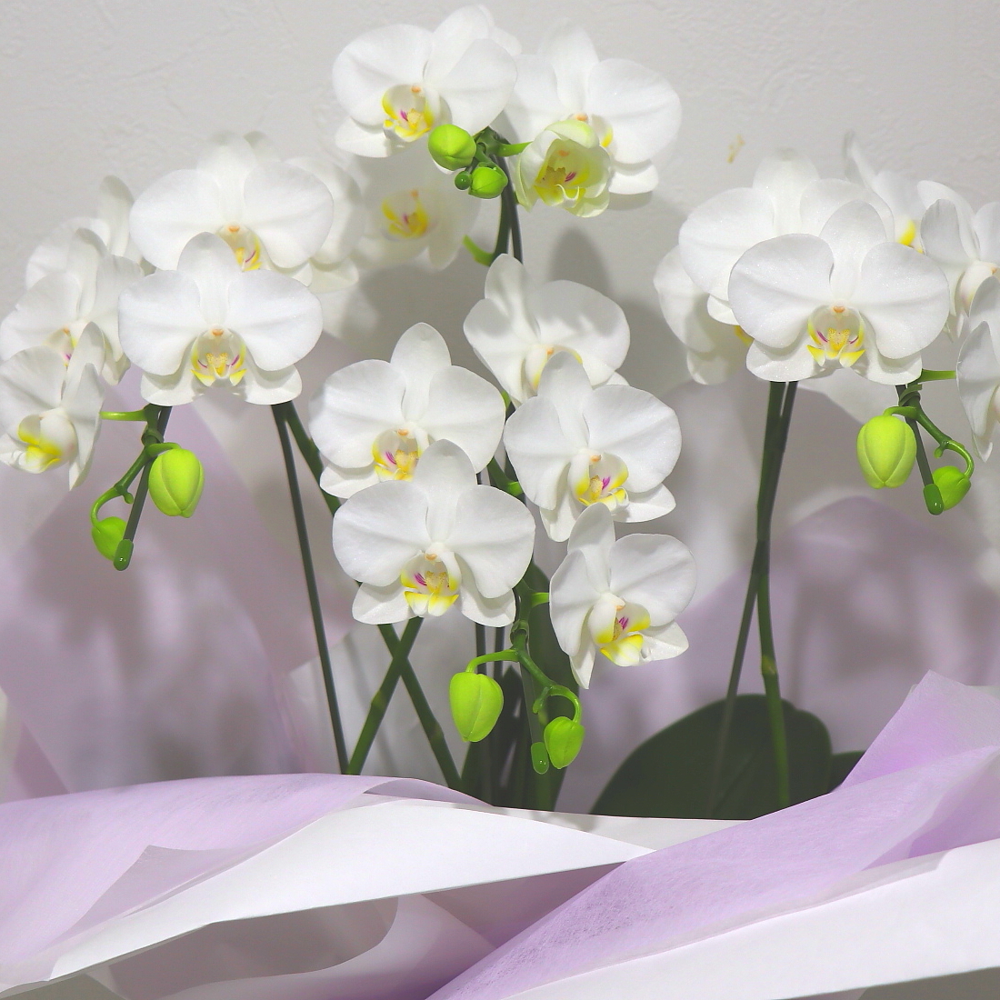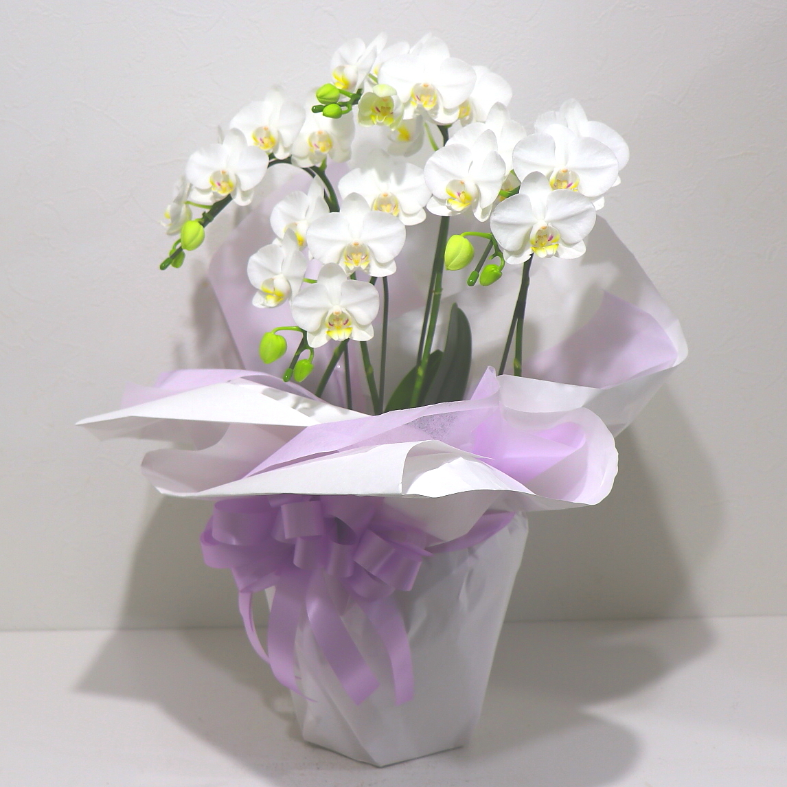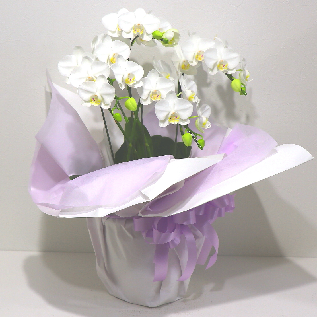 小さな花びらが無数にヒラヒラと咲き誇る上品な胡蝶蘭(アマビリス)です。ラッピングも上品に白色を基調に淡い紫ベースで上品にお包み致します。置き場所にも困らずコンパクトで、ご購入されたお客様から「大変花持ちが良い」と高い評価を頂いております。静岡県長泉町から日本全国【真心】込めてお届けいたします。故人を偲ぶさまざまなシーンでお使い頂けます。大切な方へ贈るフラワーギフトやプレゼントなら「花樹園オンラインドットコム」に是非、お任せ下さいませ。※当店ではお客様の想い大切に【こころを込めて】お作りいたします。後払い決済&クレジット決済可能です。その他、わからないことやご相談等ございましたらお気軽にお問合せ下さい。