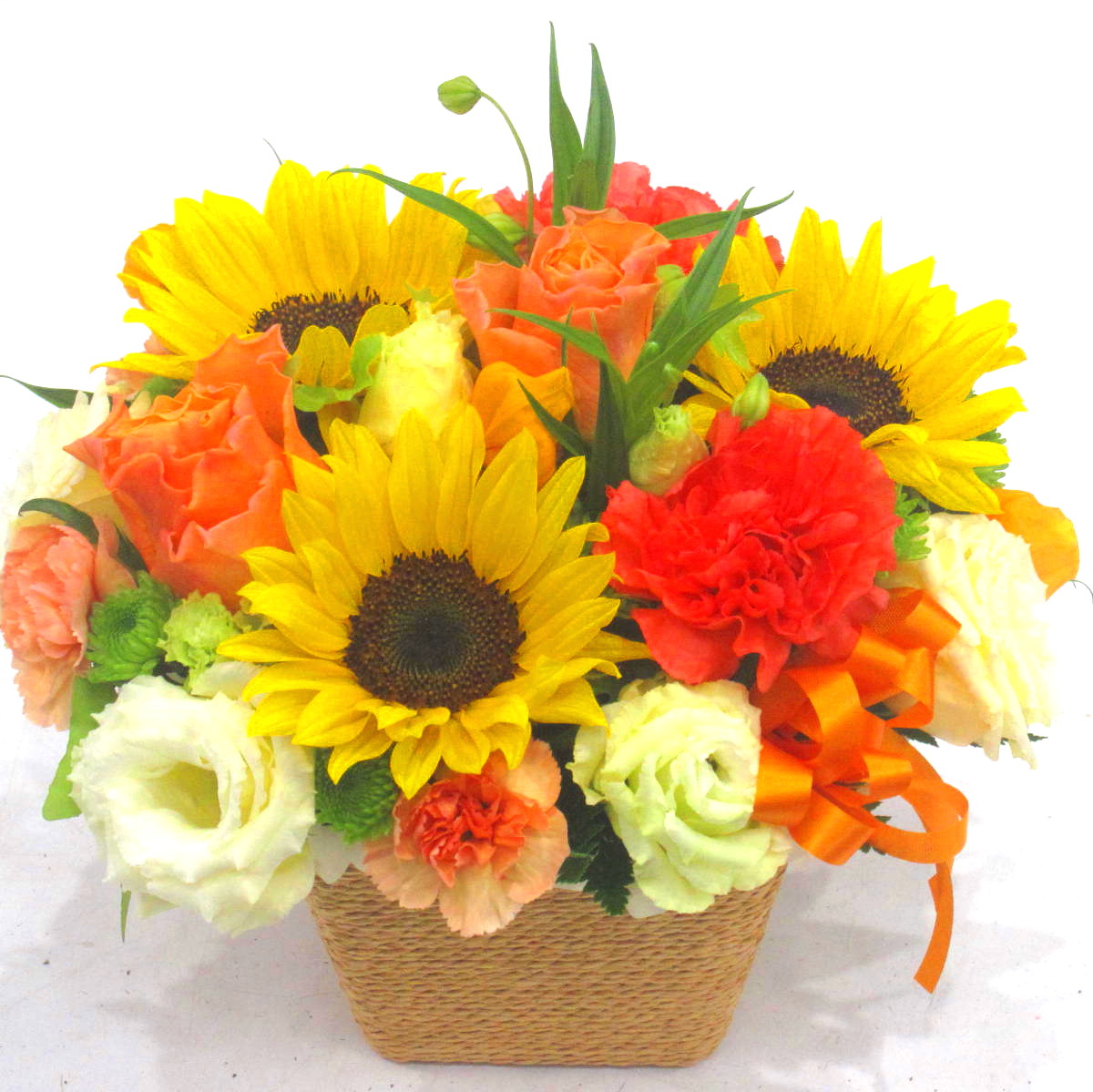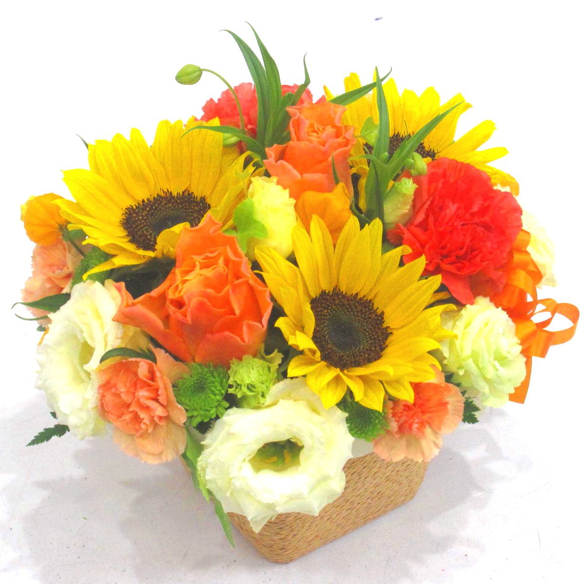 大人気【ひまわり】を入れたイエロー&オレンジ系のアレンジメントです。上品な雰囲気でラウンドタイプで作っておりますのでどこから見ても綺麗に見えます。きっととびっきりに喜んでいたただけると思います。また、持ちの良いお花を中心に使っておりますので花持ちも良いでしょう。ご購入されたお客様から高い評価を頂いております。静岡県長泉町から日本全国【真心】込めてお届けいたします。さまざまなご用途に贈る贈り物としてオススメです。大切な方へ贈るフラワーギフトやプレゼントなら「花樹園オンラインドットコム」に是非、お任せ下さいませ。