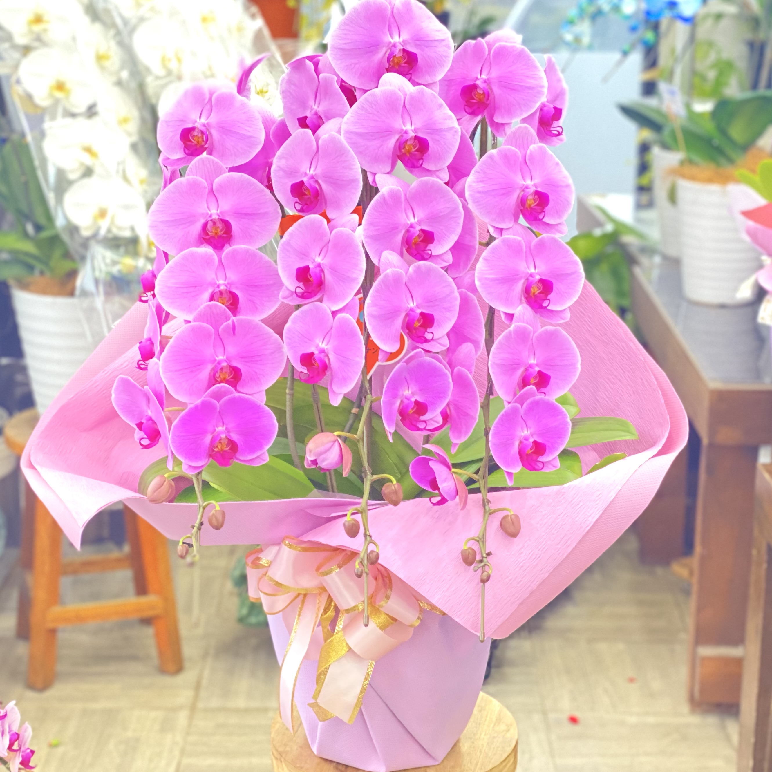 はっきりとしたピンクの色が鮮やかな3本立ち大輪胡蝶蘭です。【15時迄のご注文で翌日届きます】【メッセージカードやお名札も(無料)】でお付け致します※こちらの商品についてのご相談、ご質問等ございましたら(メール)または(お電話)にて承ります。