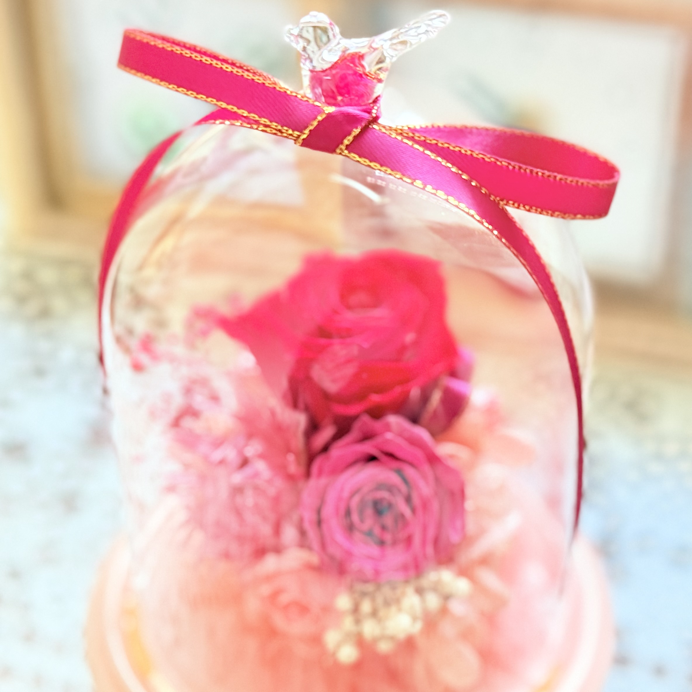 赤系のプリザーブドフラワーを鳥かごのような透明なガラスドームにアレンジしたプリザーブドフラワーです。カラーバリエーションは6色!贈る方のイメージに合わせて贈るのも良し!自分好みで贈るのも良し!ご自宅用に飾ってもオシャレで明るくお部屋を彩ってくれます。是非、想いを込めたフラワーギフトにいかがですか!?