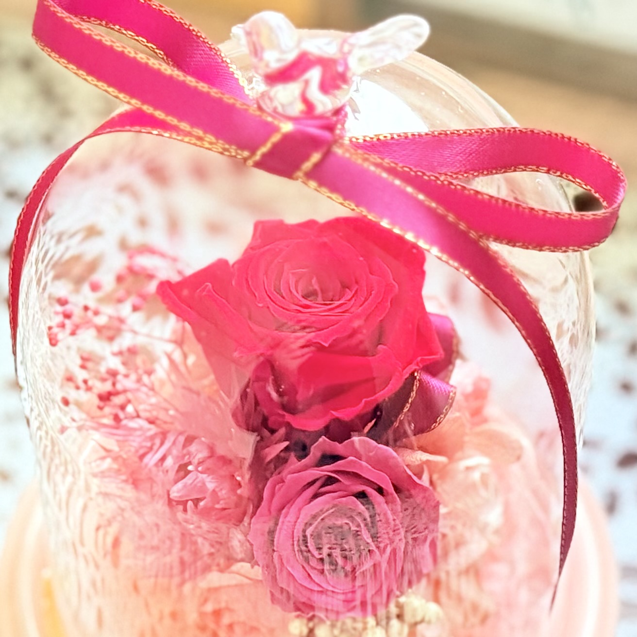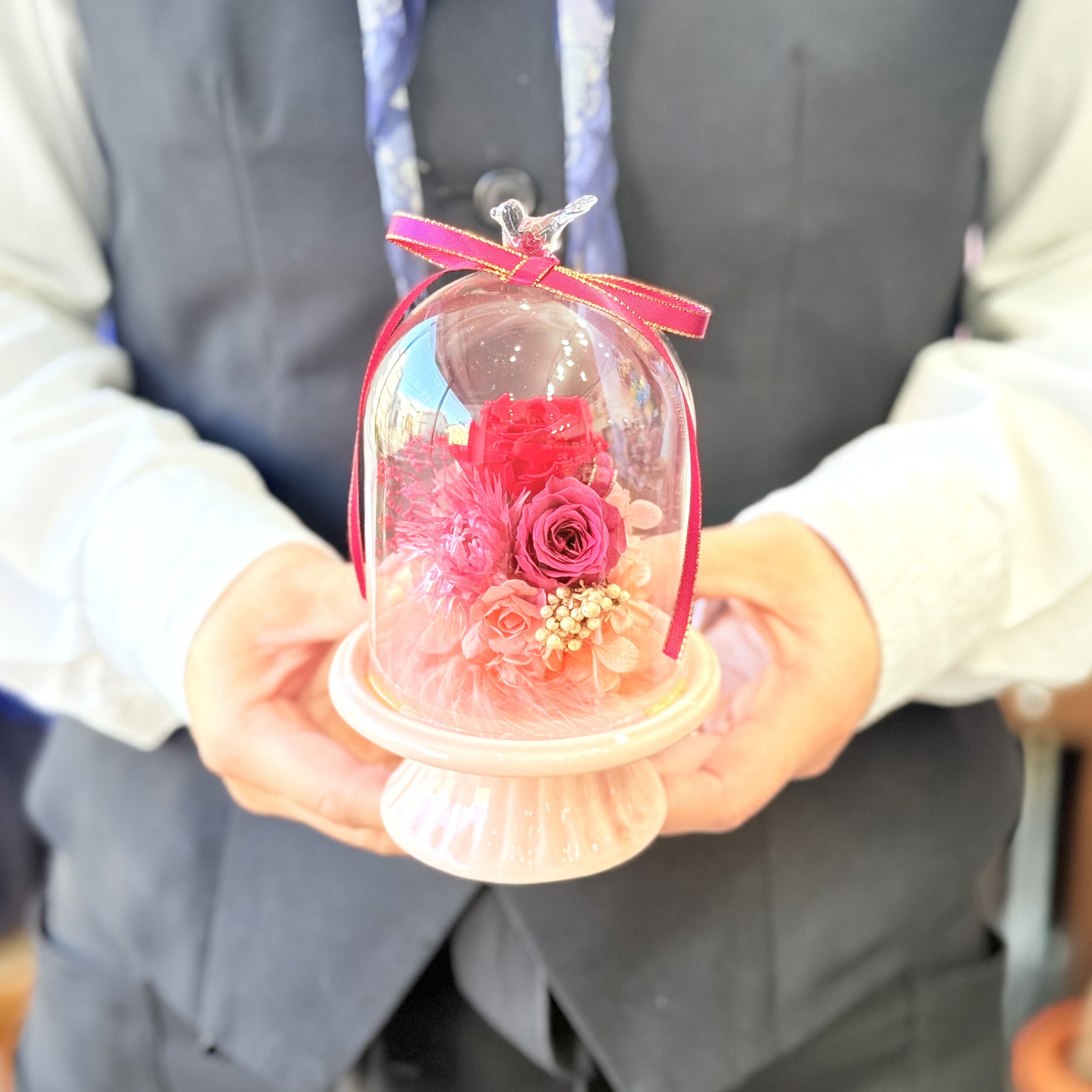 資材・ラッピング: ガラスドーム、モニメントピック類、リボン、ギフト専用BOX付き、フラワーケアカード(取扱説明書)