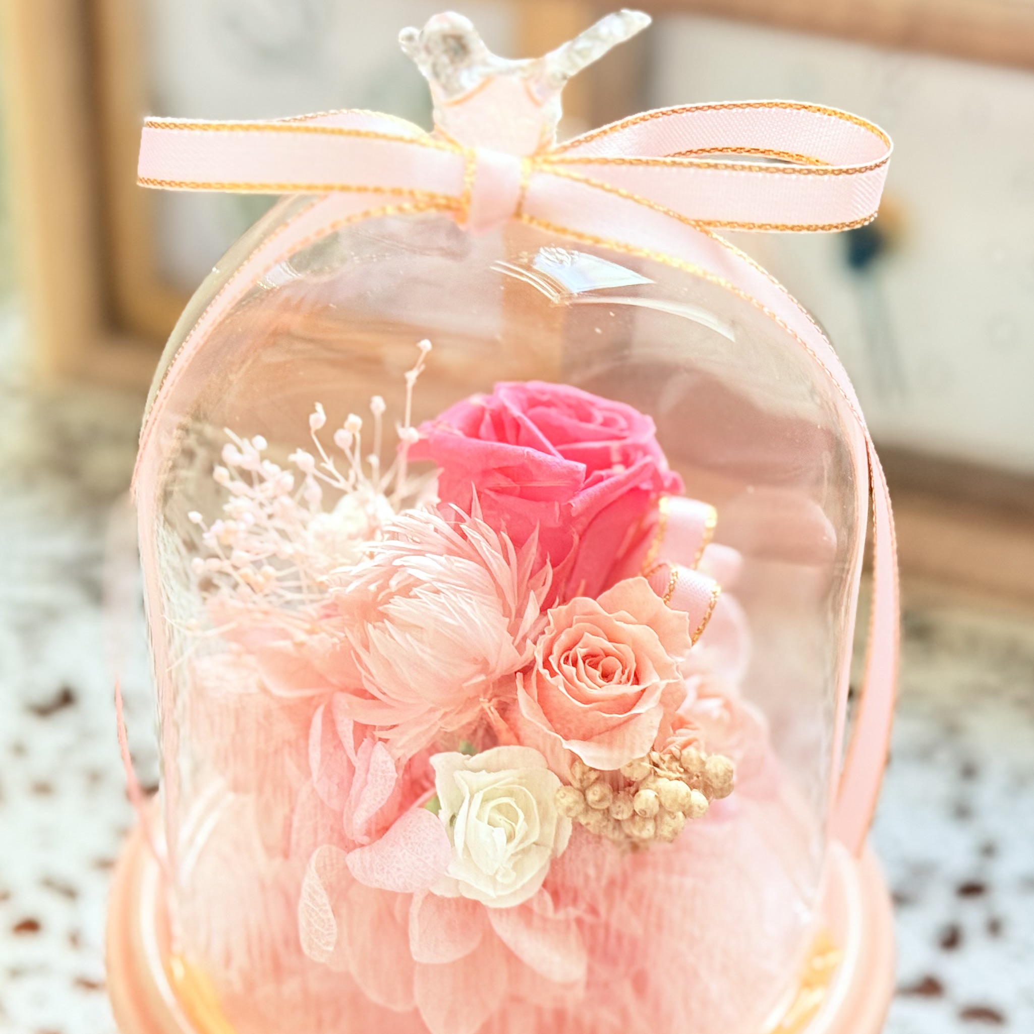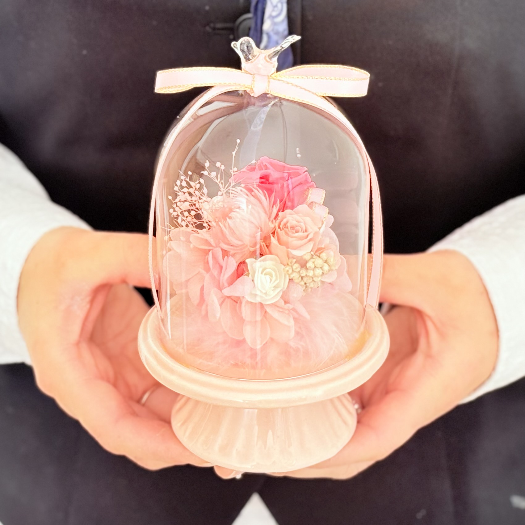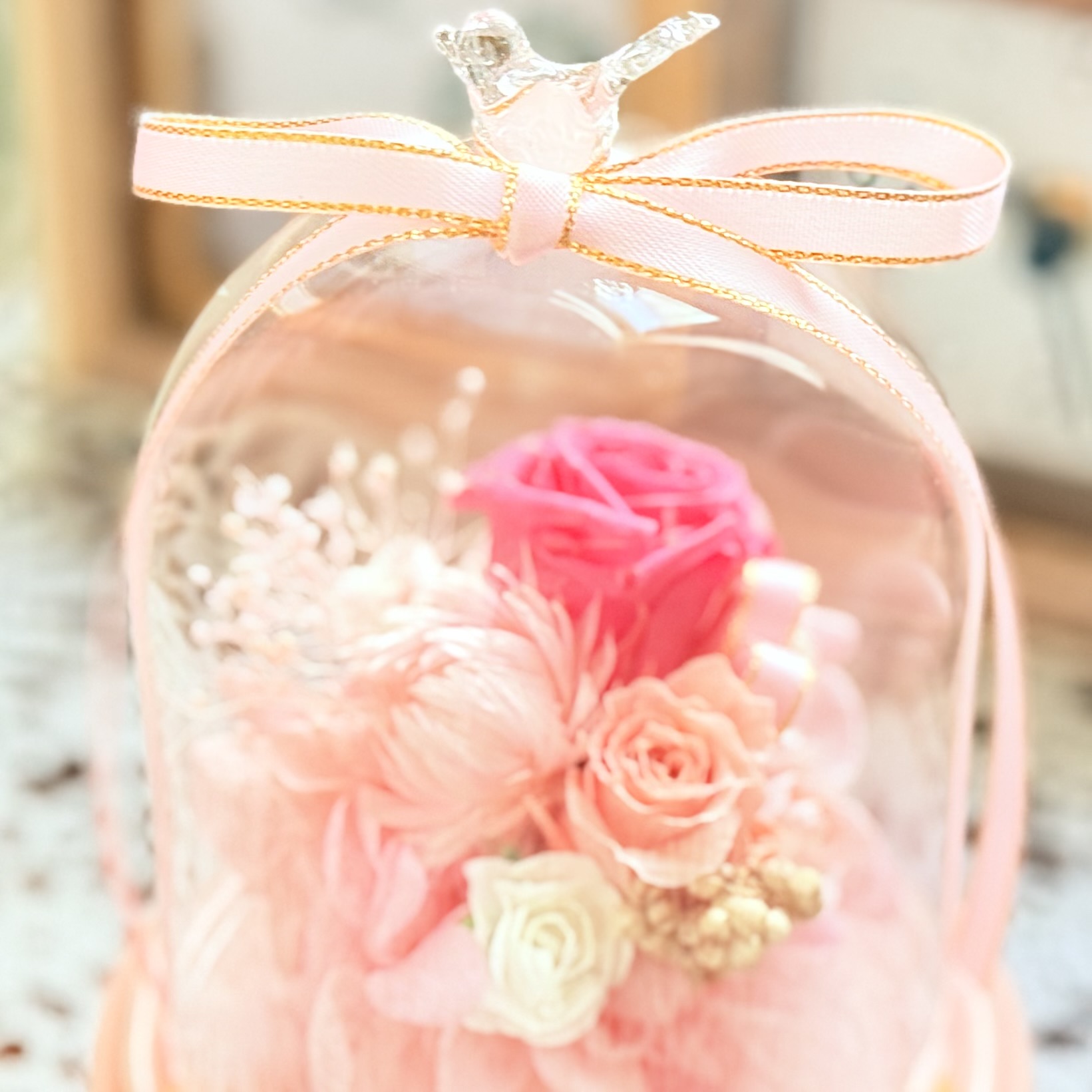 ピンク系のプリザーブドフラワーを鳥かごのような透明なガラスドームにアレンジしたプリザーブドフラワーです。カラーバリエーションは6色!贈る方のイメージに合わせて贈るのも良し!自分好みで贈るのも良し!ご自宅用に飾ってもオシャレで明るくお部屋を彩ってくれます。是非、想いを込めたフラワーギフトにいかがですか!?