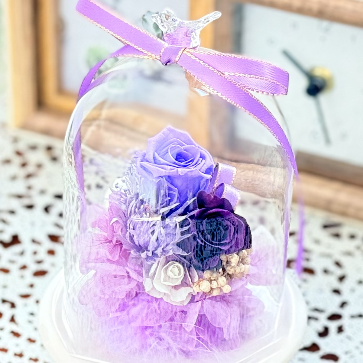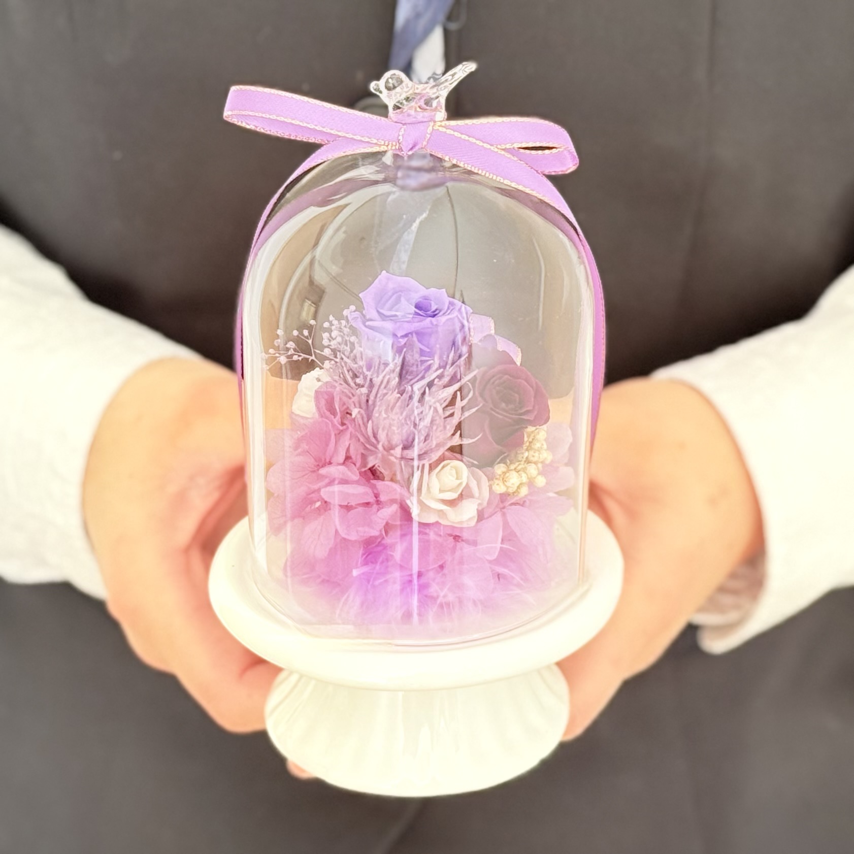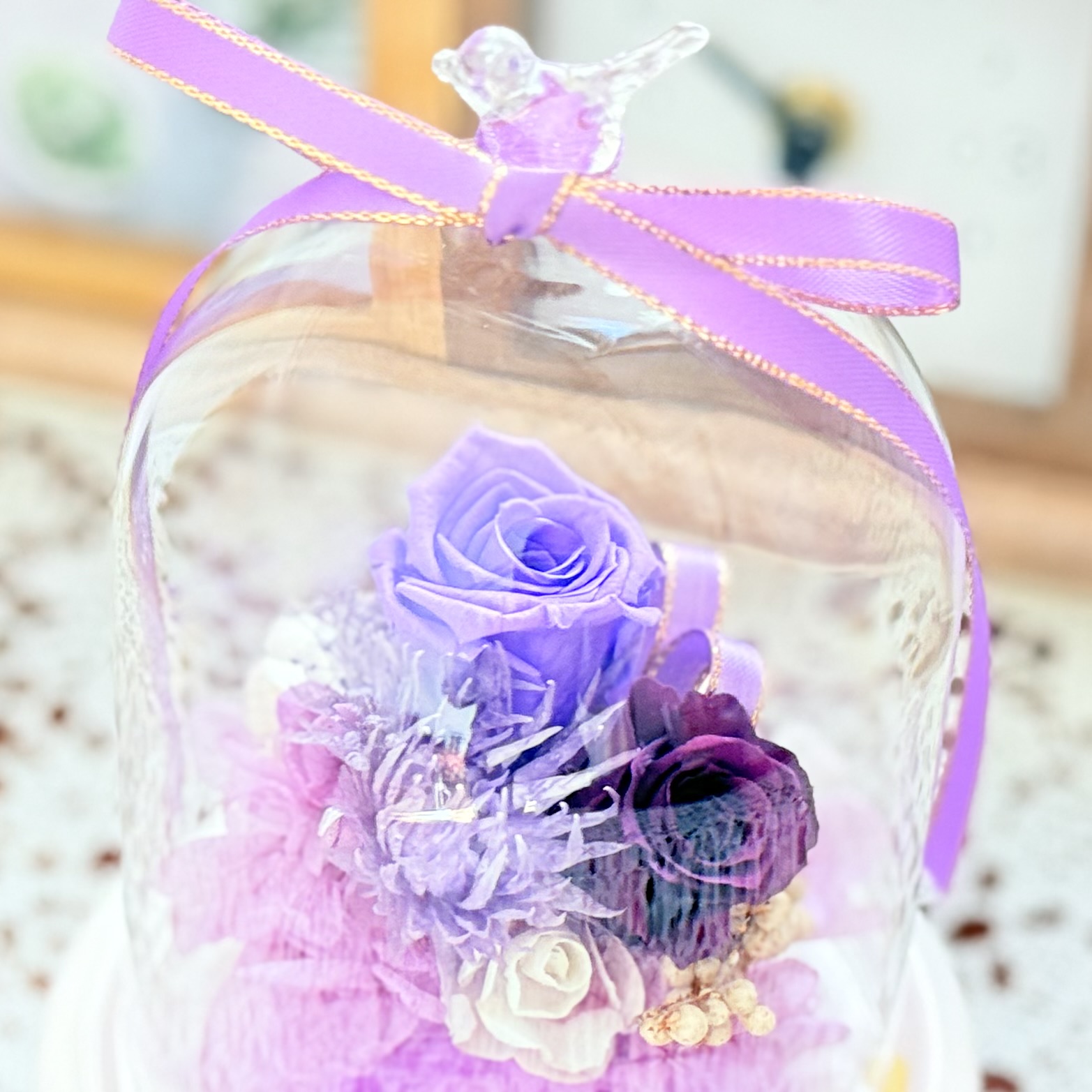 紫系のプリザーブドフラワーを鳥かごのような透明なガラスドームにアレンジしたプリザーブドフラワーです。カラーバリエーションは6色!贈る方のイメージに合わせて贈るのも良し!自分好みで贈るのも良し!ご自宅用に飾ってもオシャレで明るくお部屋を彩ってくれます。是非、想いを込めたフラワーギフトにいかがですか!?