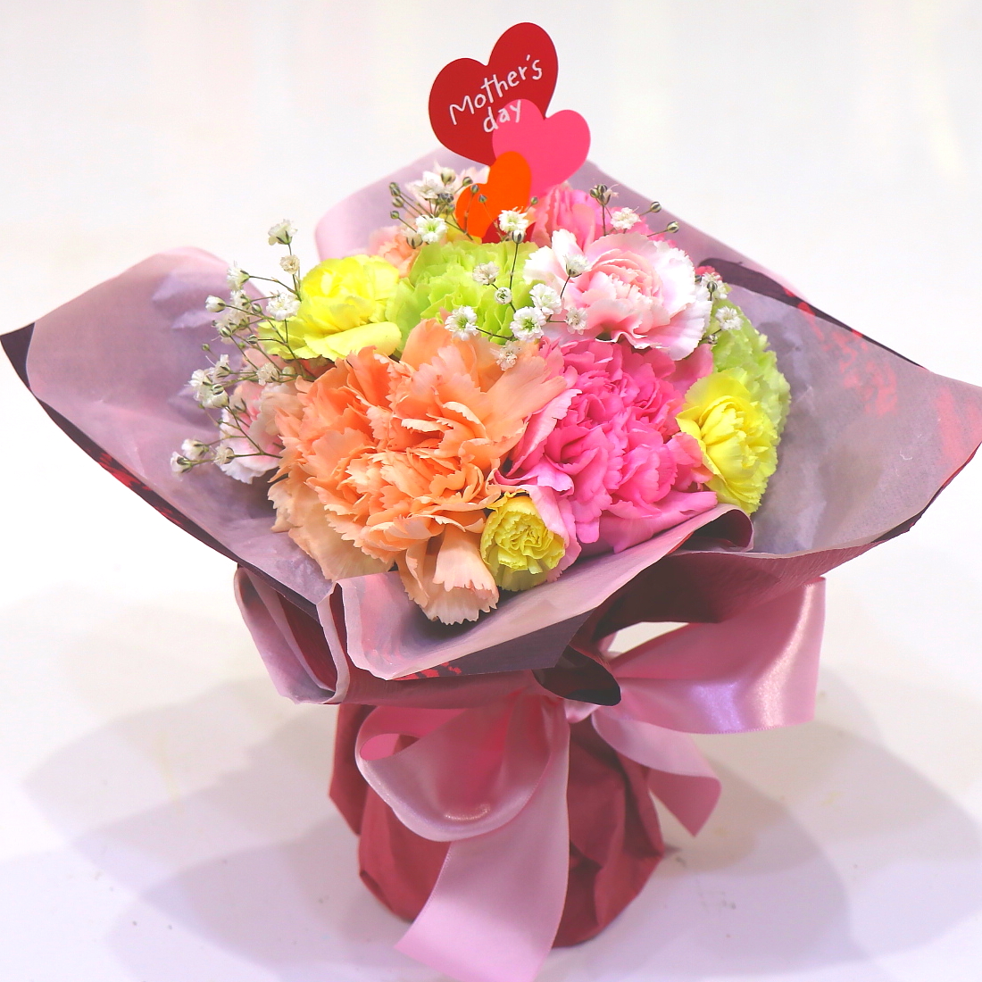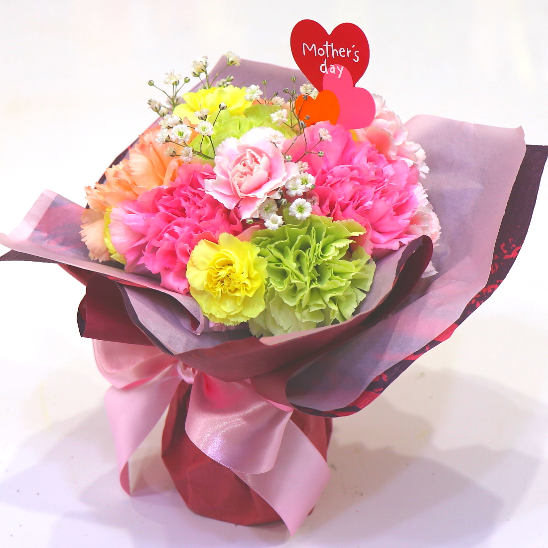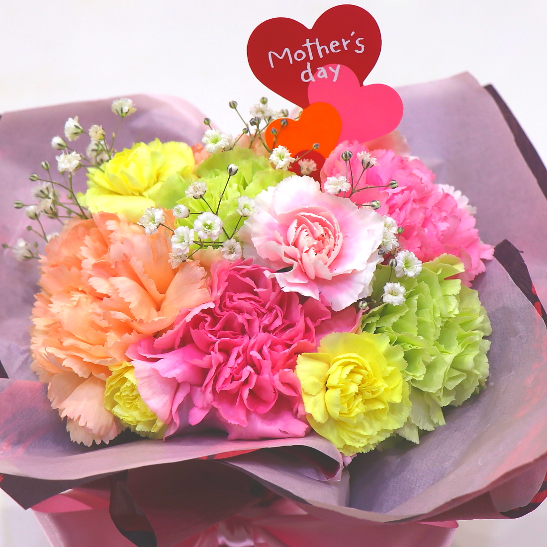 とっても可愛らしいそのまま飾れる花束です。カーネーションを色とりどりミックスしたとても明るい色合いです。お母さんがきっと喜ぶこと間違いありません!中が花瓶のようなプラスチック製の形状になっておりうっかり落としても割れません。また、お花が終わってもまた何度でも再利用できますよ。持ちの良い花材を使っておりますので花持ちも良いでしょう。ご購入されたお客様から高い評価を頂いております。静岡県長泉町から日本全国【真心】込めてお届けいたします。大切な方へ贈るフラワーギフトやプレゼントなら「花樹園オンラインドットコム」に是非、お任せ下さいませ。