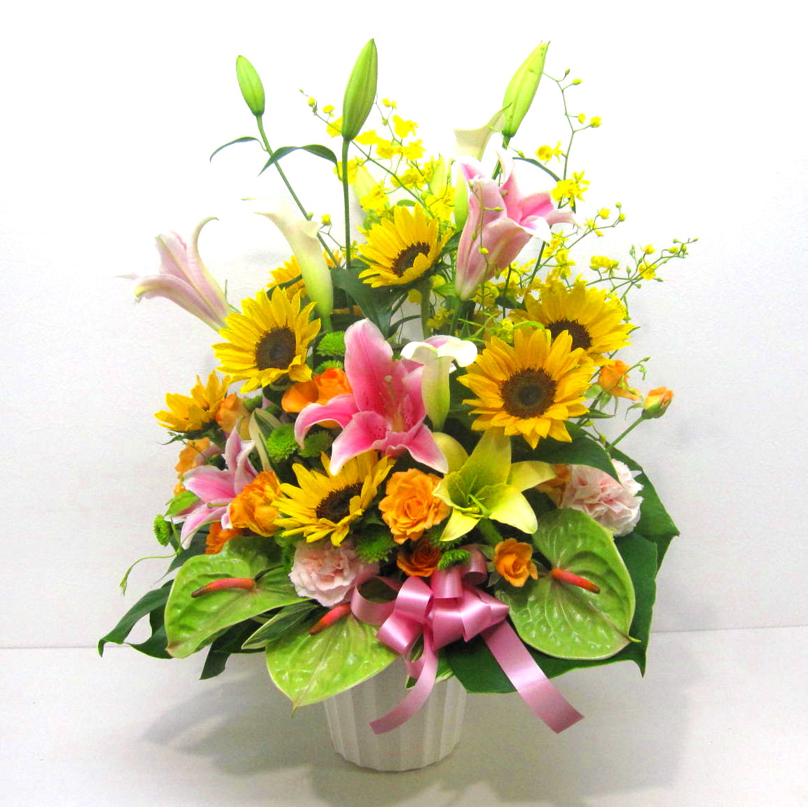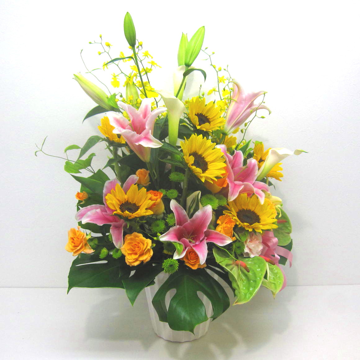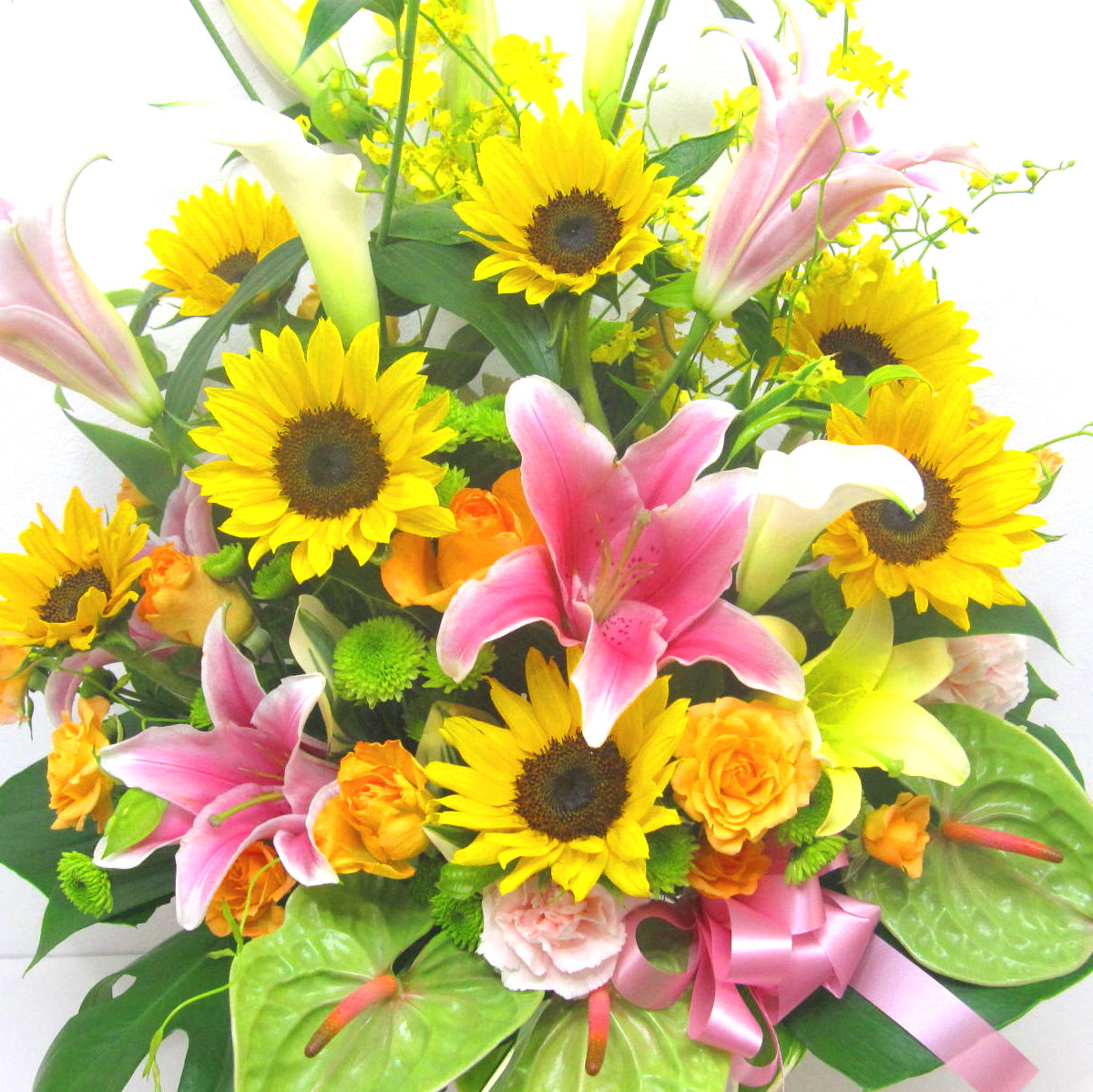 花材: メイン ヒマワリ、ユリ、バラ、アンスリューム、蘭系のお花など その他 葉物類など
