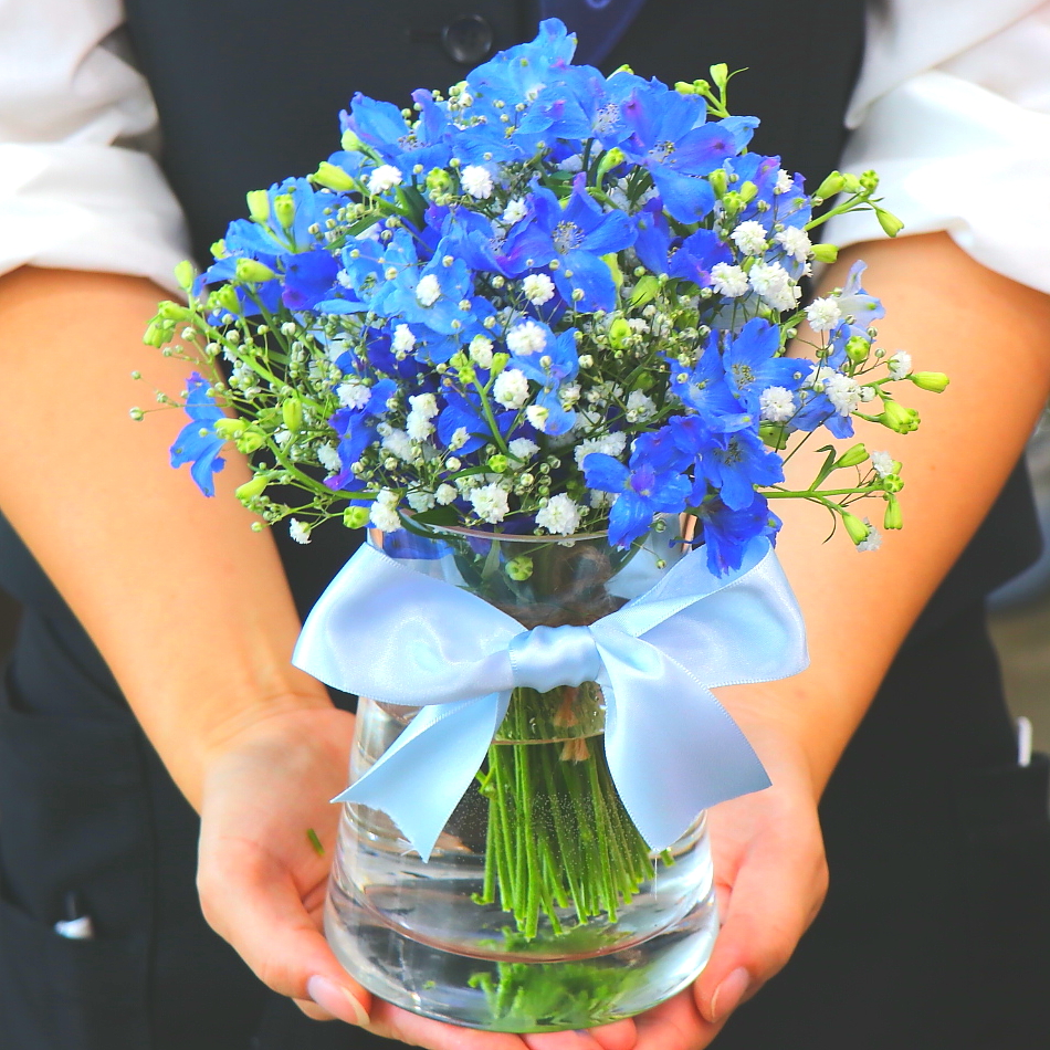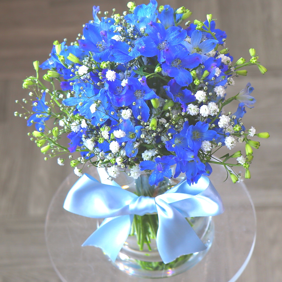 《花言葉・清明》神秘的な青い花のデルフィニュームとかすみ草を入れたシンプルな花瓶付き花束です。花瓶付きなのでそのまま飾れます!【15時迄のご注文で翌日届きます】※こちらの商品についてのご相談、ご質問等ございましたら(メール)または(お電話)にて承ります。