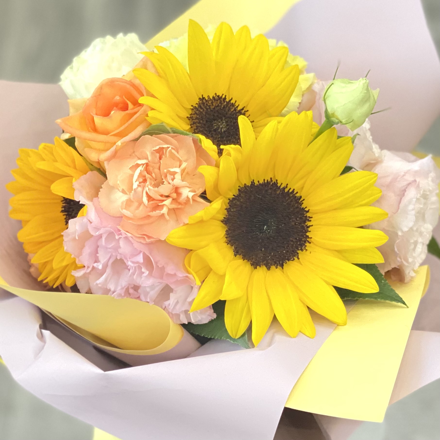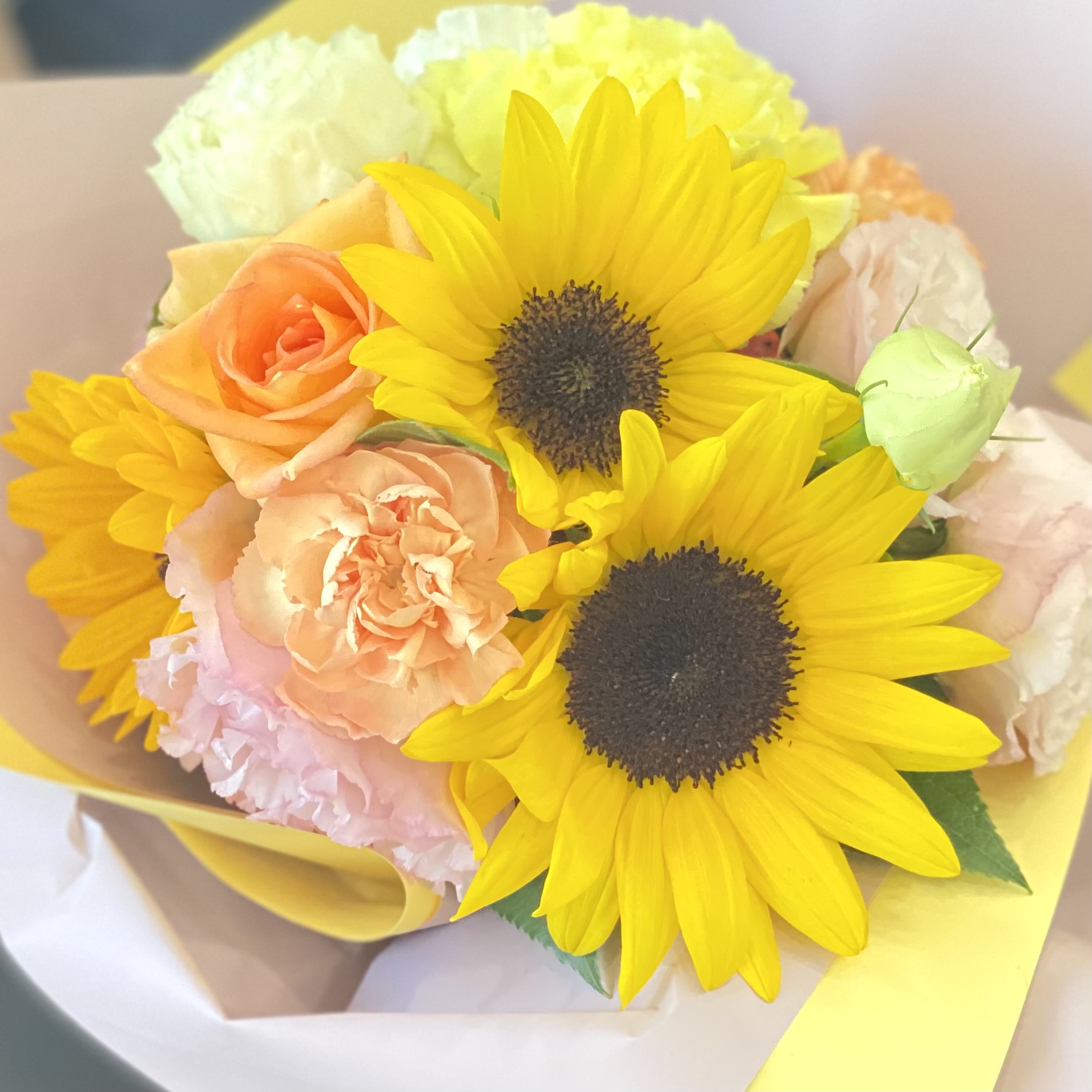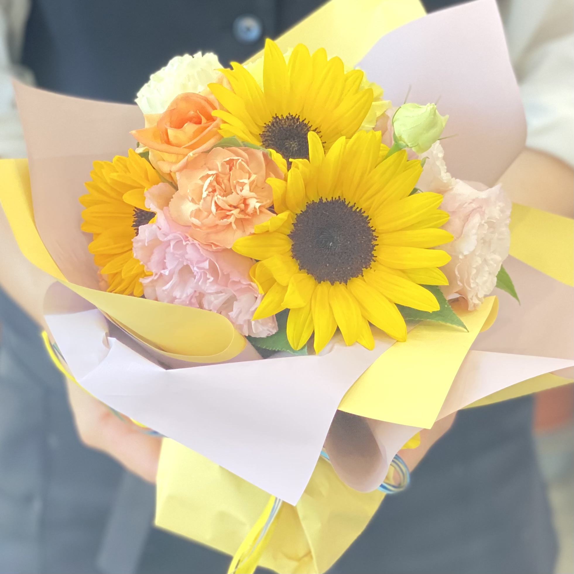 可愛らしいヒマワリを入れたそのまま飾れる花束。明るく優しい色合いで制作したします。この時期のさまざまな贈り物にオススメですよ。【15時迄のご注文で翌日届きます】※こちらの商品についてのご相談、ご質問等ございましたら(メール)または(お電話)にて承ります。