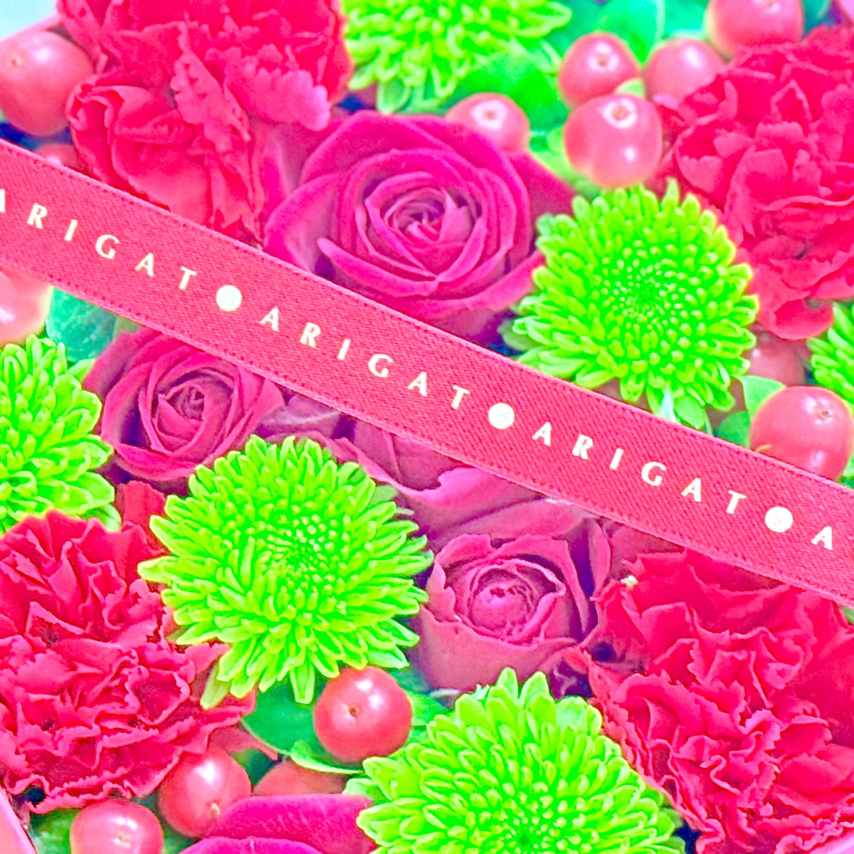 資材・ラッピング: デザインボックス(レッド)、ARIGATOリボン、吸水性スポンジ、フラワーケアカード(取扱説明書)