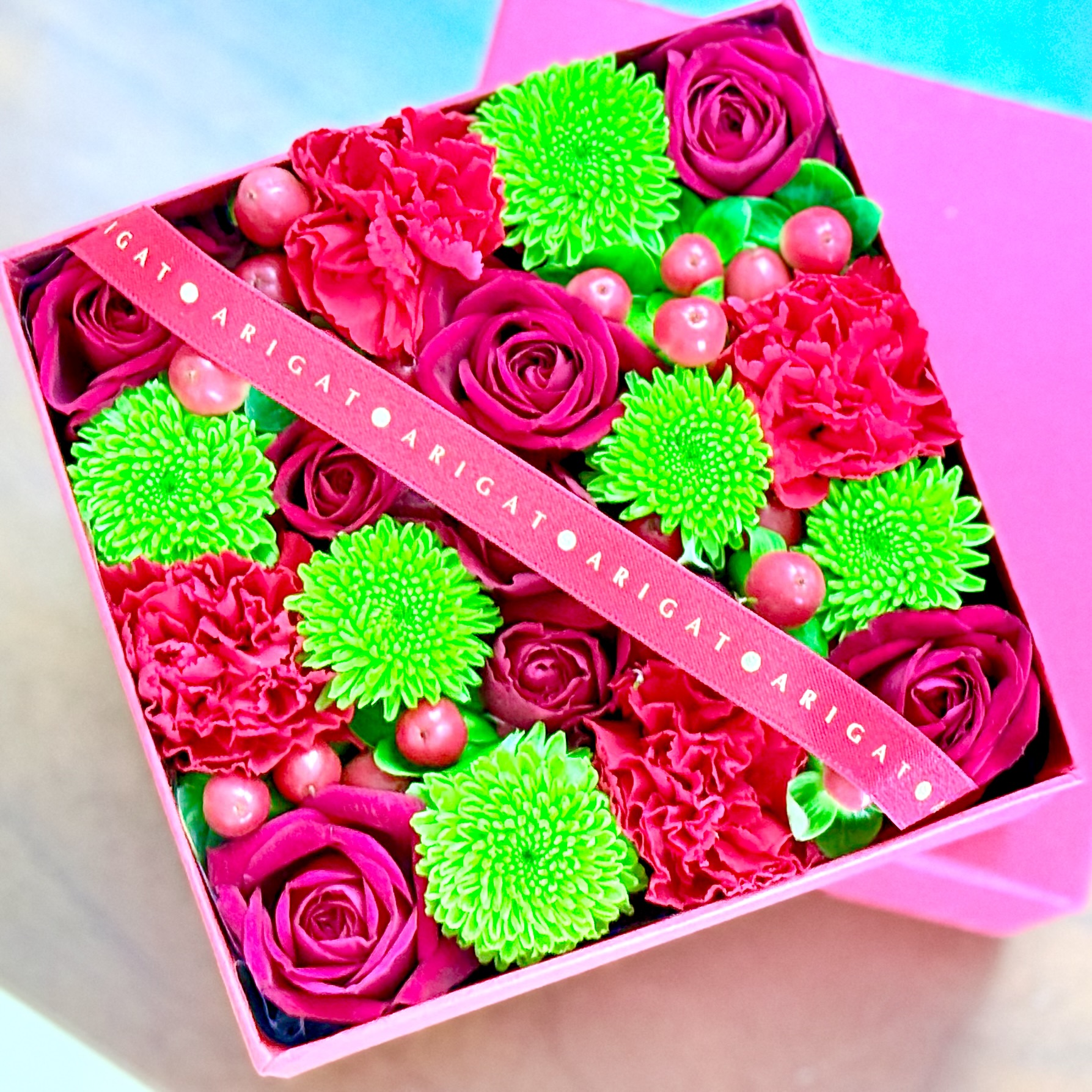 今、流行りのブライト―ン色のボックスフラワーです。いつもとは違ったサプライズ的な贈り物におすすめです。花ももちろん素敵ですが、鮮やかな色のボックスもカジュアルな雰囲気があって素敵ですよ。また、持ちの良いお花を中心に使っておりますので花持ちも良いでしょう。ご購入されたお客様から高い評価を頂いております。静岡県長泉町から日本全国【真心】込めてお届けいたします。さまざまなご用途に贈る贈り物としてオススメです。大切な方へ贈るフラワーギフトやプレゼントなら「花樹園オンラインドットコム」に是非、お任せ下さいませ。