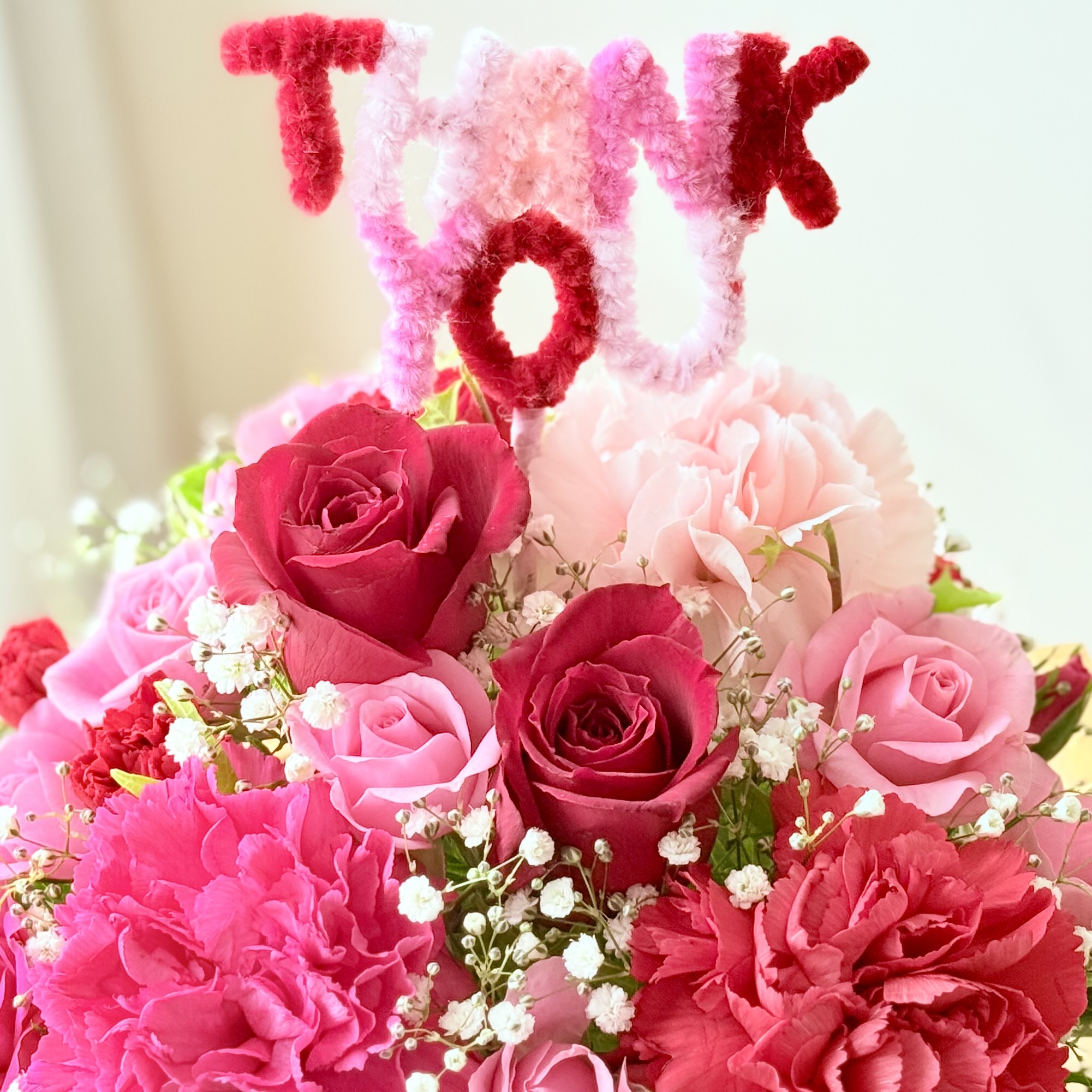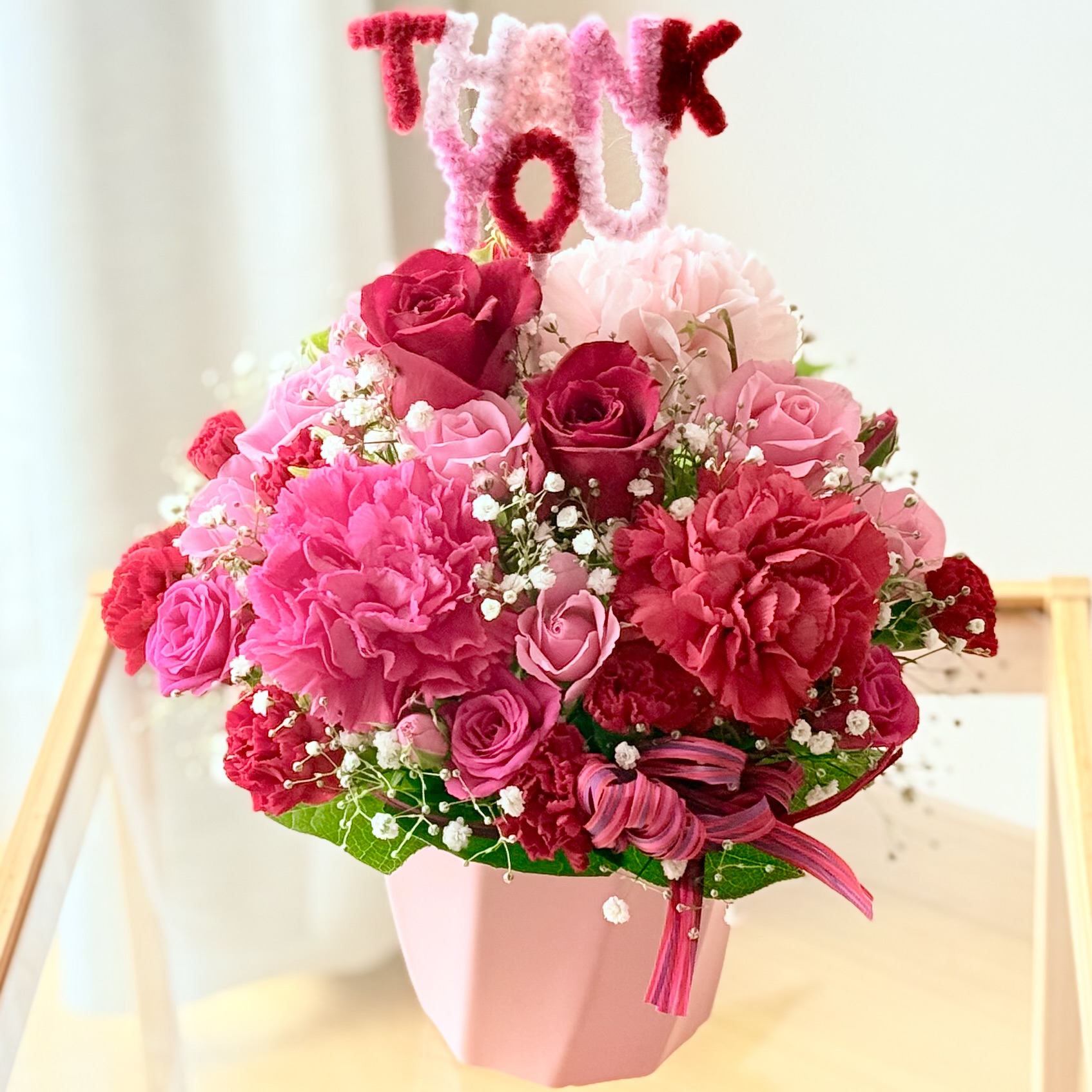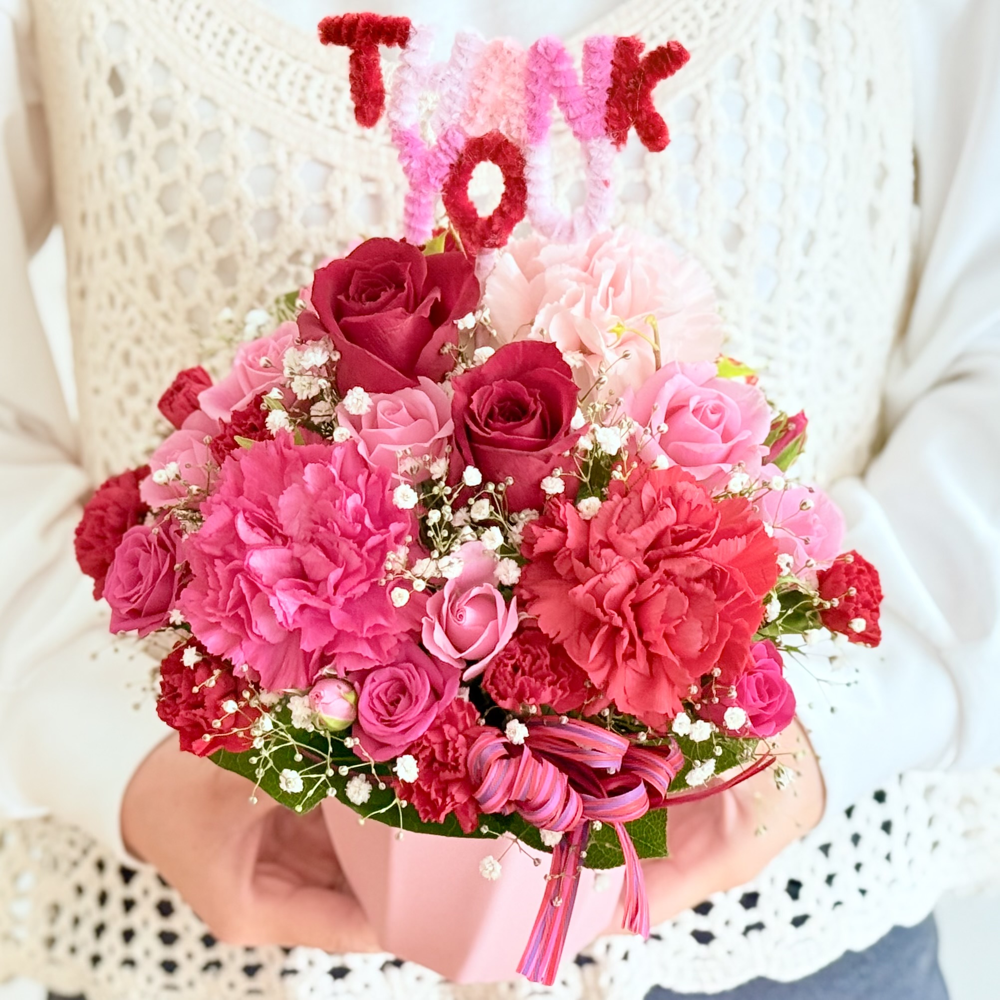 フェルトの素材の「THANK YOU」ピックが可愛らしい母の日アレンジメント。ピンク&レッド系のお花とあわせてエレガントな雰囲気が漂います。【15時迄のご注文で翌日届きます】※こちらの商品についてのご相談、ご質問等ございましたら(メール)または(お電話)にて承ります。