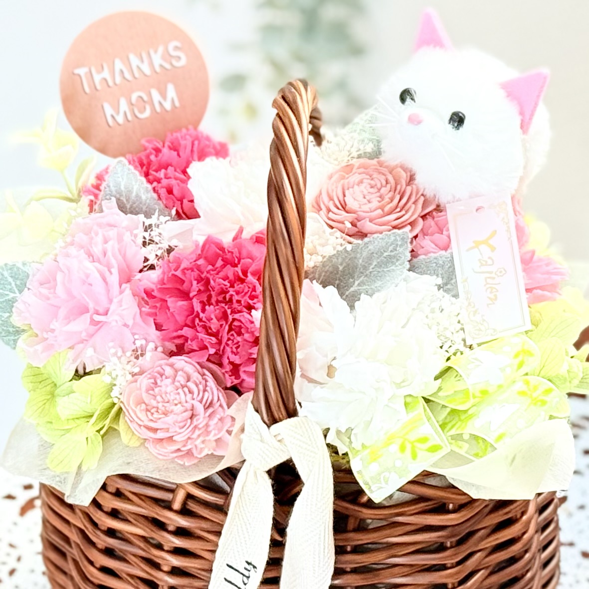 資材・ラッピング: PPラタンバスケット、「THANKS MAM」ピック、白猫マスコット、ドライフォーム、フラワーケアカード(取扱説明書)