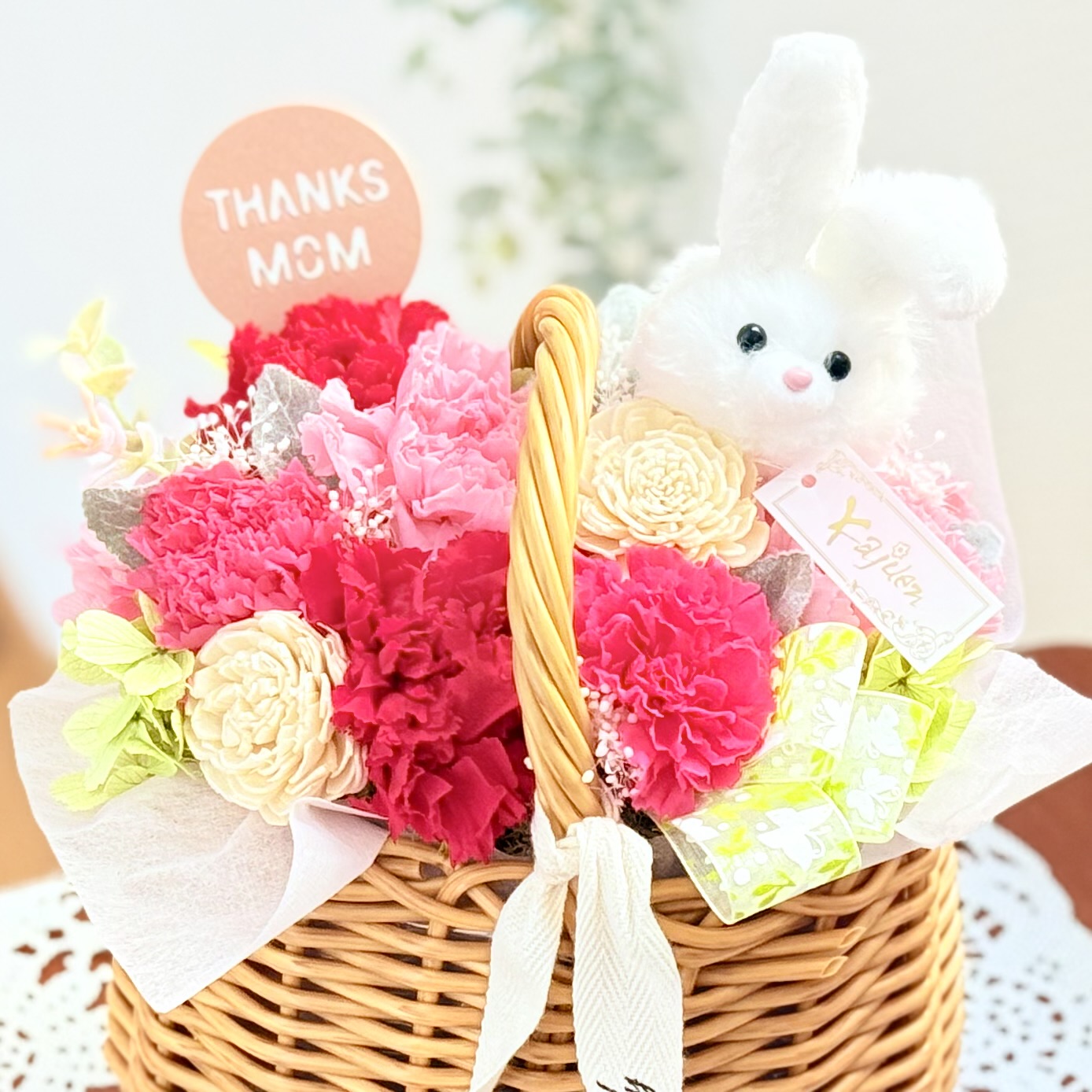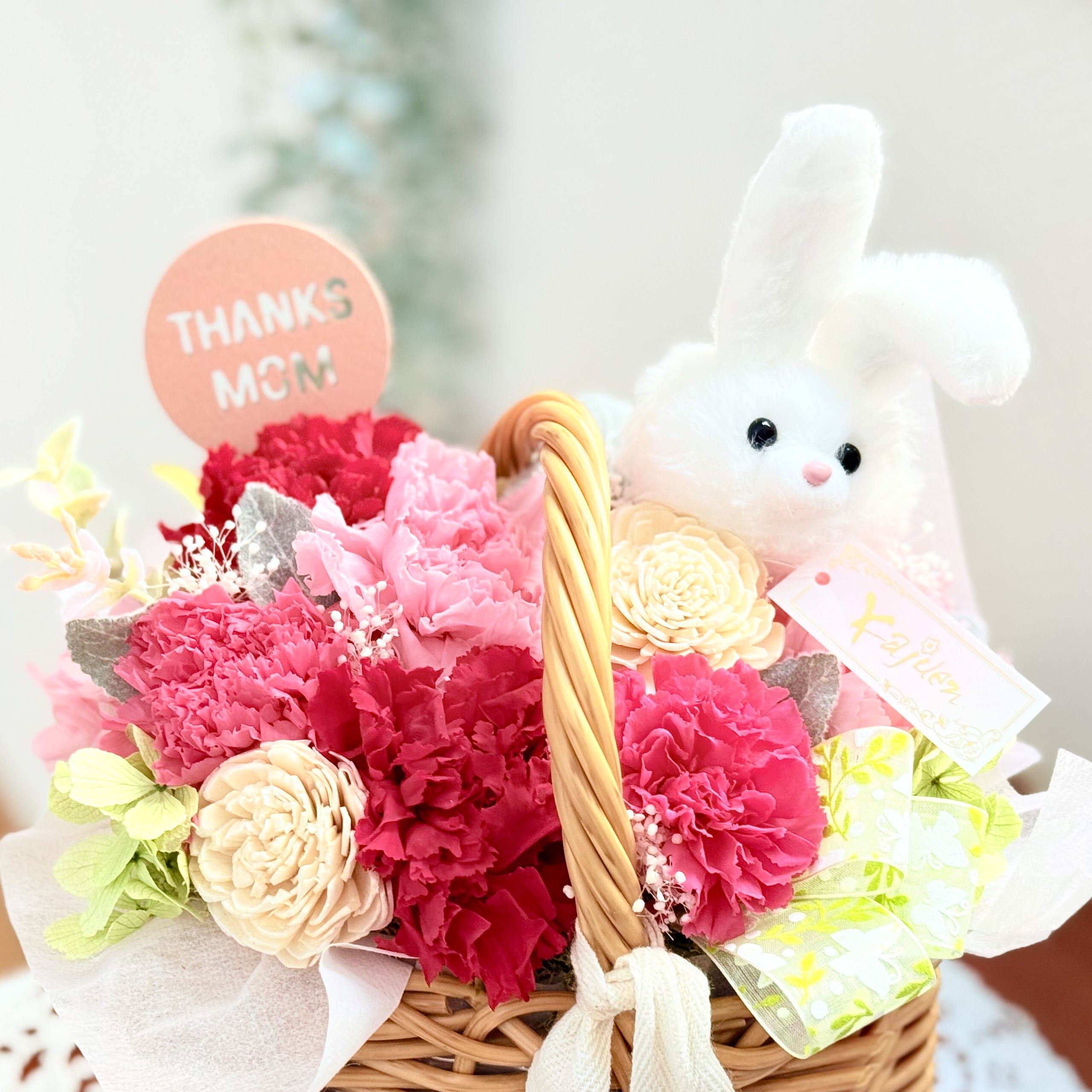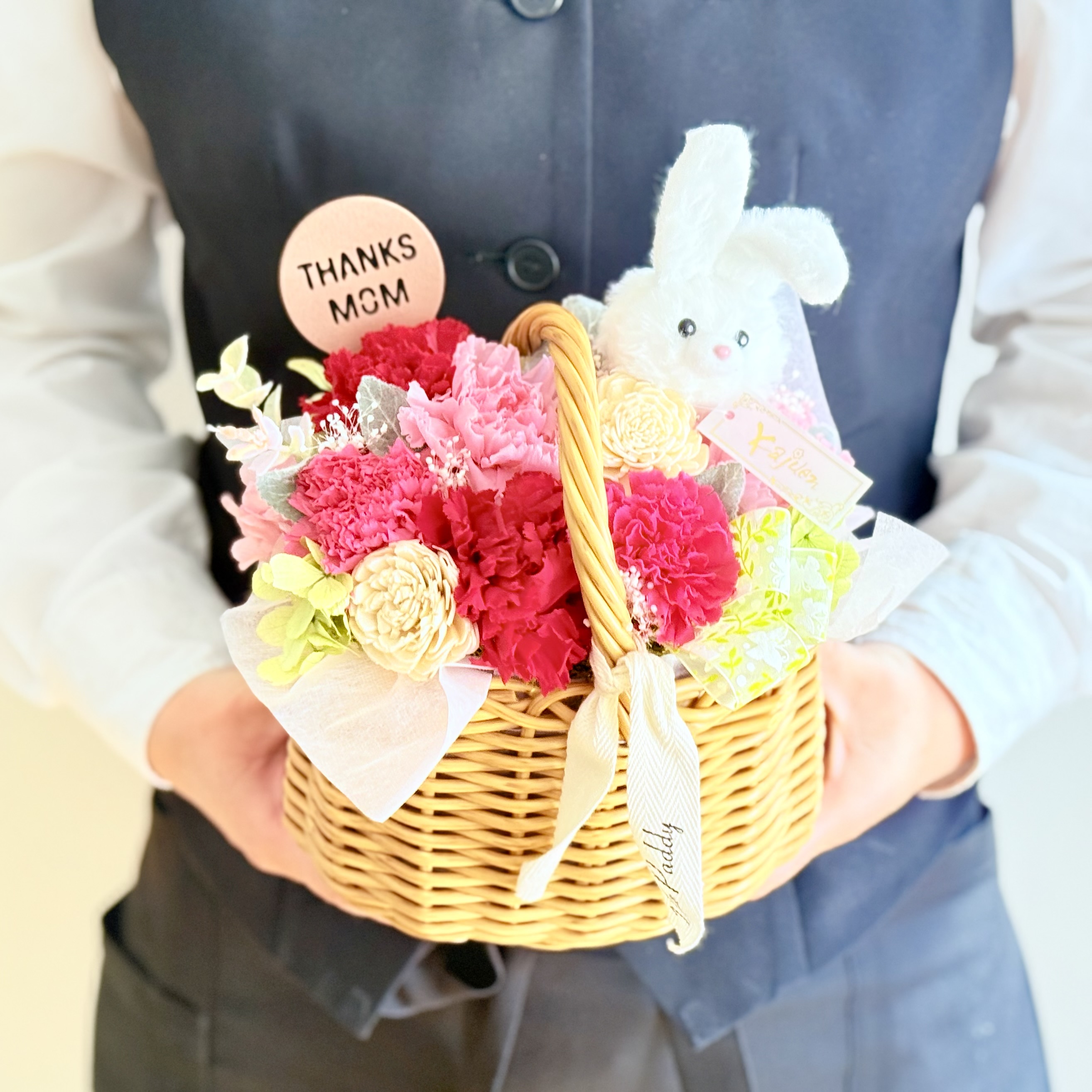 資材・ラッピング: PPラタンバスケット、「THANKS MAM」ピック、ウサギのマスコット、ドライフォーム、フラワーケアカード(取扱説明書)