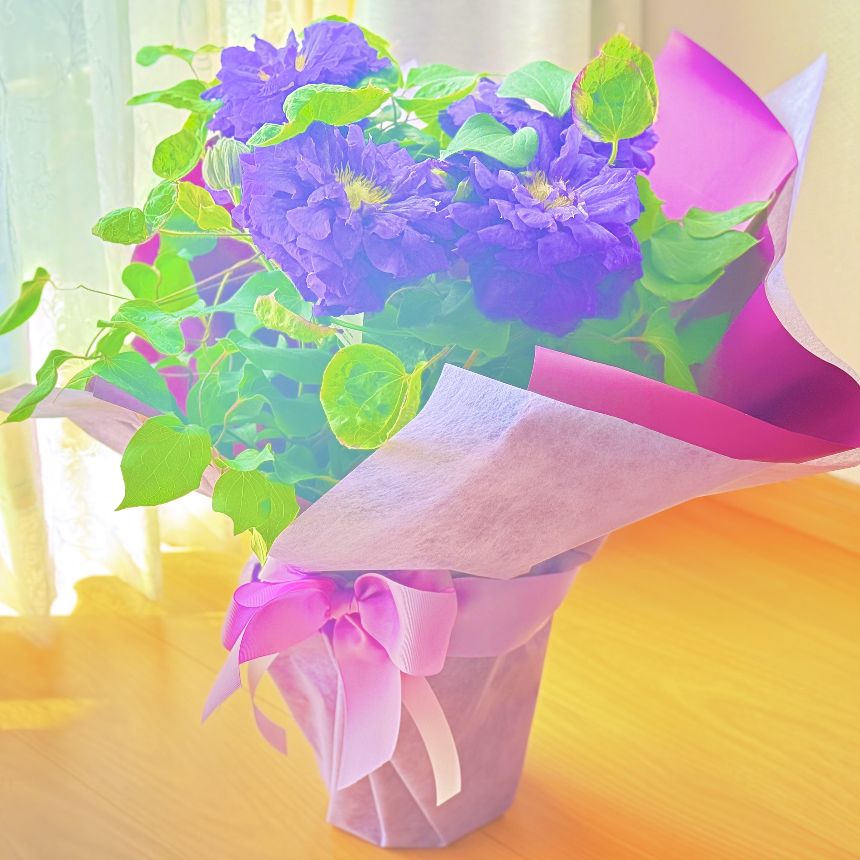 珍しい八重咲きの和風な雰囲気が印象的なクレマチスの花鉢です。生産地と生産者にこだわったとても品質の良いクレマチスです。ラッピングも明るく上品にお包み致します。また、とても花持ちも良く、暑さにも強い季節の贈り物です。貰って嬉しい贈り物でとても喜んでいたただけると思います。当店ではお客様の想い大切に【こころを込めて】お作りいたします。静岡県駿東郡長泉町から日本全国へお届けします。是非、想いを込めたフラワーギフトにいかがですか!?