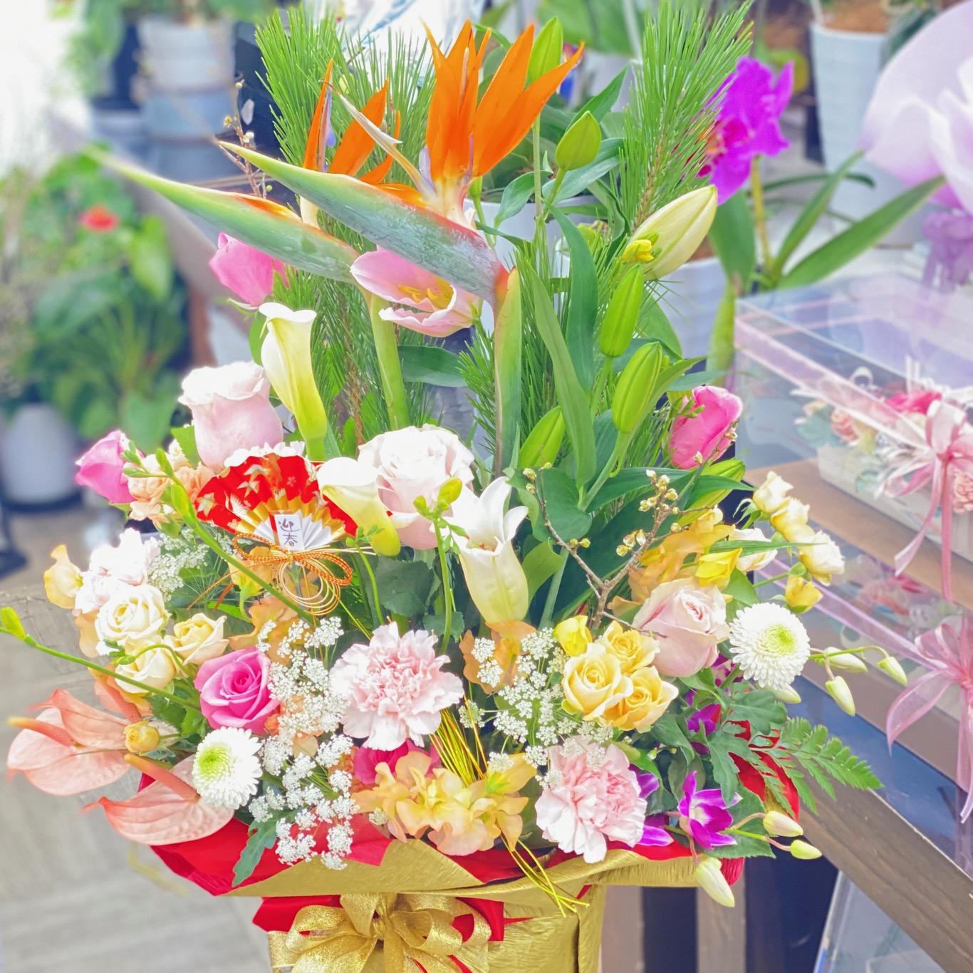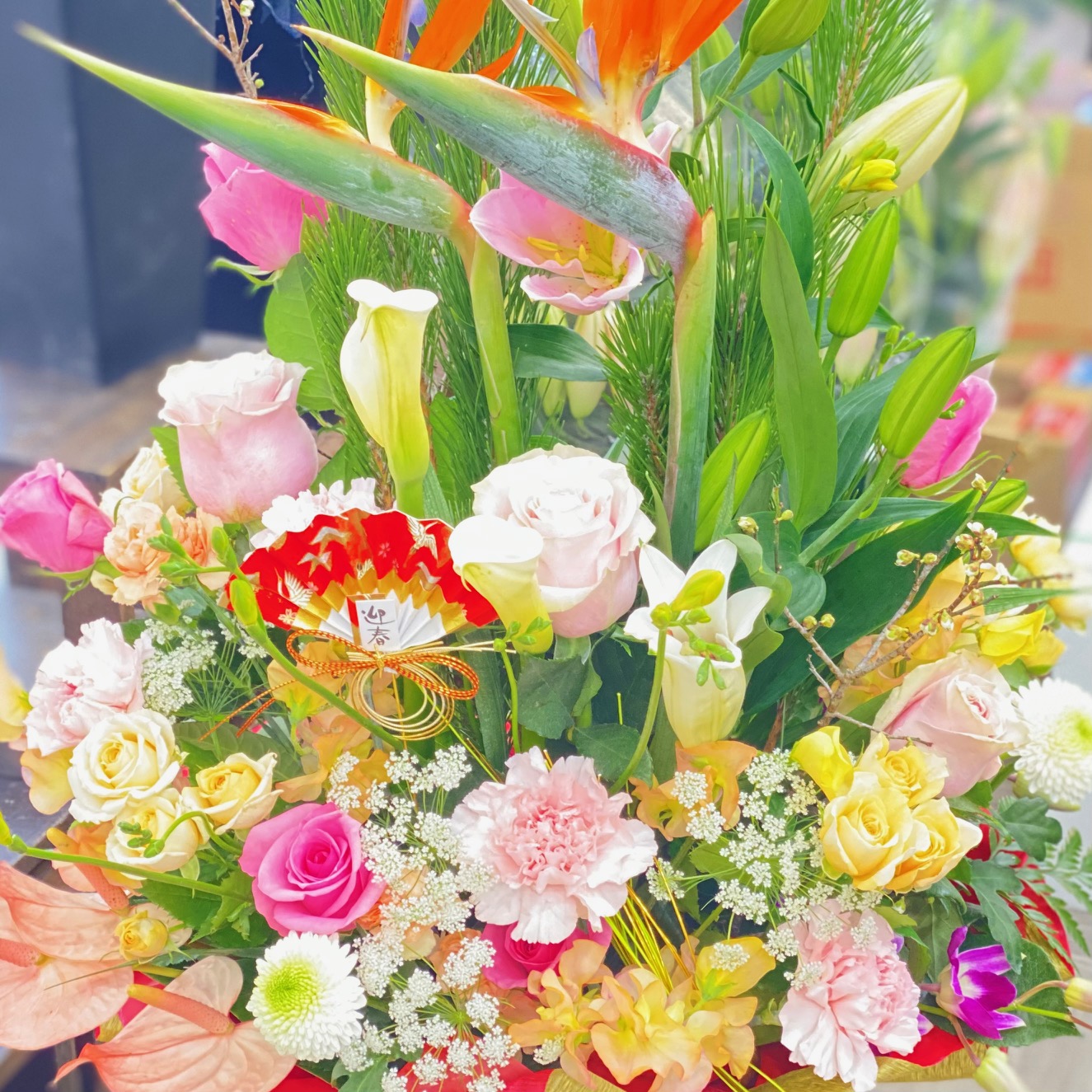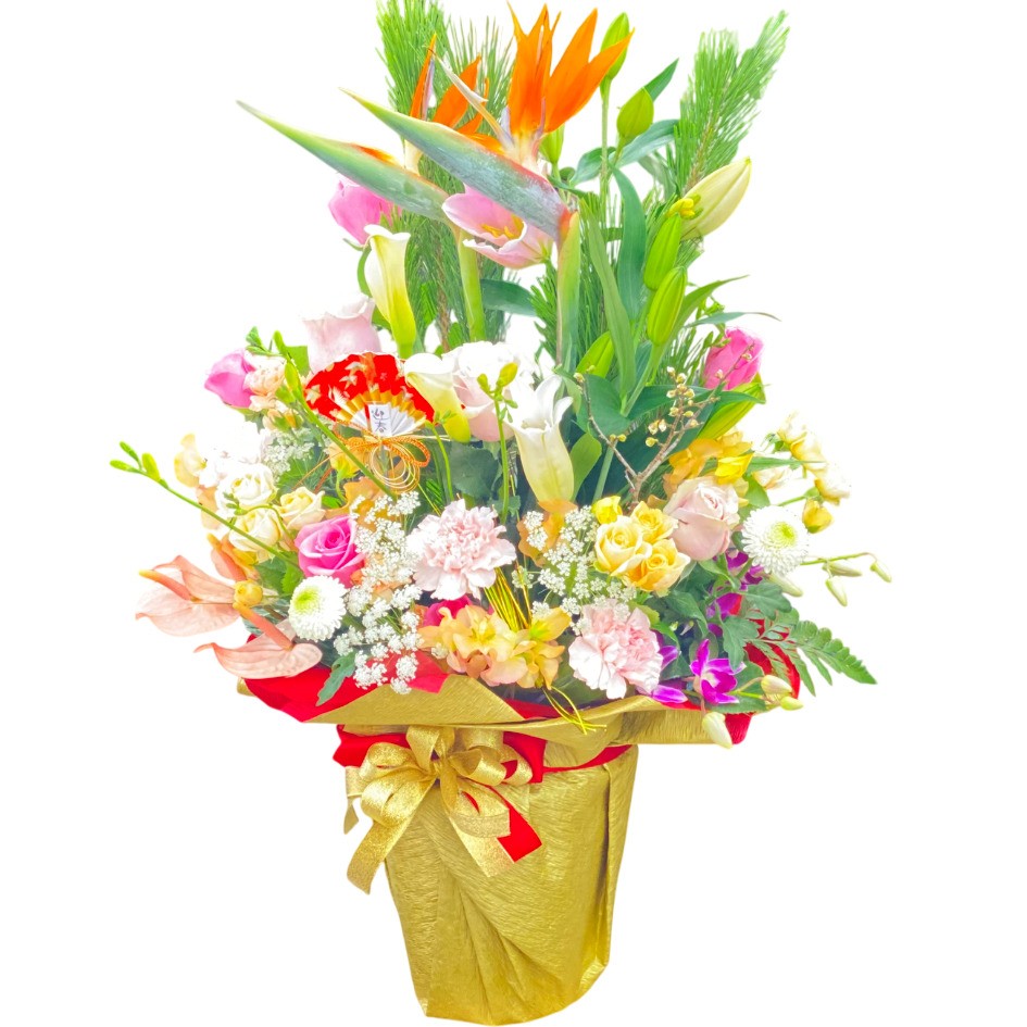 花材: メイン 松、千両、ストレチア(極楽鳥花)、マム、デンファレ、カーネーション、アンスリウムなど その他 季節のお花、葉物類など