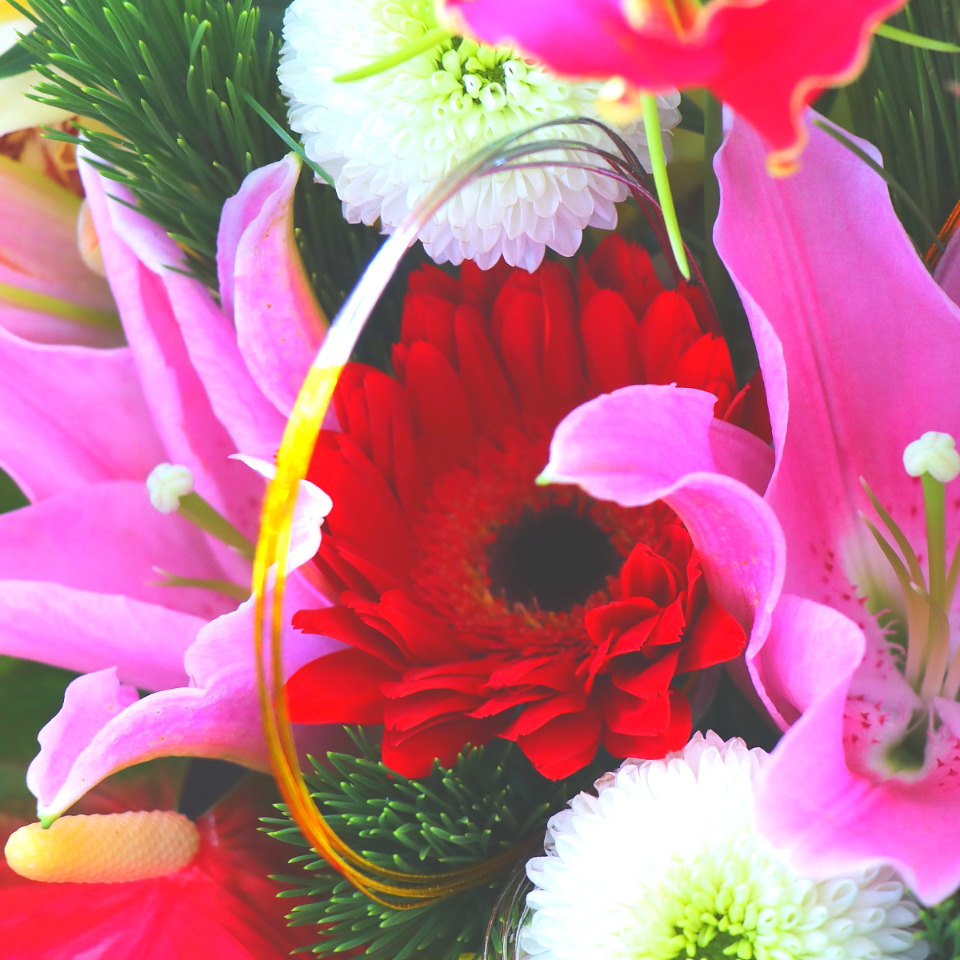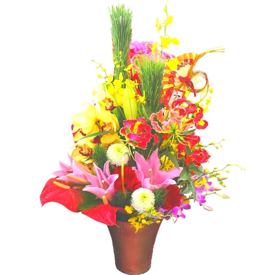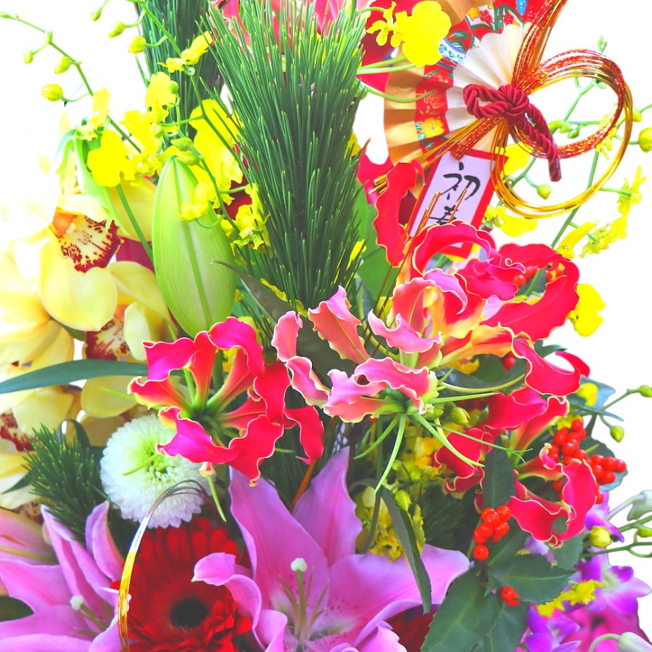 花材: メイン 松、千両、シンビジューム、ユリ、マム、デンファレ、オンシジューム、ガーベラ、グロリオサなど その他 季節のお花、葉物類など