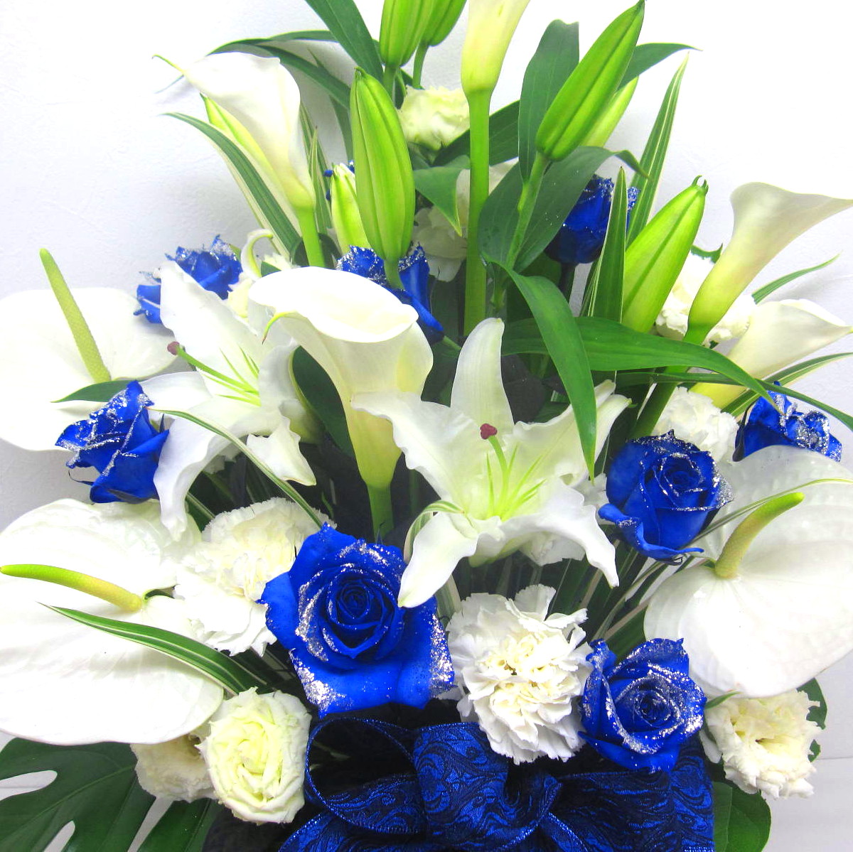 花材: メイン 青いバラ【オリジナル染色ラメ付】、ユリ、トルコギキョウ、アンスリューム その他 葉物類など