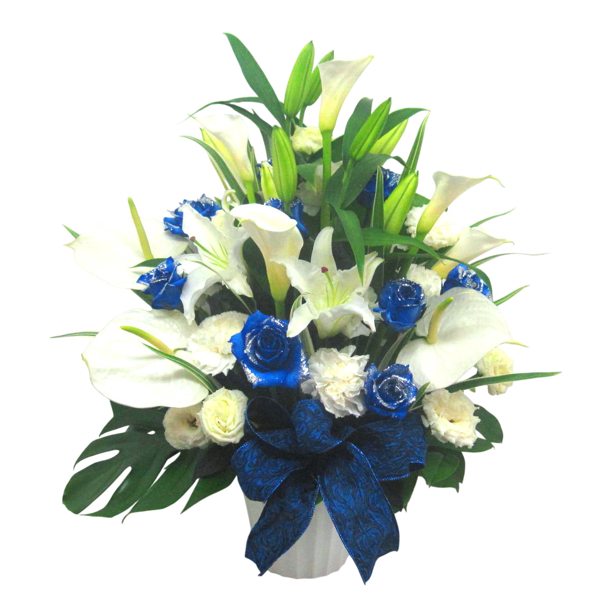 当店オリジナル染色の青いバラにキラキララメを付けたボリューム感のあるアレンジメントです。白&ブルー系の個性的で明るい色合いが大切な日をきっと彩ってくれますよ。また、ご利用されたお客様から「大変花持ちが良い」と好評をいただいております。静岡県長泉町から日本全国【真心】込めてお届けいたします。さまざまなシーンの贈り物としてオススメです。大切な方へ贈るフラワーギフトやプレゼントなら「花樹園オンラインドットコム」に是非、お任せ下さいませ。