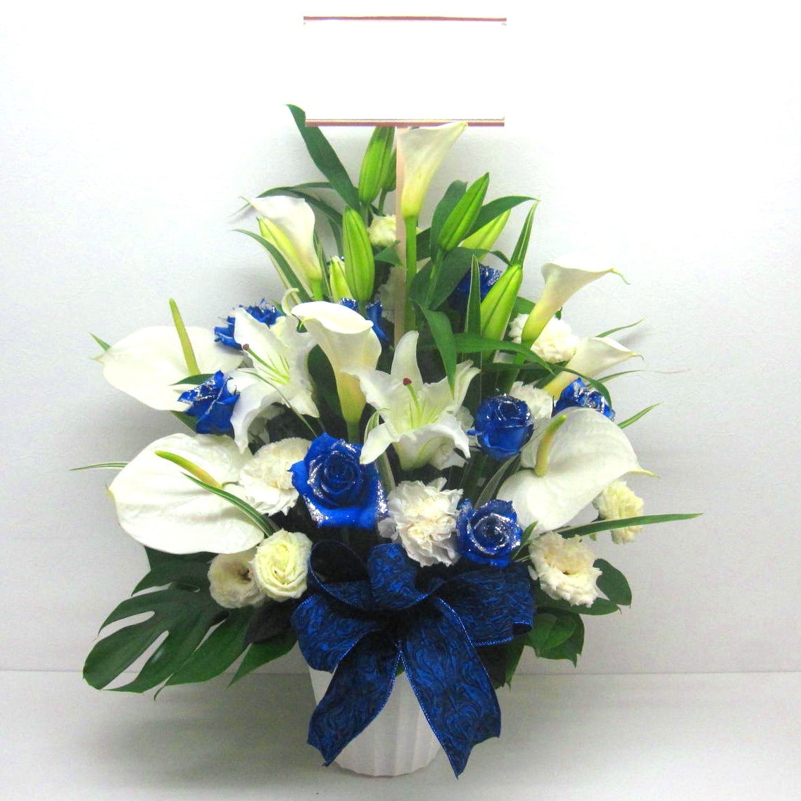 個性的でボリューム感のある素敵なアレンジメント。白&ブルー系の色合いで華やかな雰囲気ですよ。さまざまなシーンのプレゼントにおすすめです。【15時迄のご注文で翌日届きます】※こちらの商品についてのご相談、ご質問等ございましたら(メール)または(お電話)にて承ります。