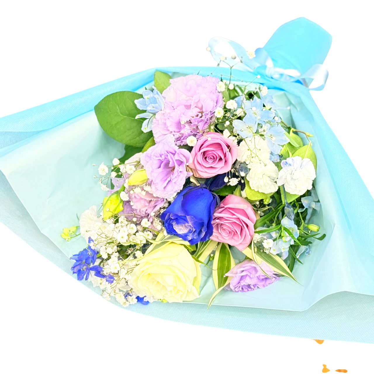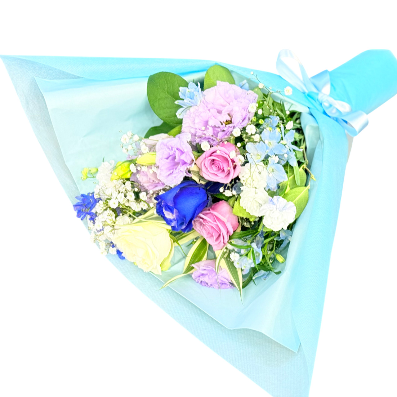 とっても素敵な水色のラッピングを施した花束です。ブルー&パープル系のお花でをメインにまとめてお作りします。きっと喜ぶこと間違いありません!持ちの良い花材を使っておりますので花持ちも良いでしょう。ご購入されたお客様から高い評価を頂いております。静岡県長泉町から日本全国【真心】込めてお届けいたします。さまざまなご用途に贈る贈り物としてオススメです。大切な方へ贈るフラワーギフトやプレゼントなら「花樹園オンラインドットコム」に是非、お任せ下さいませ。