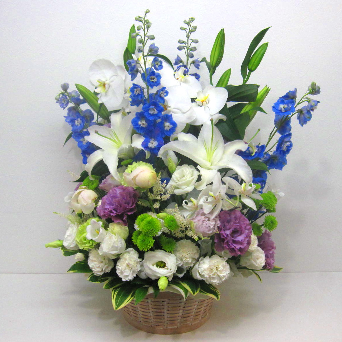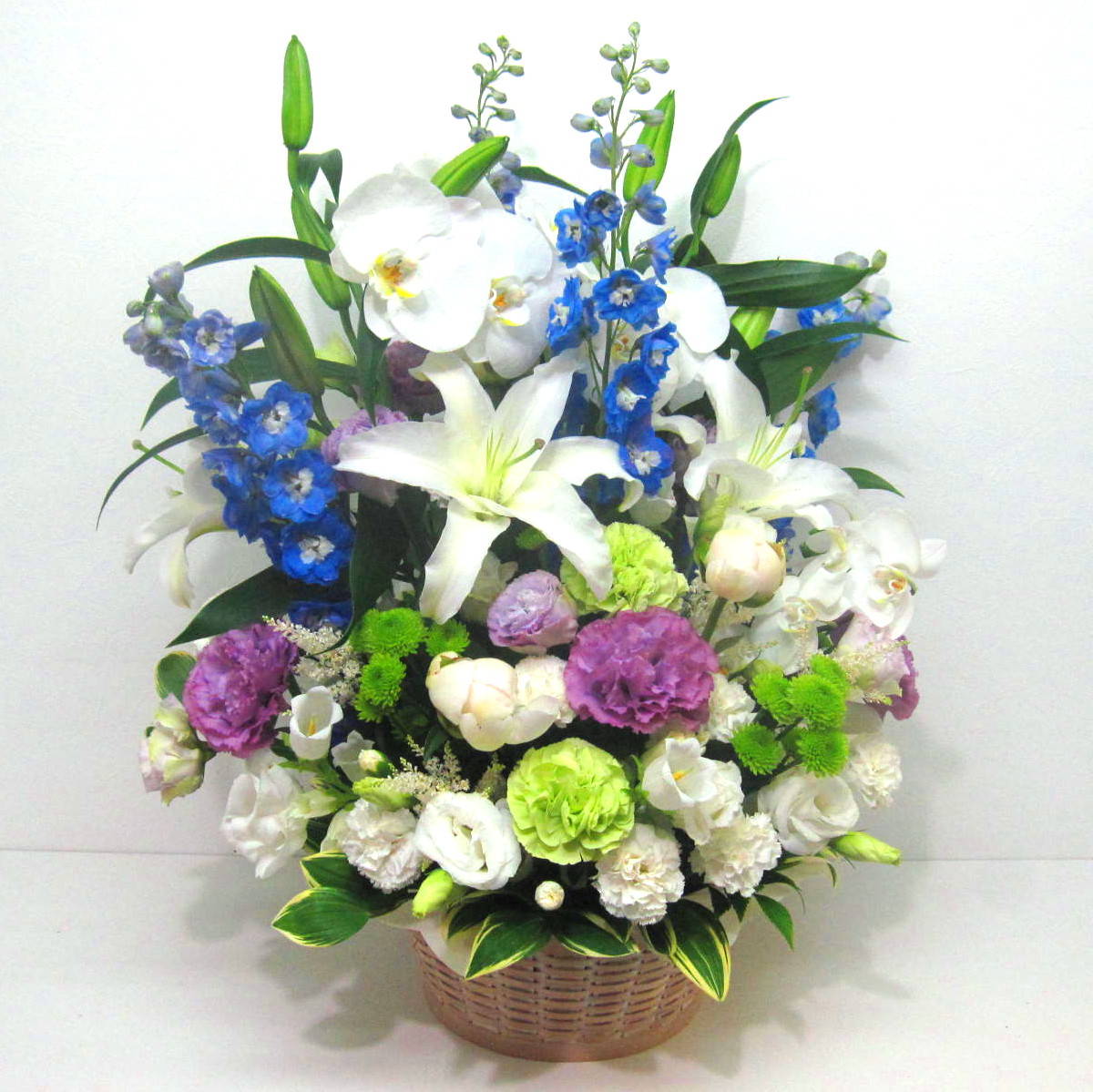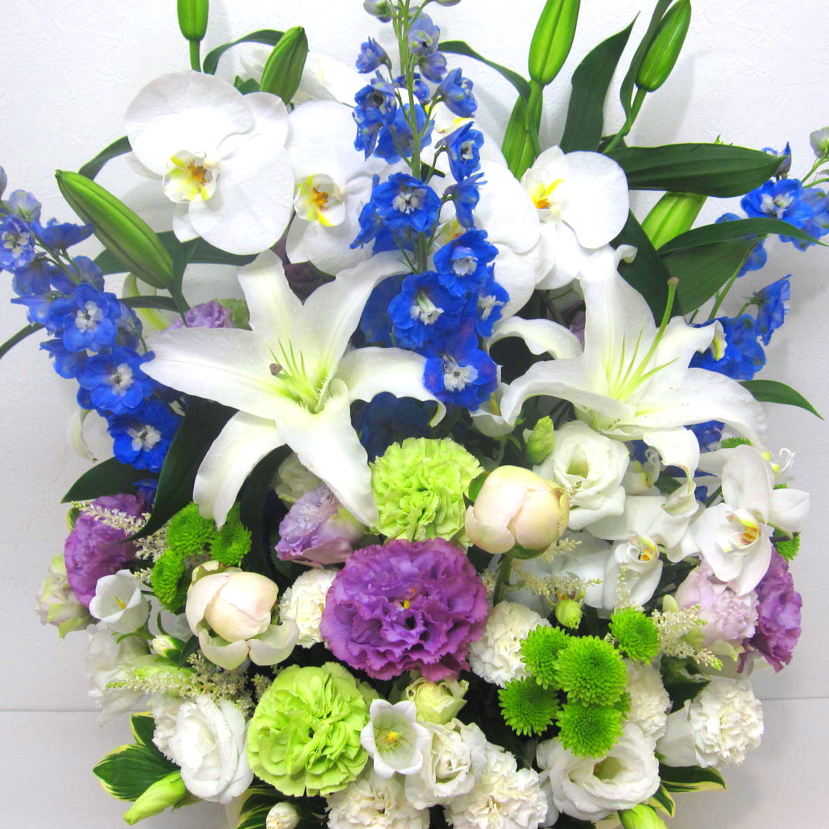 花材: メイン コチョウラン、ユリ、カーネーション、トルコギキョウ、デルフィニュームなど その他 季節のお花、葉物類など